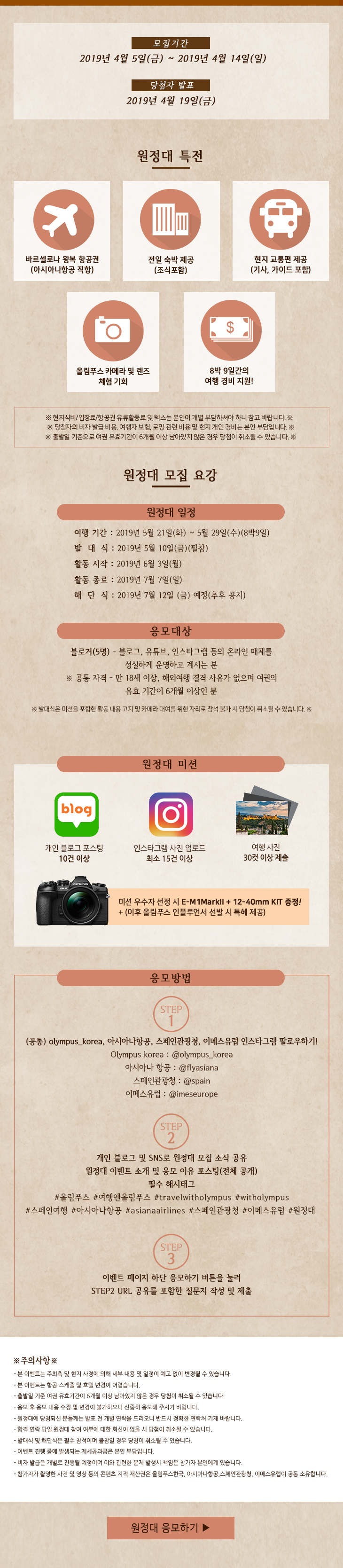 선정된 원정대는 8박 9일간 스페인 바르셀로나를 여행하며 지중해의 낭만, 풍요로운 음식, 가우디의 건축물, 피카소 등 거장들의 발자취 등을 경험하게 됩니다. 왕복 항공권과 숙박, 교통편은 물론 추억을 담을 카메라 역시 올림푸스의 최신 미러리스 카메라로 체험할 기회가 주어진다고 합니다.