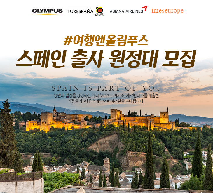 올림푸스한국에서 사진과 여행을 사랑하는 이들을 위한 멋진 이벤트 소식을 알려왔습니다. 정열과 낭만의 나라 스페인을 여행하며 추억을 만들 수 있는 출사 원정대 모집 이벤트입니다. #여행엔올림푸스 라는 슬로건으로 오랫동안 여행에 좋은 미러리스 카메라 제품들을 발표하고 있고 이런 해외 출사 이벤트도 활발히 진행하고 있는데, 이번 목적지는 스페인이라 많은 분들을 가슴 설레게 할 것 같아요.
