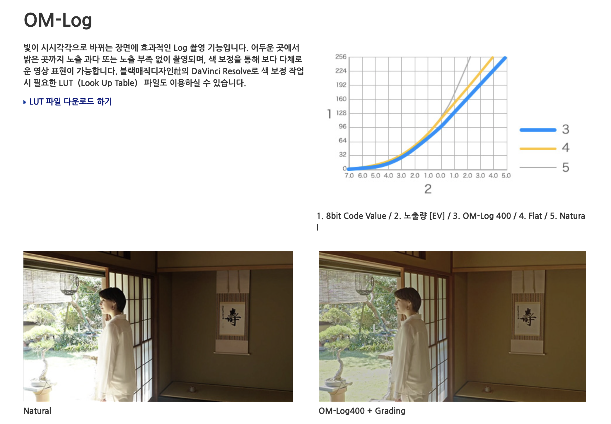 아래는 OM-LOG의 효과, 일반 촬영과의 차이점을 소개한 영상입니다.