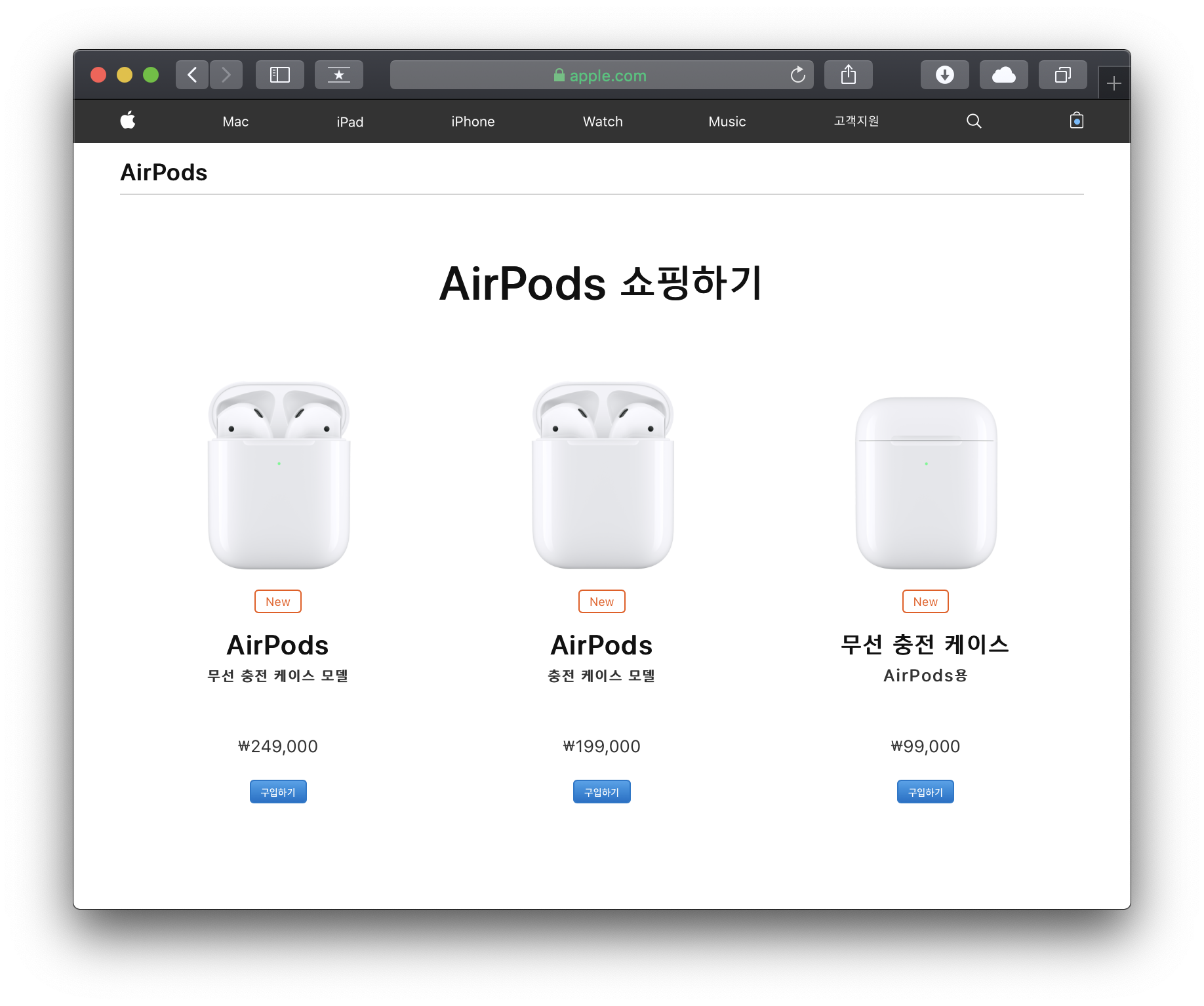 제가 구매한 에어팟은 충전 케이스 모델입니다. 흔히 무선 충전/유선 충전 모델로 구분되죠. 에어팟 2세대는 두 가지 모델로 출시됐는데, 유닛은 동일하며 충전 케이스의 무선 충전 여부로 나뉩니다. 신제품 출시와 함께 기존 제품의 가격을 인하했던 기존 정책과 달리 에어팟 1세대는 단종처리됐습니다.