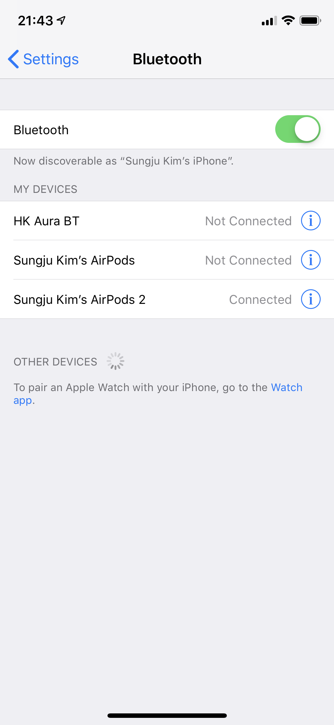 연결이 완료되면 아이클라우드를 통해 같은 계정이 등록된 아이폰, 아이패드, 맥 제품에 에어팟의 연결 정보가 동기화됩니다. 애플 생태계에서 에어팟이 다른 블루투스 이어폰보다 갖는 대단한 강점입니다. 기기간 전환이 빠르고 매끄럽거든요. 게다가 그 전환 속도가 1세대보다 배 이상 빨라졌다는 직원에 말에 넘어갈 수밖에 없었습니다.