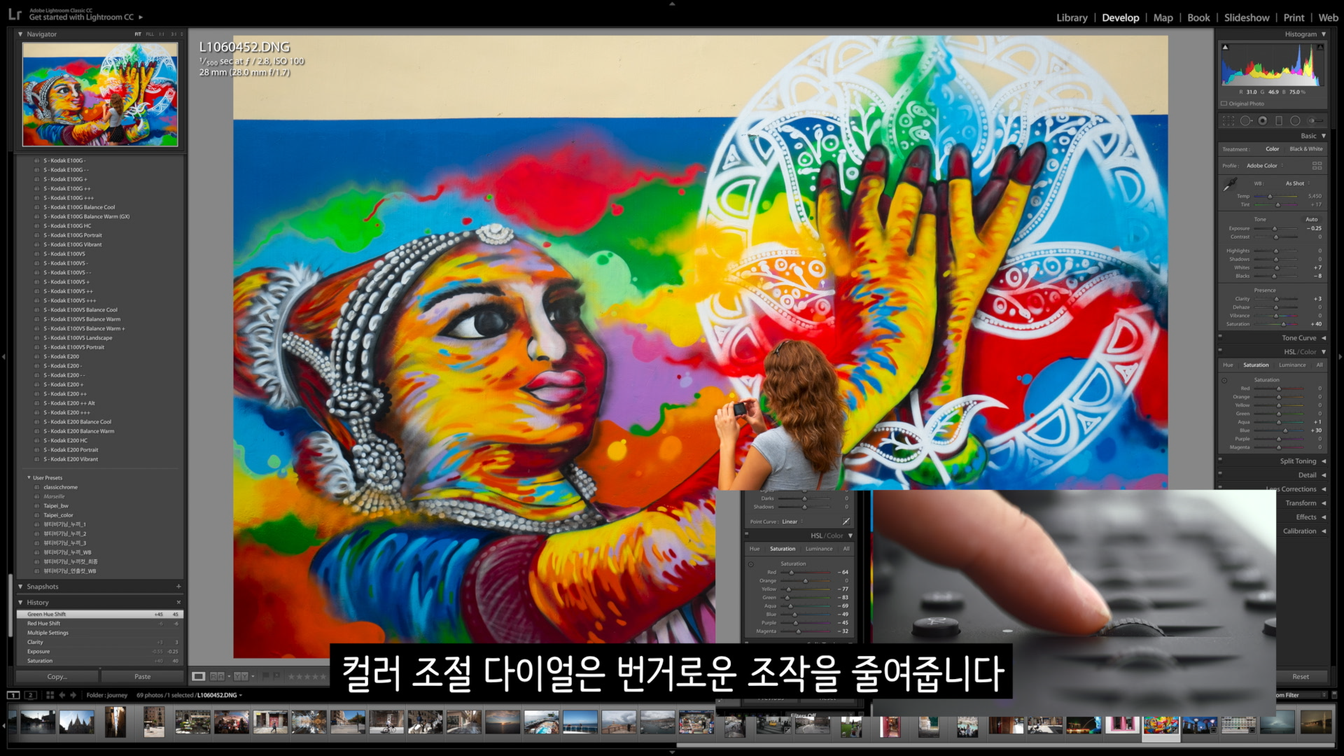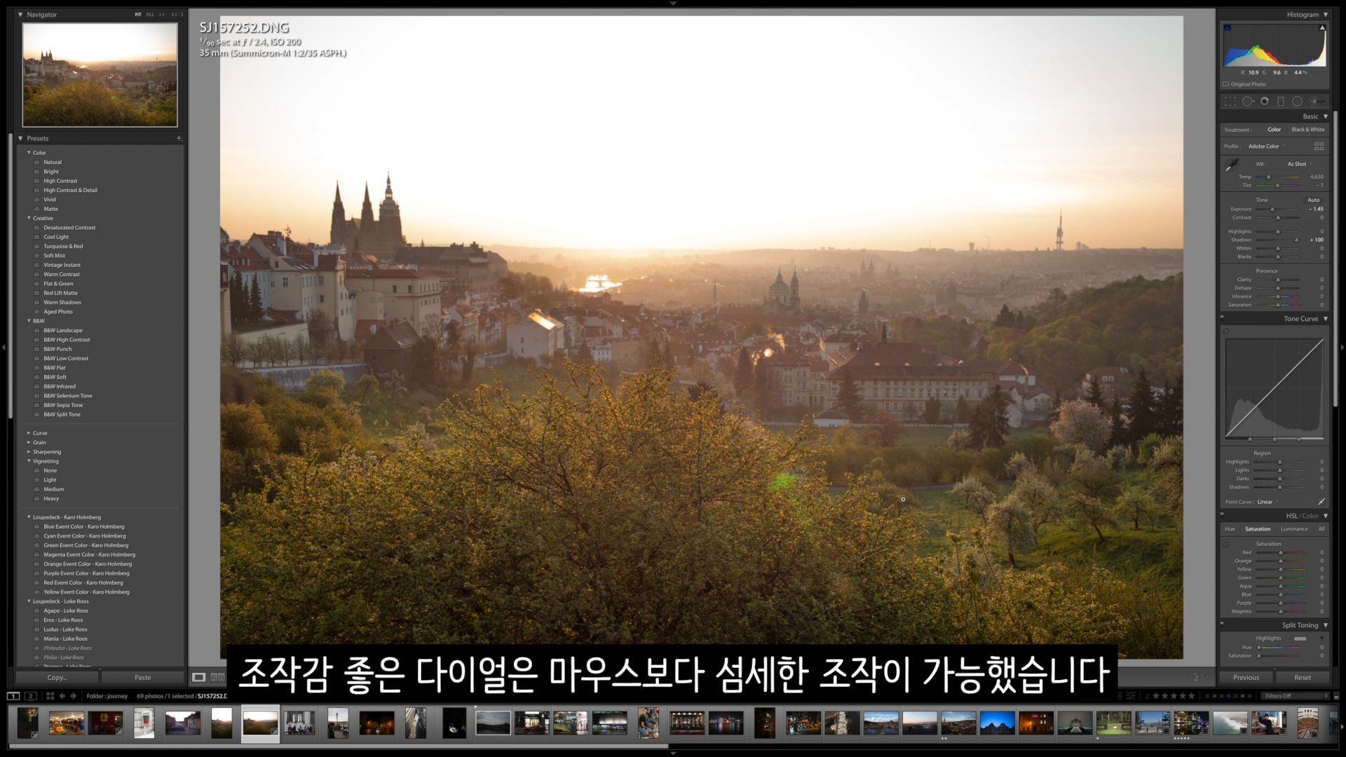 영상을 촬영하며 가장 마음에 들었던 것은 각 색상값을 담당하는 다이얼이었습니다. 이것이 수가 많고 그만큼 손도 많이 가서 보정할 때 시간과 노력이 많이 소요됐는데 루프덱 플러스로 작업하며 크게 빨라지고 편해졌습니다. 여러 컬러 값을 한 번에 조절할 수도 있으니 마우스에 비해 월등하죠. 색조와 채도, 광도는 왼쪽에 있는 버튼을 통해 전환할 수 있습니다. 여기서 루프덱 플러스가 라이트룸 사용자를 많이 고려했다는 것을 느낄 수 있었습니다.