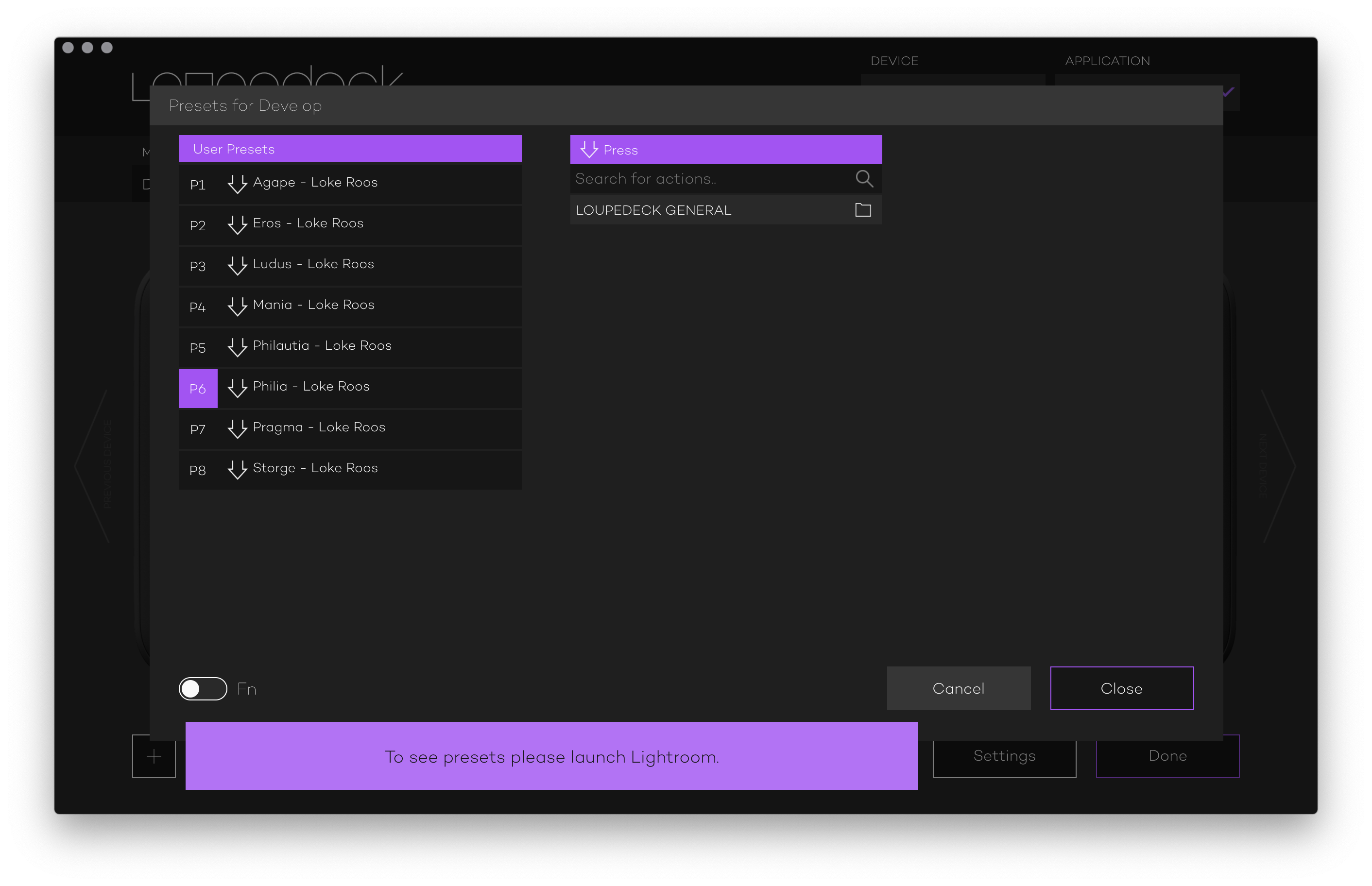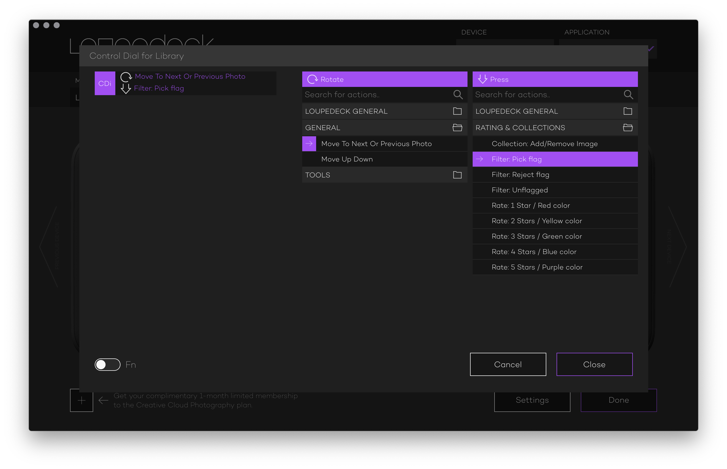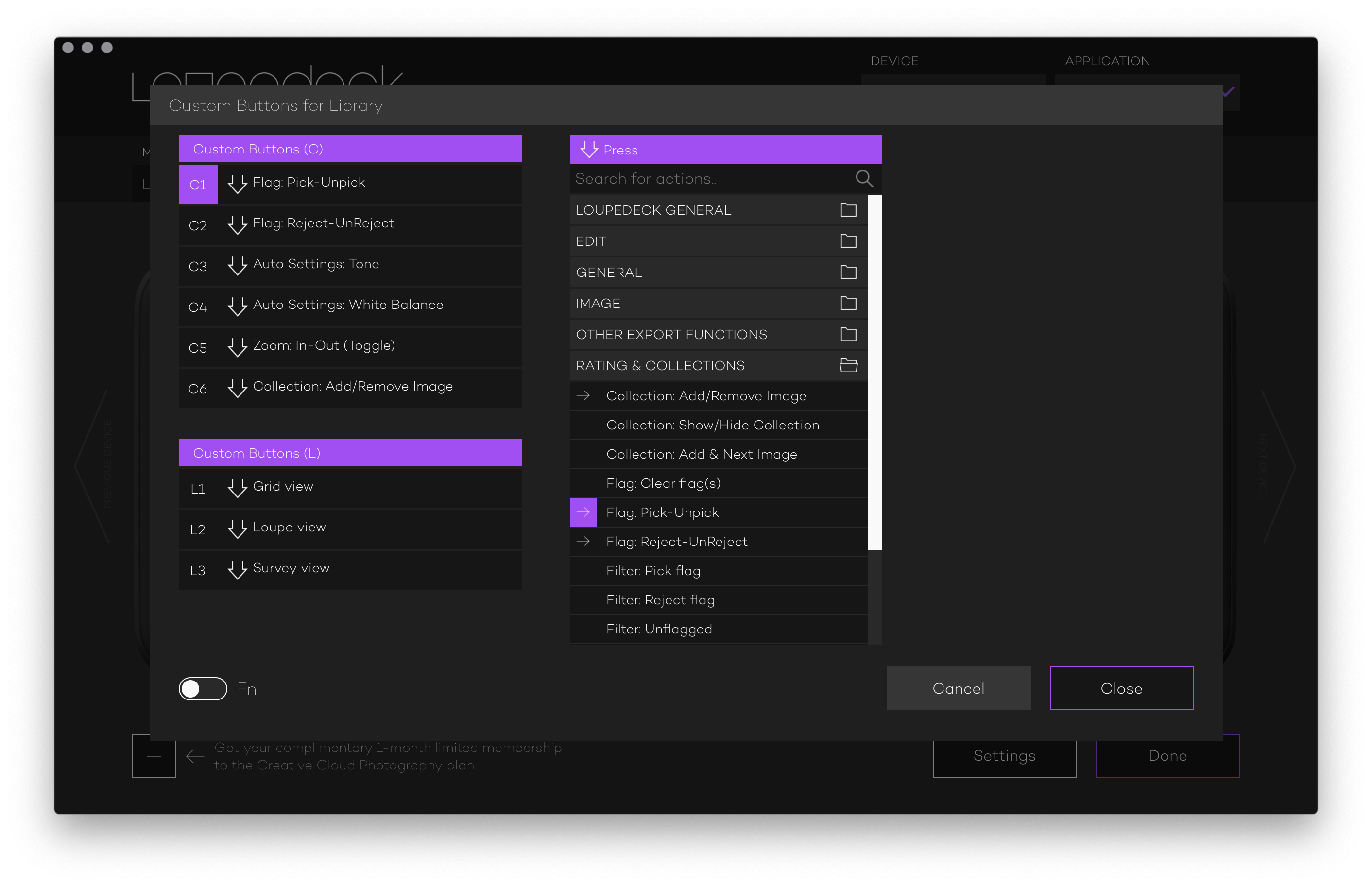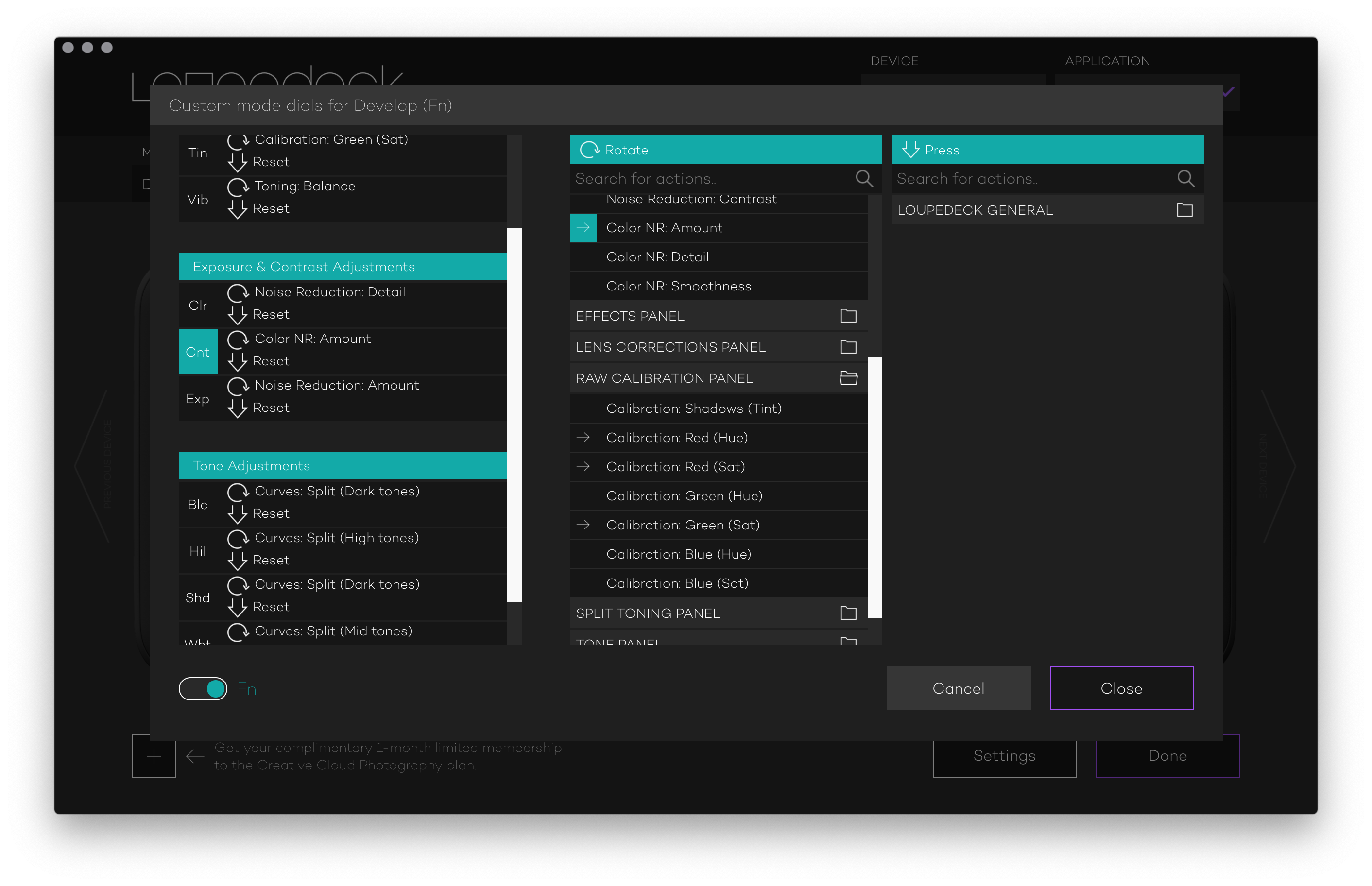 다양한 사용자화 버튼과 함께 Fn 버튼도 마련돼 있습니다. 다른 버튼과 달리 Fn 버튼은 단독으로 사용되지 않고 다른 버튼과 함께 눌렀을 때 별도의 동작을 실행하도록 합니다. 하나의 버튼 또는 다이얼을 두 개처럼 사용하는 것이죠. 자주 사용하지 않지만 종종 필요한 기능들을 할당해 놓으면 유용합니다. 루프덱2 프로그램의 설정 화면에서 하단 Fn 버튼을 활성화 해 지정할 수 있습니다.