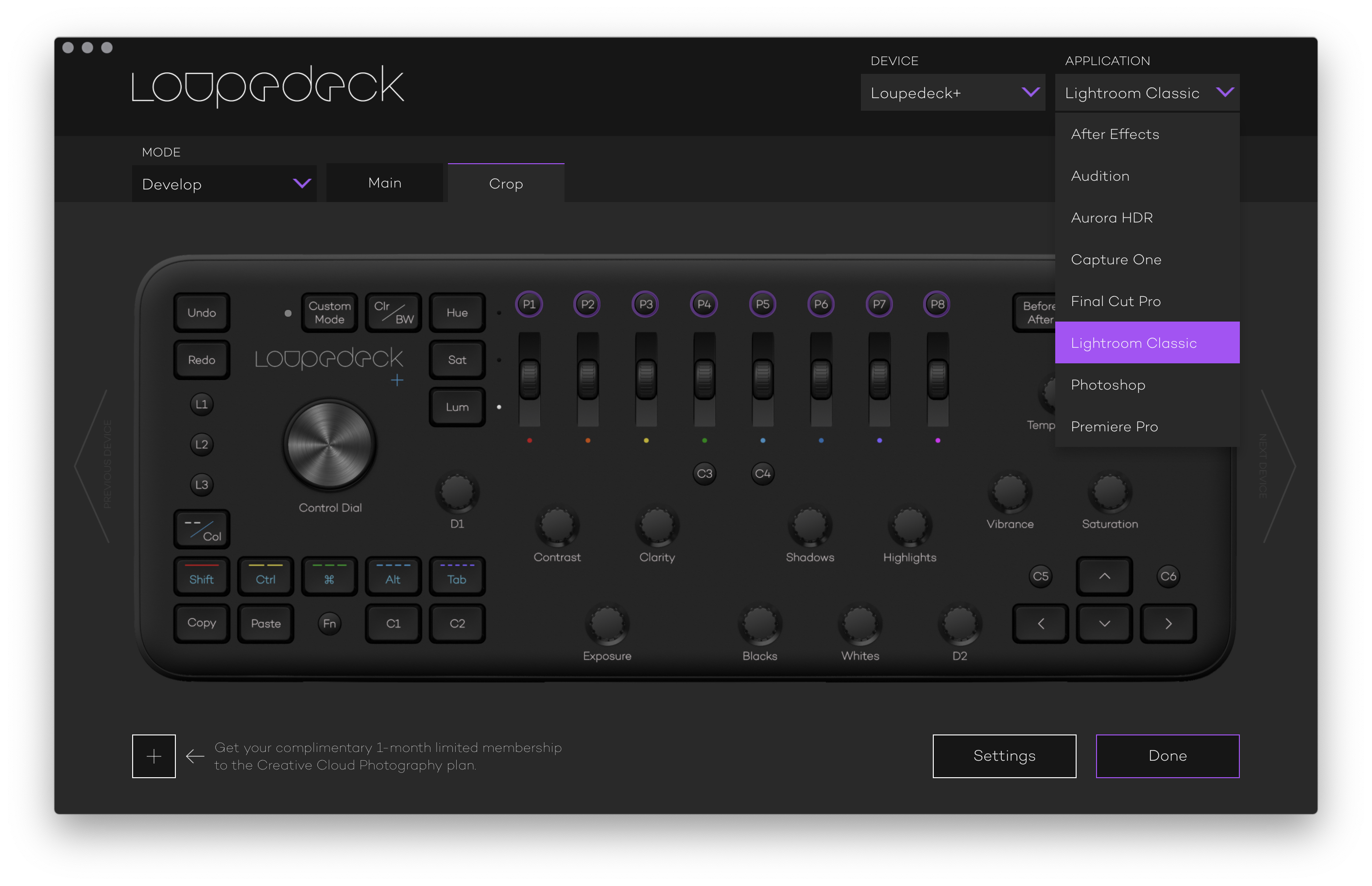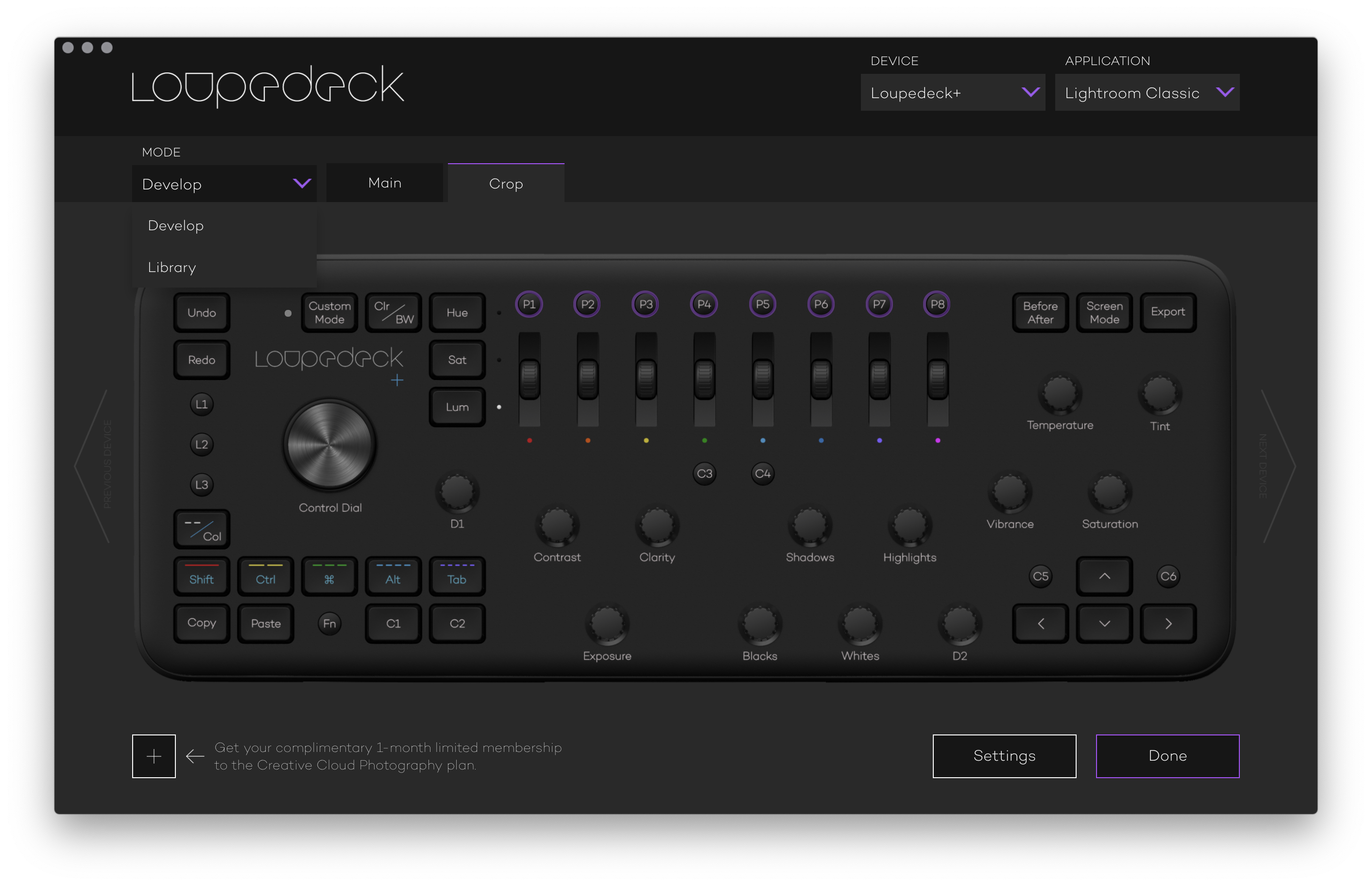 라이트룸 클래식 CC를 기준으로 설명하면, 라이브러리와 현상 두 가지 모드에서 루프덱 플러스의 버튼과 다이얼을 이용할 수 있습니다. 동일한 버튼을 데이터 관리/편집 모드에 따라 다르게 활용할 수 있는 점이 작업 효율에 있어서는 장점이겠죠. 현상 모드에서는 일반 조작과 함께 이미지 크롭 작업에서 P 버튼을 단축 버튼으로 사용할 수 있도록 별도의 탭을 마련해 놓았습니다.