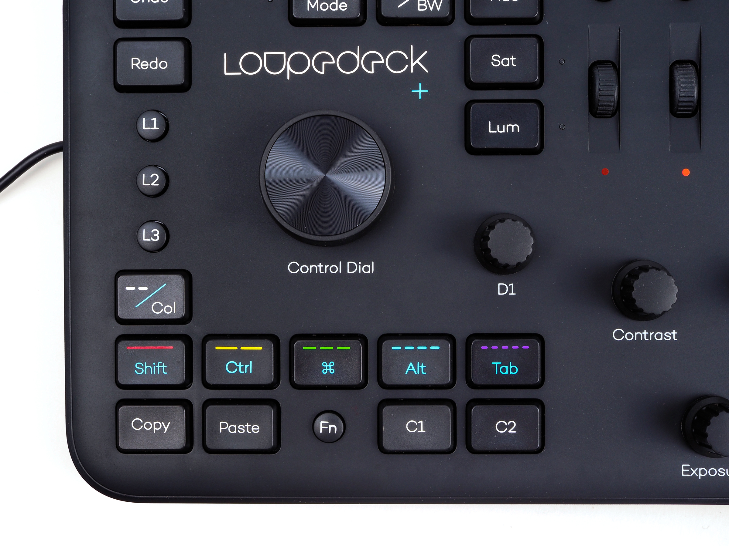 루프덱 플러스의 버튼과 다이얼은 라이트룸 조작에 최적화되어 있습니다. 버튼과 다이얼에 인쇄된 글자들이 라이트룸의 이미지 보정 옵션을 나타내는 것이거든요. 포토샵과 파이널 컷 프로 X 등 다른 프로그램을 사용할 때도 각 기능들이 할당돼있지만 라이트룸 조작에 초점을 두고 설계됐다는 것을 알 수 있습니다.