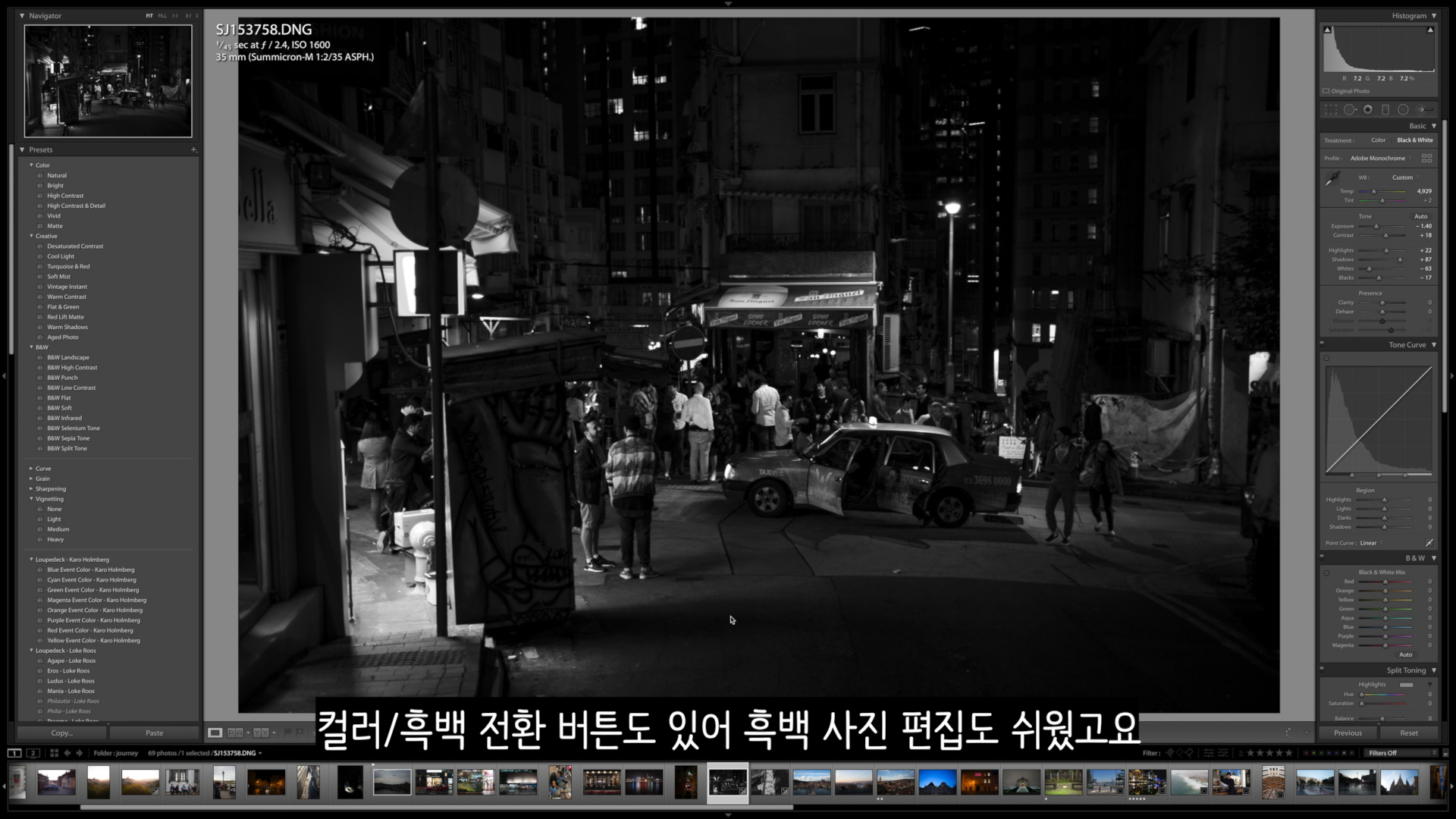 P버튼 역시 라이트룸에서 특히 유용한 버튼입니다. 기본 설정으로 현상 메뉴의 프리셋이 지정돼 있는데, 자주 사용하는 편집 프리셋을 지정하면 원터치로 다양한 설정값을 적용할 수 있습니다. 일반 키보드 조작에서는 단축키로도 불가능한 기능이라 그 편의성의 차이가 크게 느껴졌습니다.