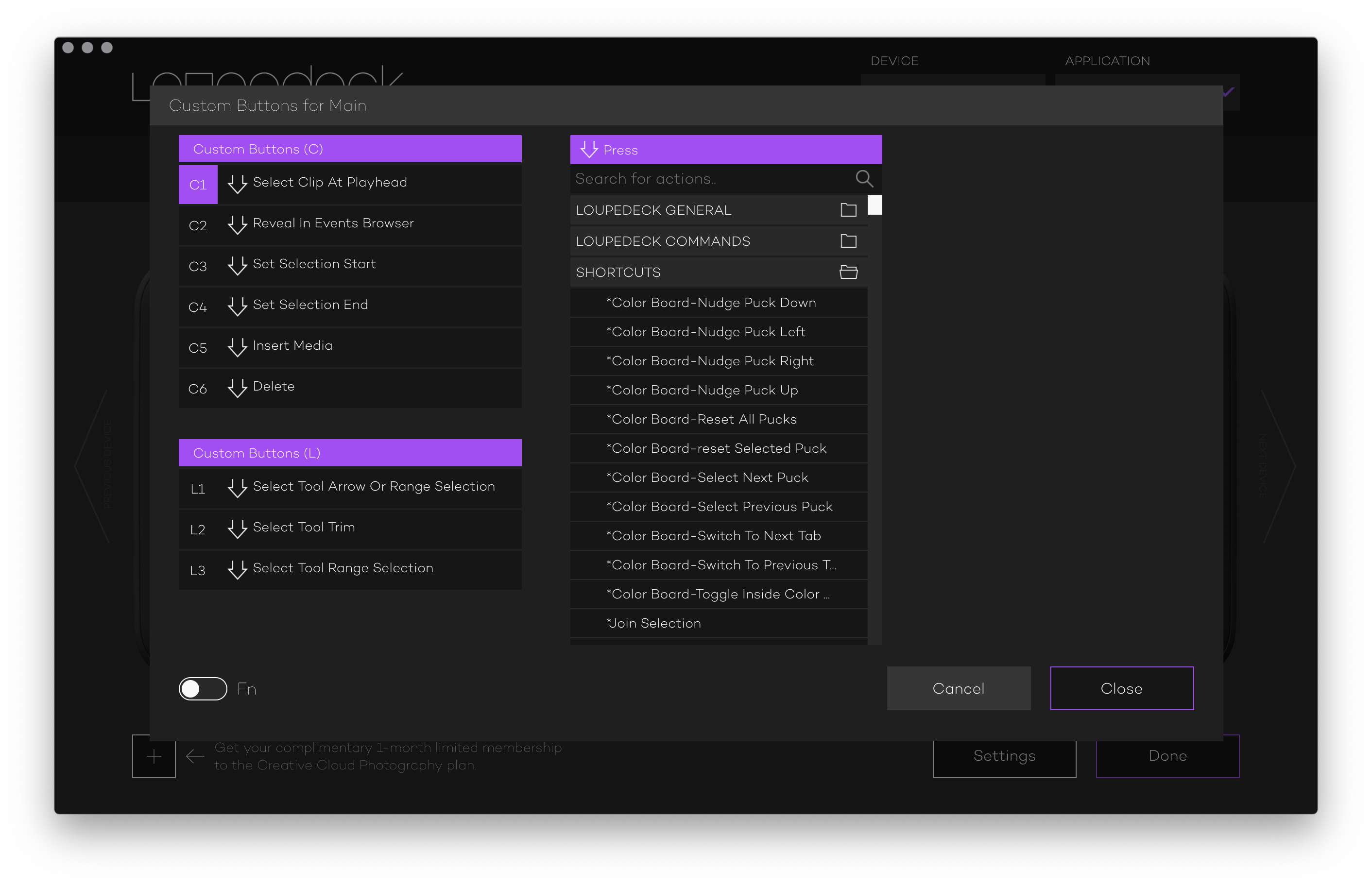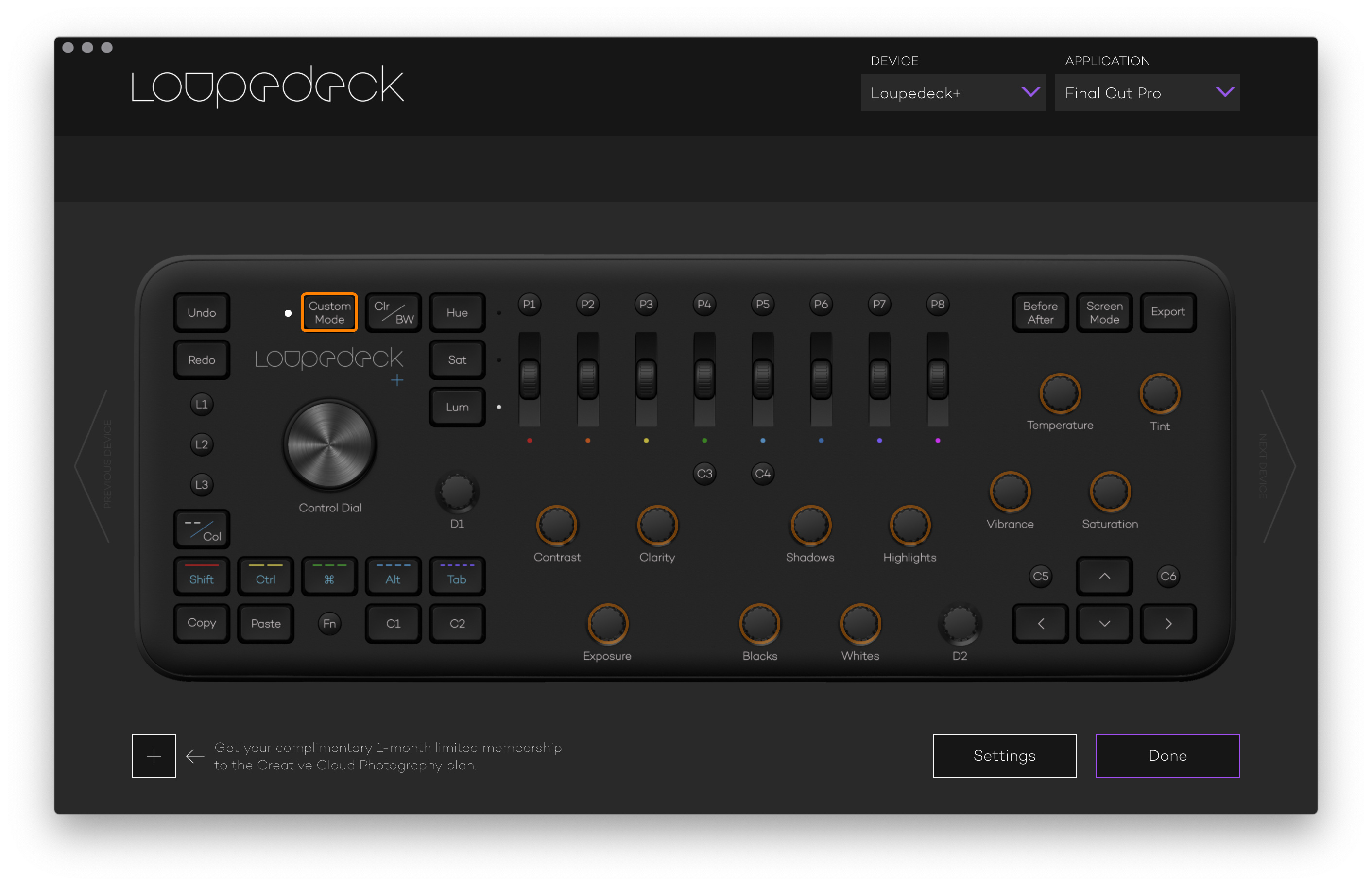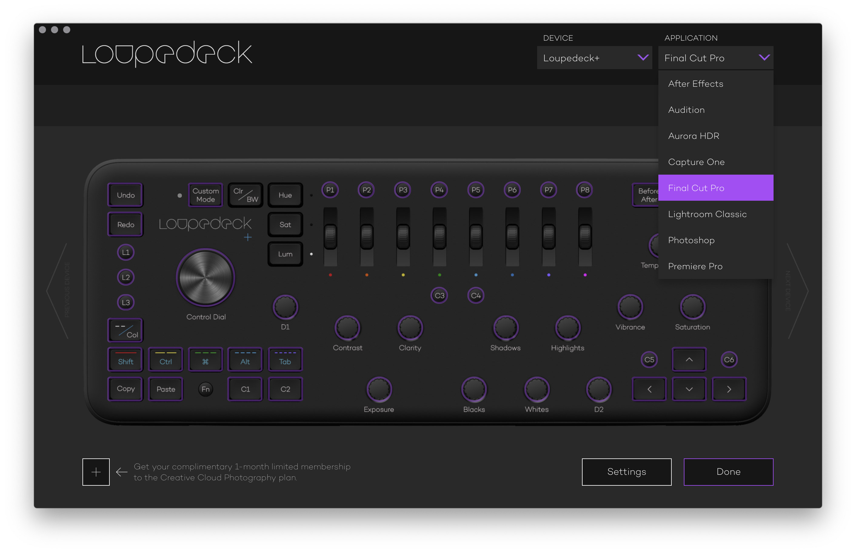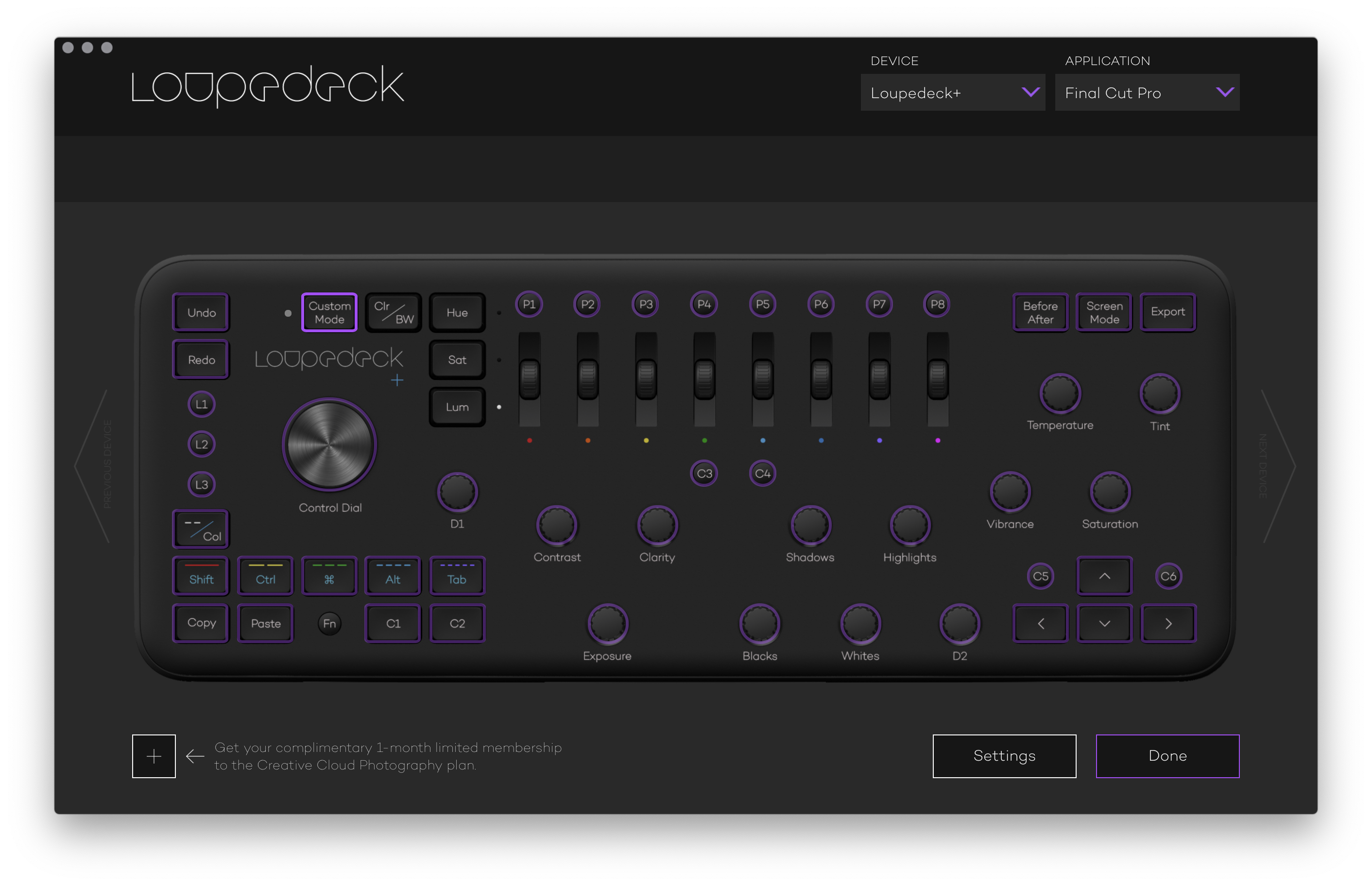 매니저 프로그램에서 애플리케이션을 파이널 컷 프로로 지정하면 사용할 수 있는 버튼과 다이얼의 테두리가 보라색으로 표시됩니다. 라이트룸에서는 라이브러리/현상 두 가지 모드로 탭이 나뉘어있던 것과 달리 파이널컷 환경에서는 단일 조작계를 사용합니다.