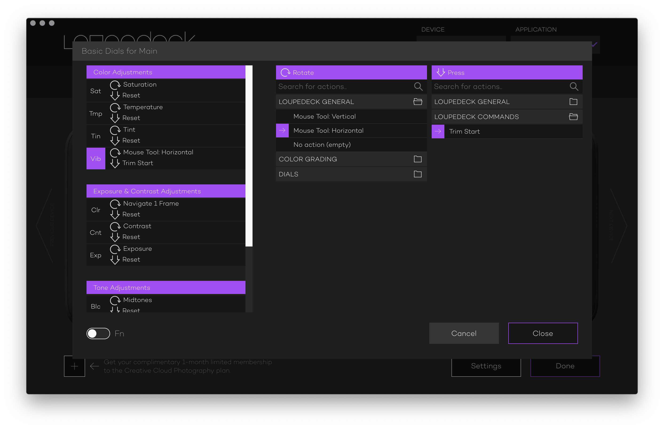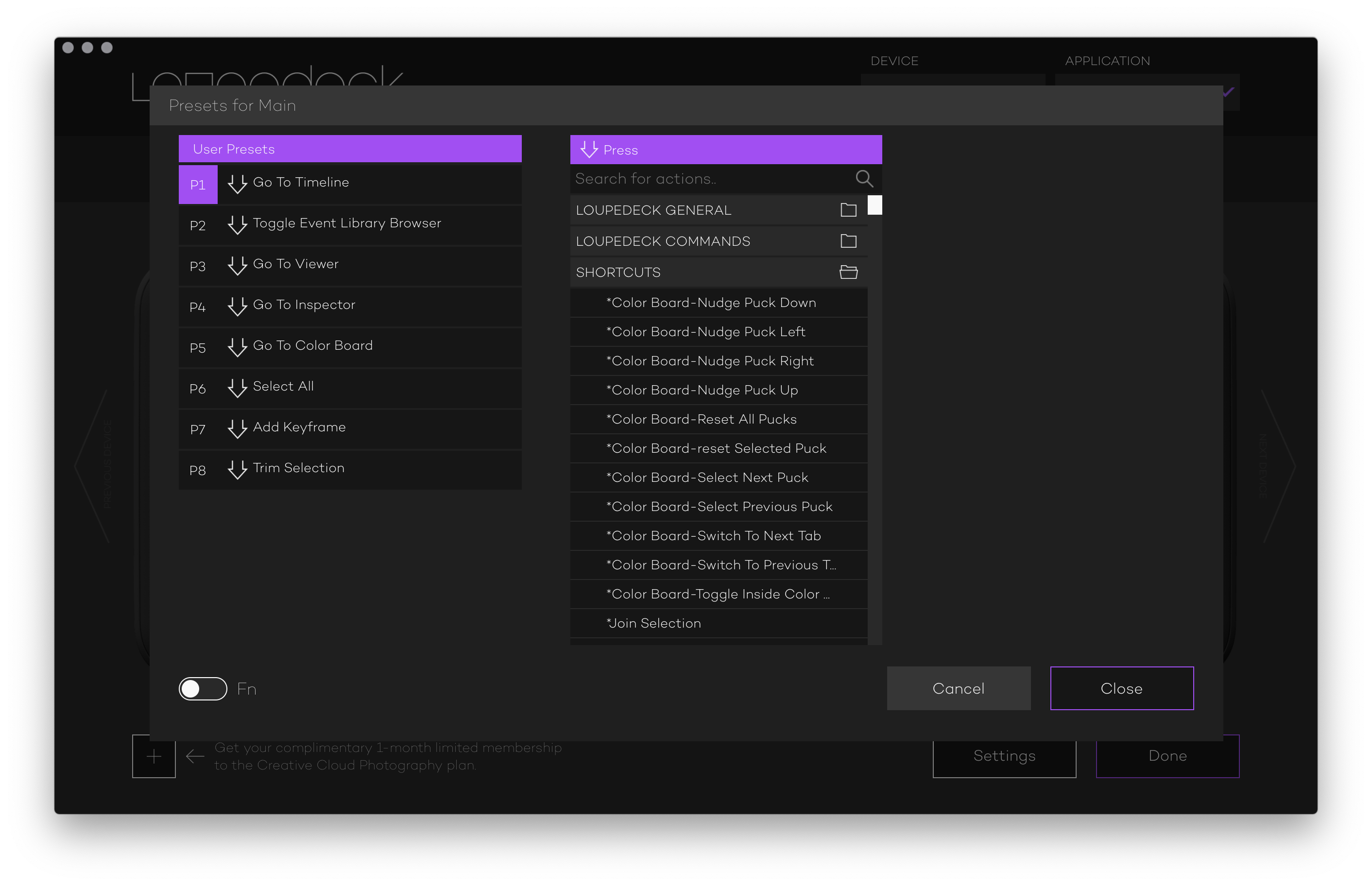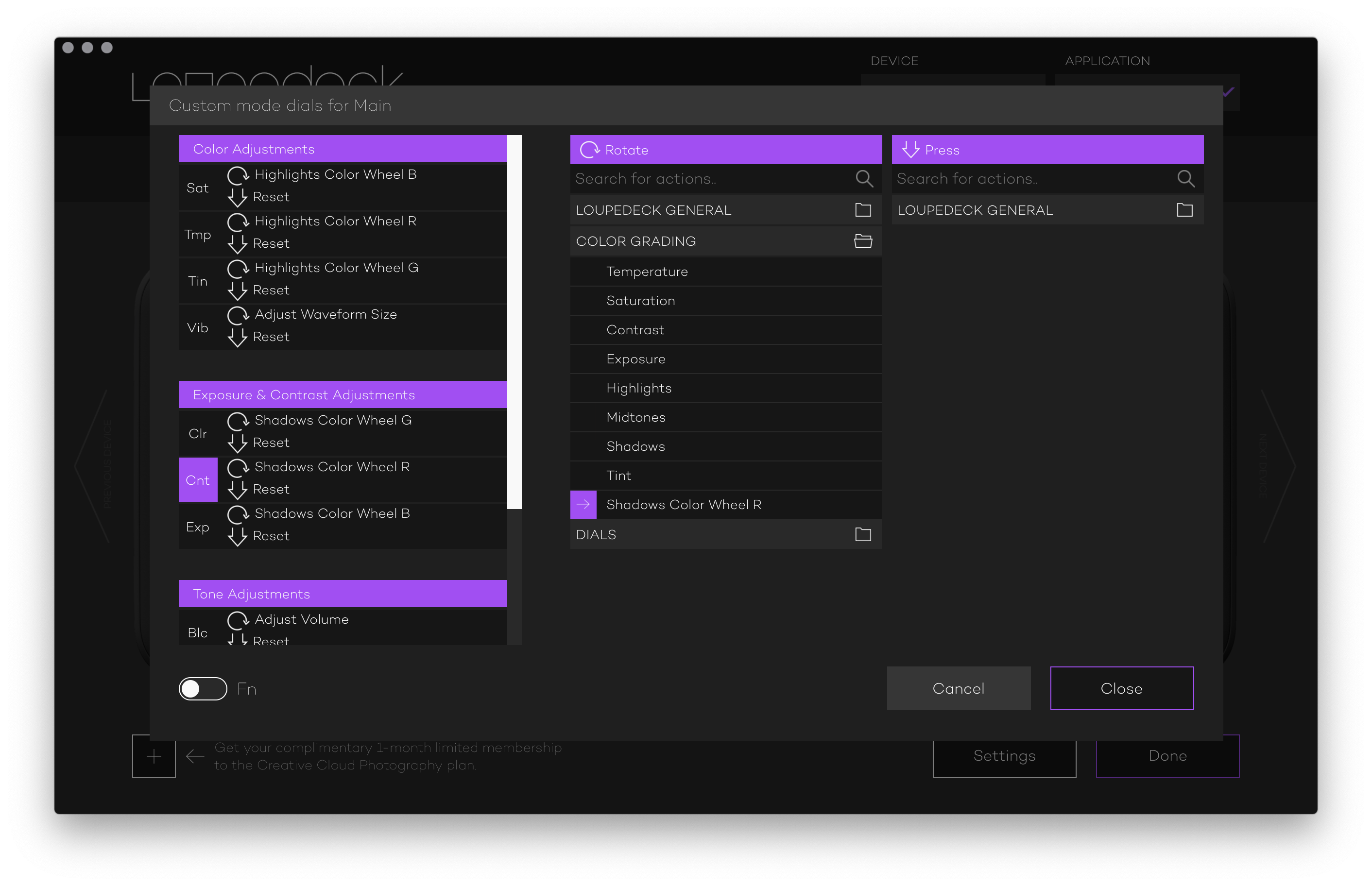 매니저 프로그램에서 애플리케이션을 파이널 컷 프로로 지정하면 사용할 수 있는 버튼과 다이얼의 테두리가 보라색으로 표시됩니다. 라이트룸에서는 라이브러리/현상 두 가지 모드로 탭이 나뉘어있던 것과 달리 파이널컷 환경에서는 단일 조작계를 사용합니다.