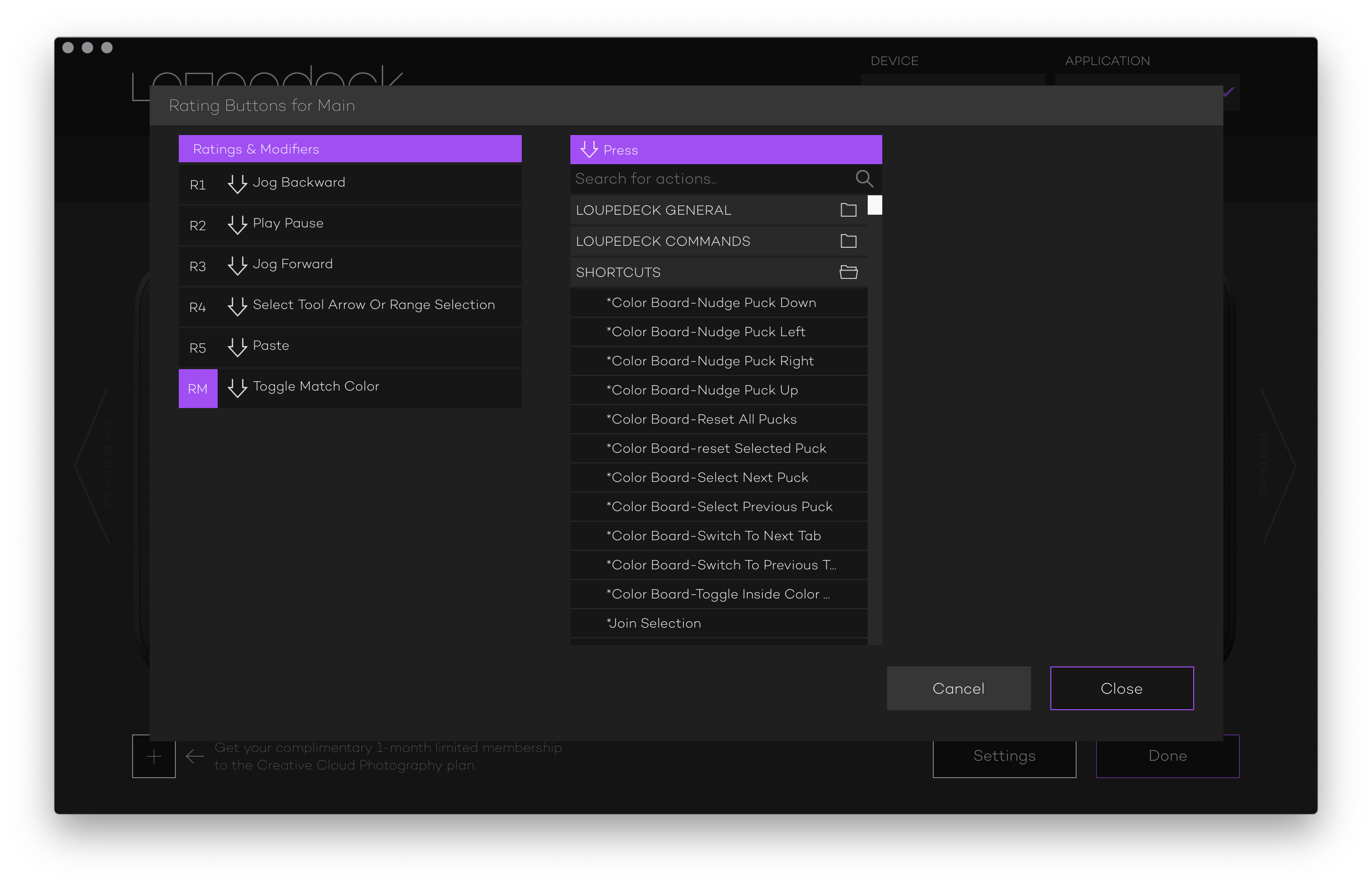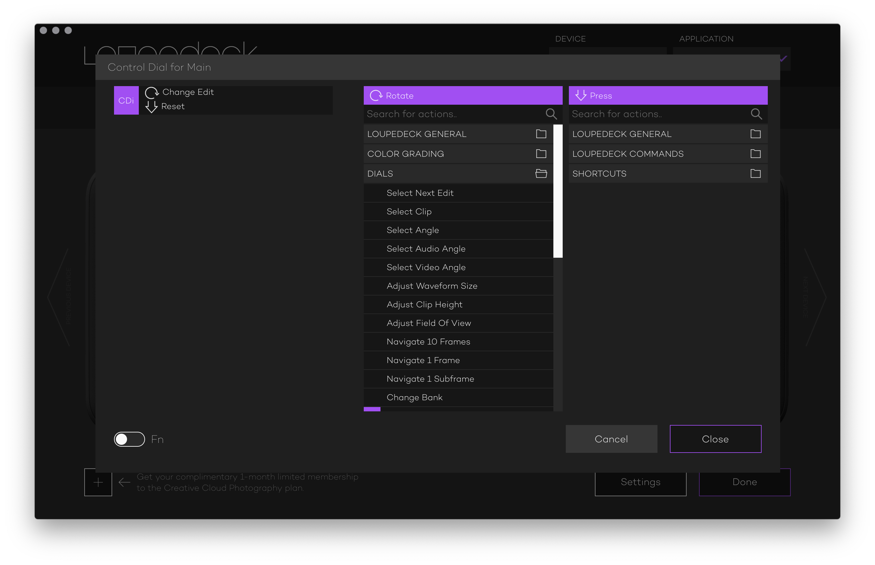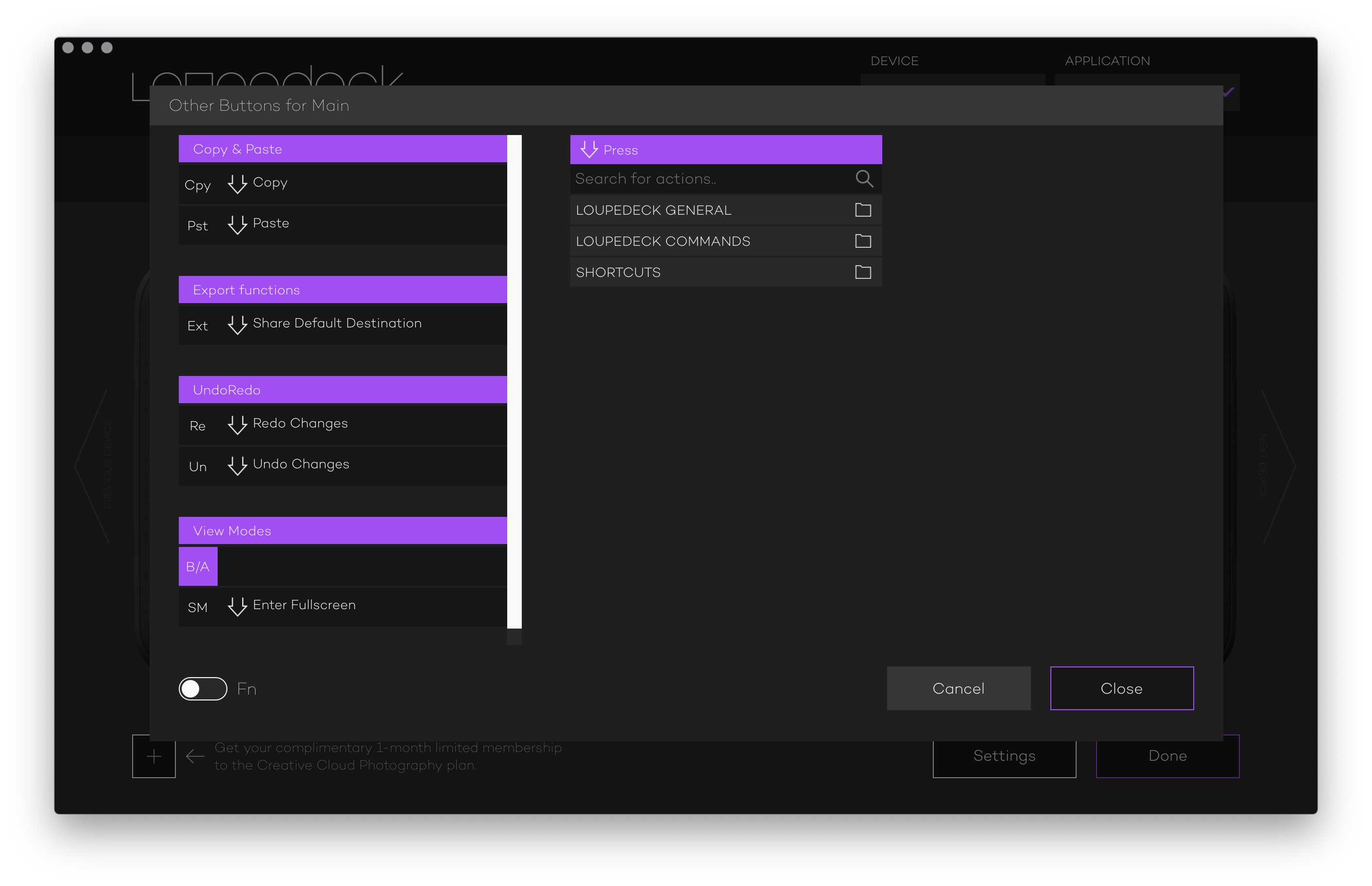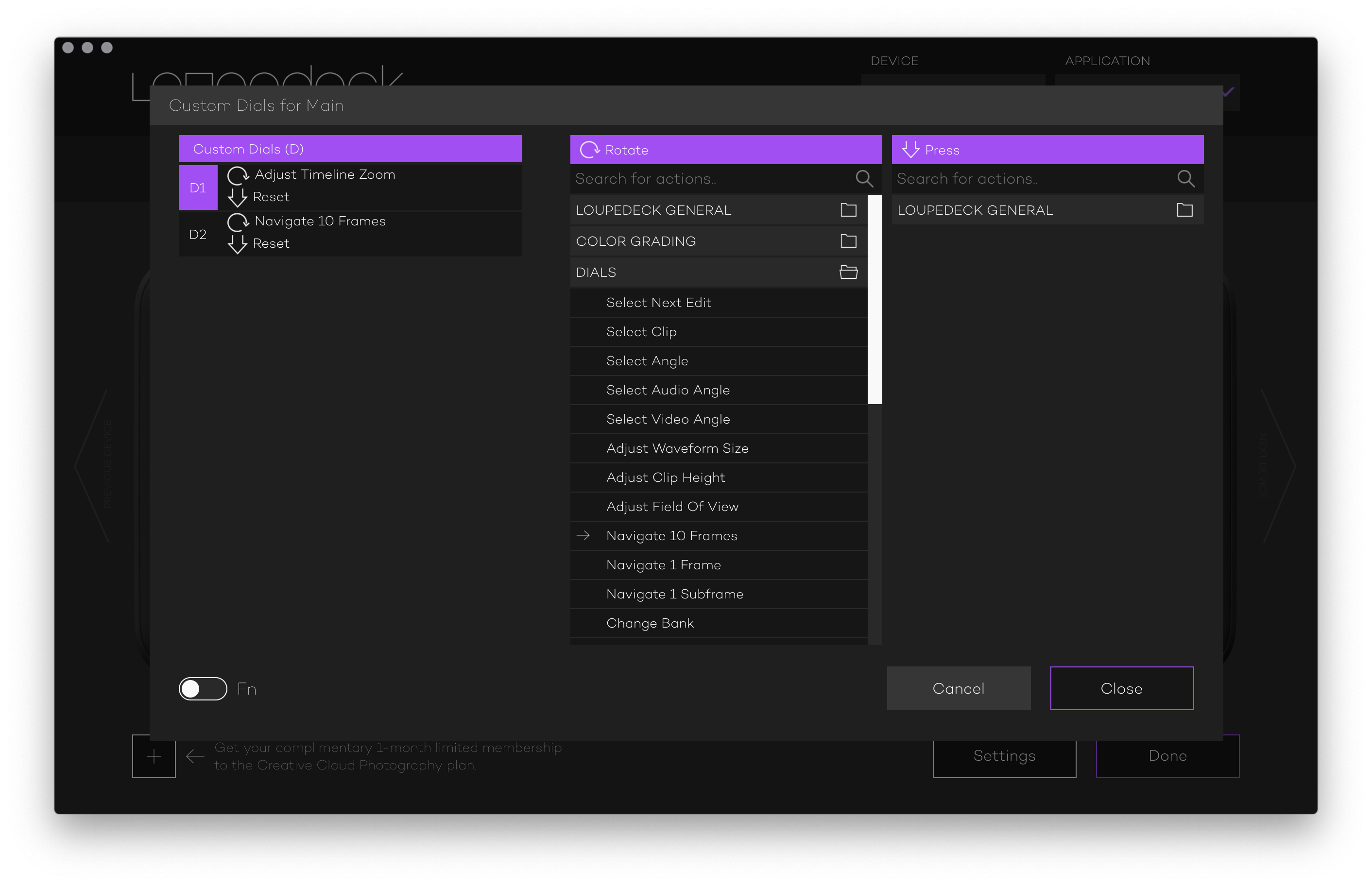 매니저 프로그램에서 애플리케이션을 파이널 컷 프로로 지정하면 사용할 수 있는 버튼과 다이얼의 테두리가 보라색으로 표시됩니다. 라이트룸에서는 라이브러리/현상 두 가지 모드로 탭이 나뉘어있던 것과 달리 파이널컷 환경에서는 단일 조작계를 사용합니다.