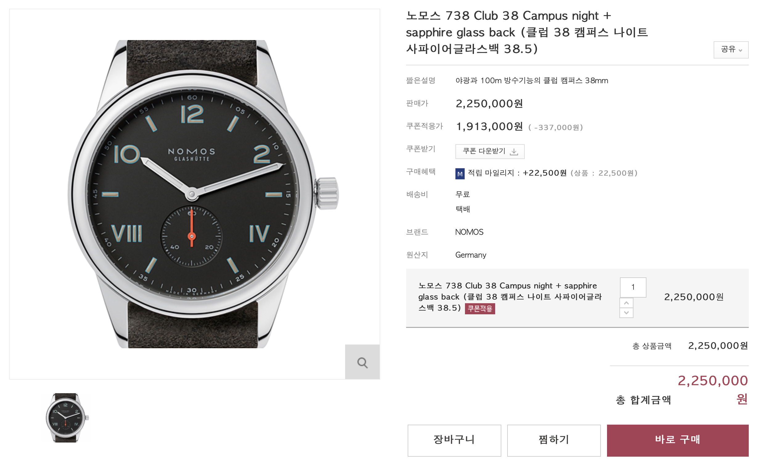 물론 결제 버튼을 누르게 하는 것은 가격입니다. 국내에서 유일하게 노모스가 입점돼 있는 갤러리아 면세점이 영업을 종료하면서 노모스 시계도 큰 폭의 할인을 했거든요. 평소 노모스 클럽 모델을 눈여겨 보던 제게는 그야말로 눈이 반짝, 귀가 번쩍 뜨이는 소식이었고, 적립금과 각종 할인을 적용한 가격은 그야말로 꿈 같았습니다.