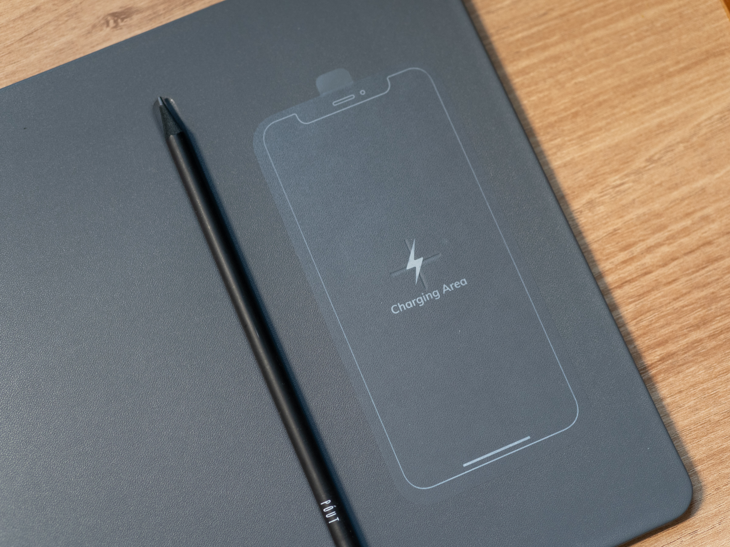 연필 홈을 기준으로 오른쪽이 무선 충전 코일이 있는 부분입니다. 중앙 십자가 표시에 맞춰 휴대폰을 올려 놓으면 충전이 시작됩니다. 아쉽게도 내장된 코일이 하나뿐이라 위치에 제법 민감합니다. 아무렇게나 올려 놓으면 충전이 되지 않아요. 하지만 중심만 잘 맞추면 그럭저럭 인식률은 괜찮습니다.