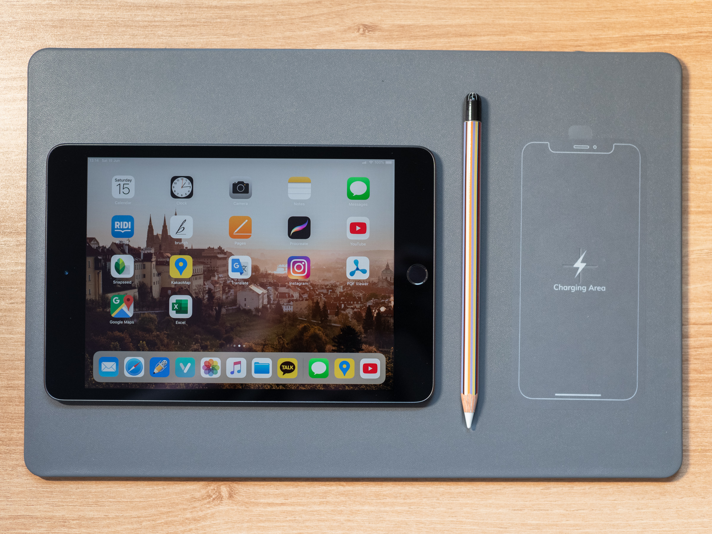 마우스 패드의 크기를 비교하기 위해 아이패드 미니 5를 올려 놓아봤습니다. 무선 충전 패드 부분을 제외해도 일반적인 마우스 패드에 비해 공간이 제법 넉넉합니다. 회의용도로 아이패드와 애플 펜슬을 사용하는 터라 쓸데 없어 보이는 연필 홈도 유용하게 활용하고 있습니다. 이래서 고민될 땐 일단 비싼 걸 사라는 건가 봐요.