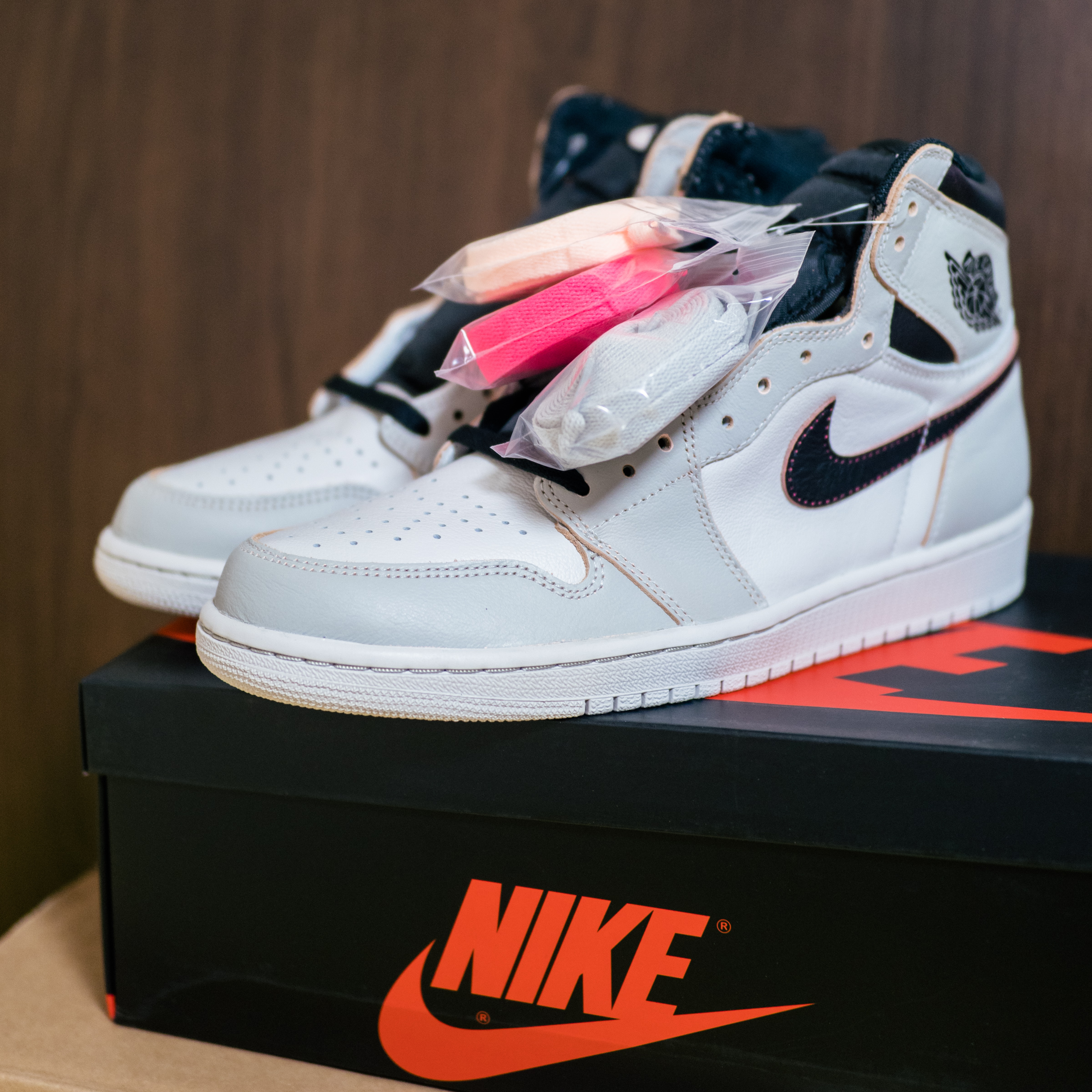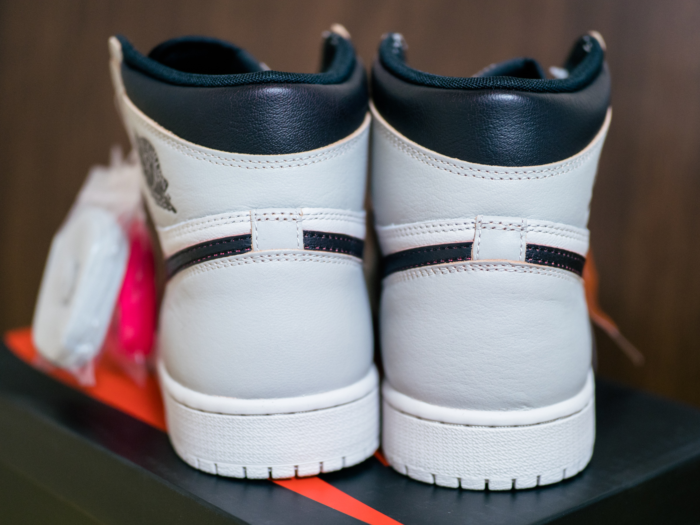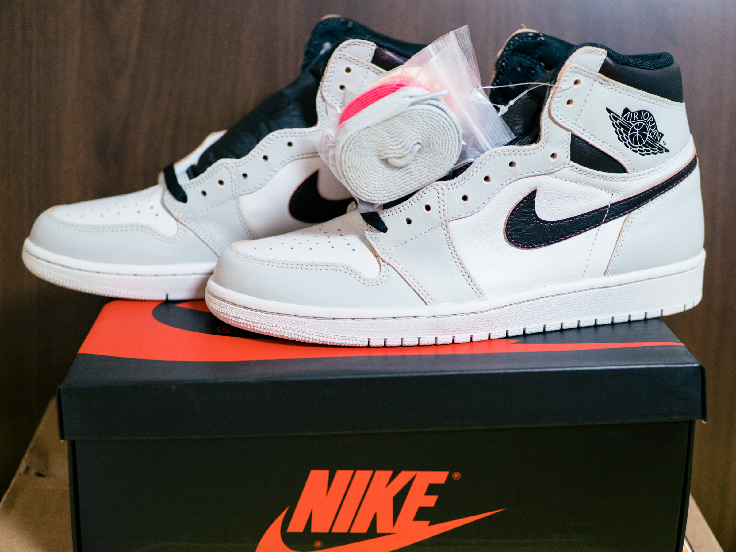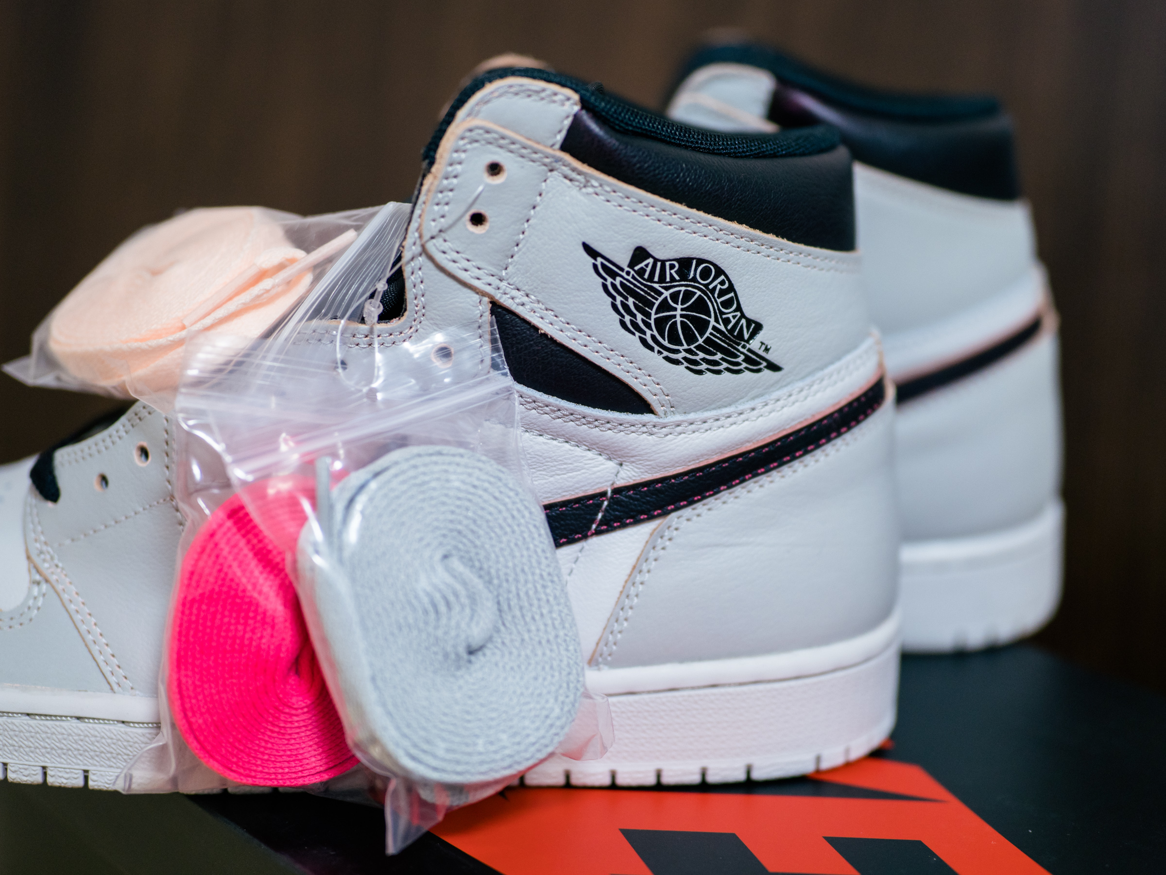 바뀐 색상을 대비해 신발 끈을 넉넉하게 넣어 준 것이 인상적이었습니다. 겉으로 보기엔 흰색과 밝은 회색의 무난한 조합이지만 가죽 단면으로 보이는 핑크색이 일반적인 조던 모델이 아니라는 것을 과시하고 있죠.