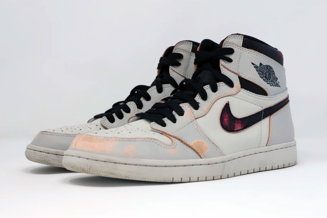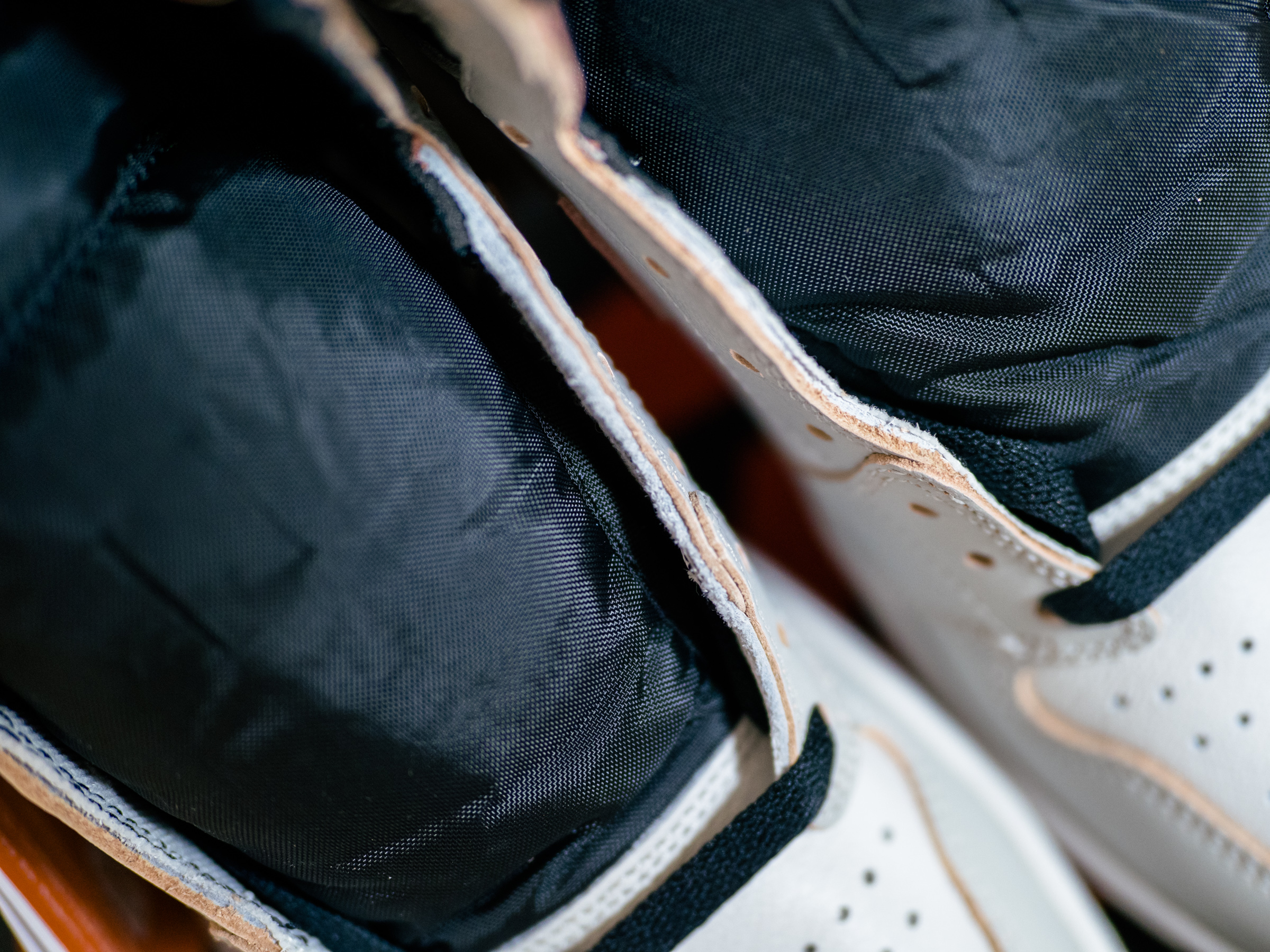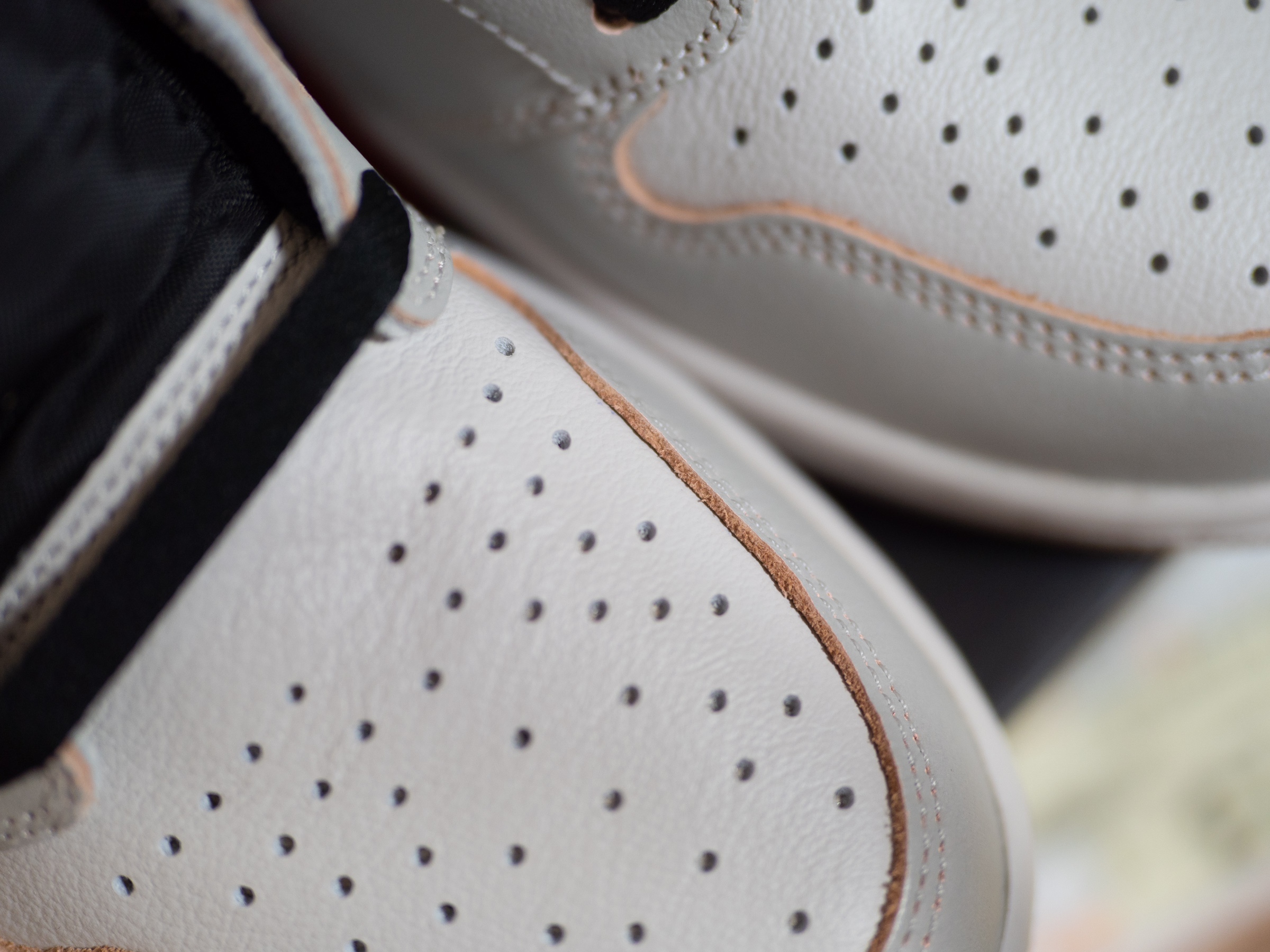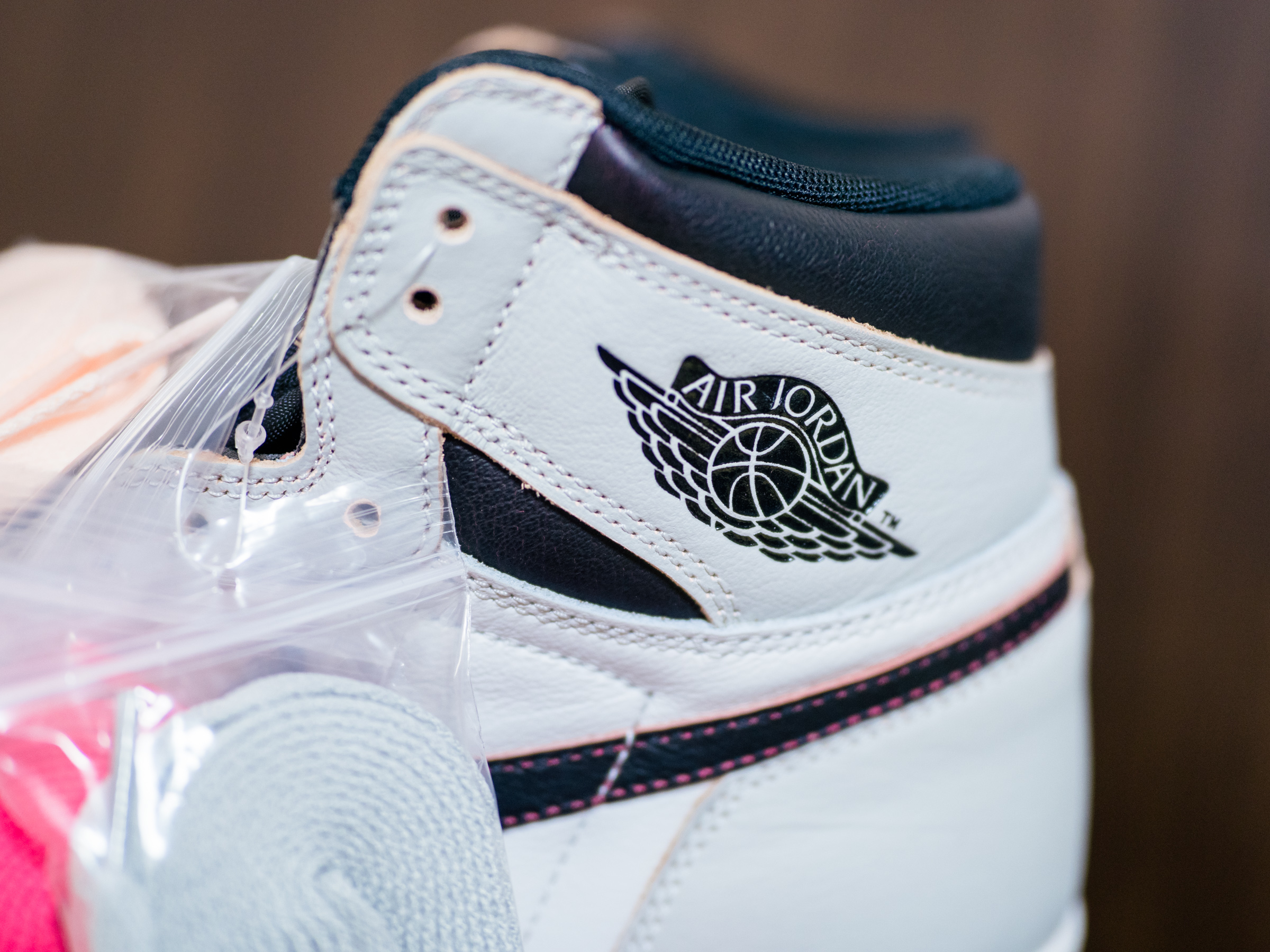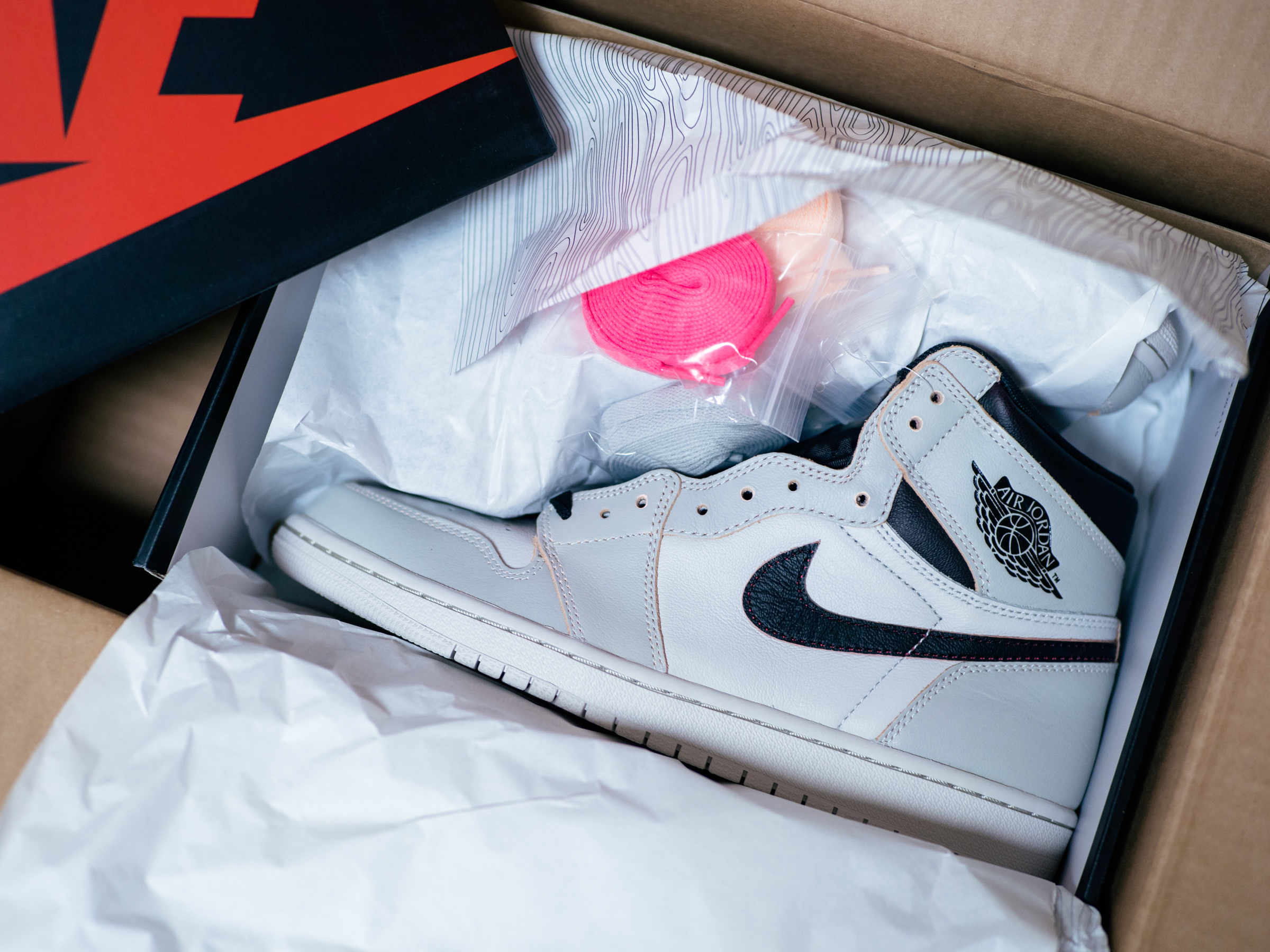 바뀐 색상을 대비해 신발 끈을 넉넉하게 넣어 준 것이 인상적이었습니다. 겉으로 보기엔 흰색과 밝은 회색의 무난한 조합이지만 가죽 단면으로 보이는 핑크색이 일반적인 조던 모델이 아니라는 것을 과시하고 있죠.