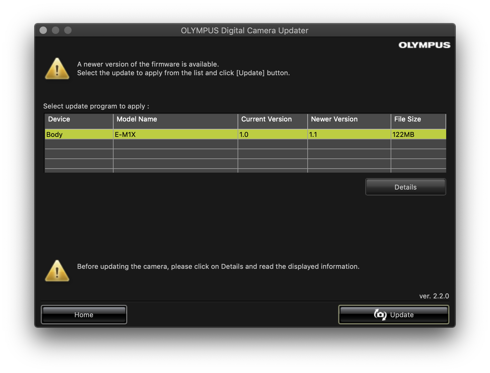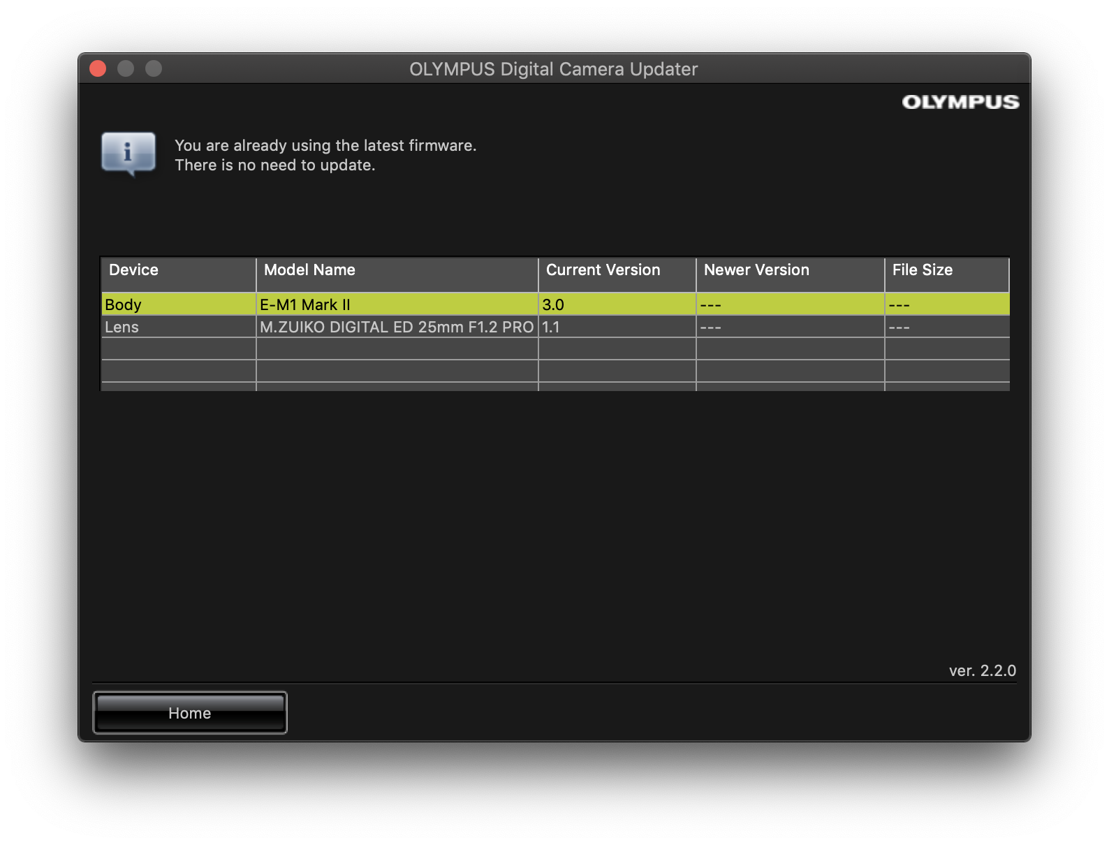 업데이트 소식을 듣자마자 펌웨어 업데이트를 실행했습니다. E-M1X, E-M1 Mark II 모두 USB Type C로 PC와 연결되고 Workspace로 업데이트가 가능하기 때문에 이전 제품들보다 업데이트가 훨씬 쉽고 간편해졌습니다. E-M1X의 최신 펌웨어는 1.1이지만 E-M1 Mark II는 2.3에서 3.0으로 변경돼 메이저 업데이트라는 것을 알 수 있습니다.