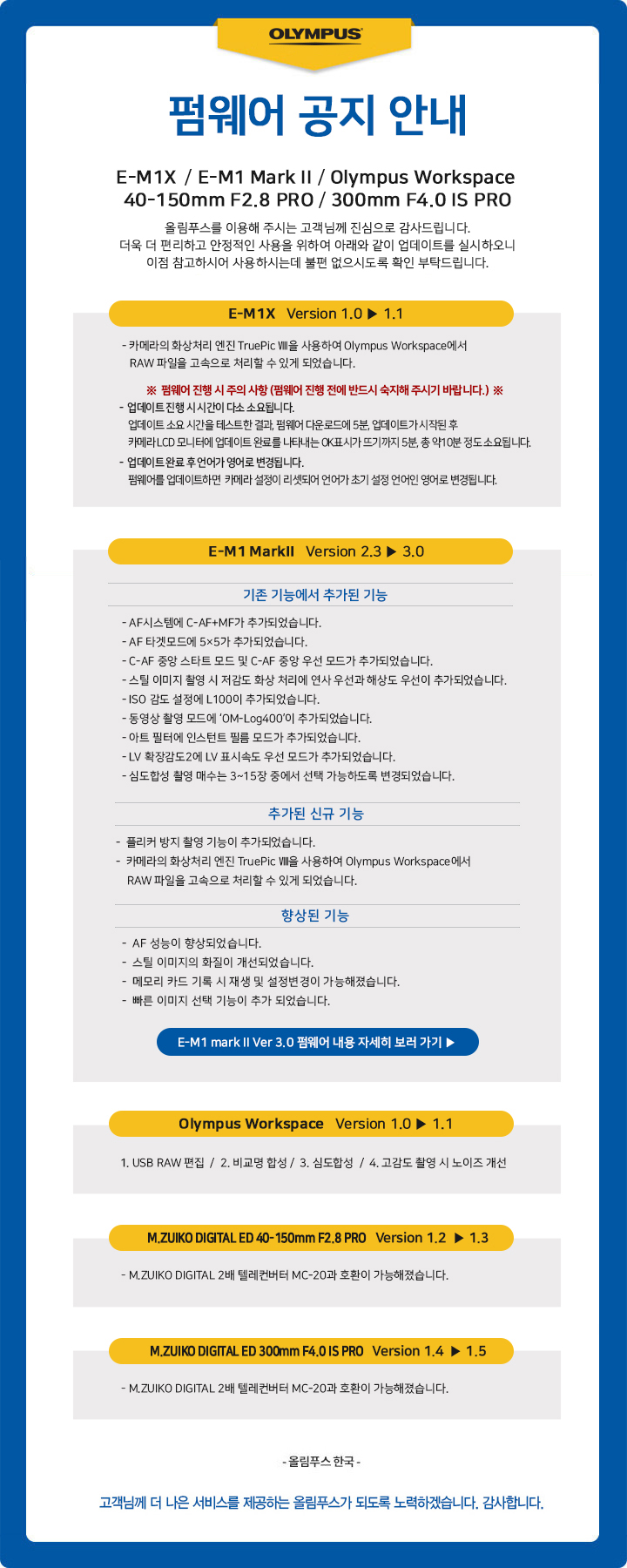 아래는 이번 업데이트에 관한 올림푸스 한국의 공지 내용입니다.