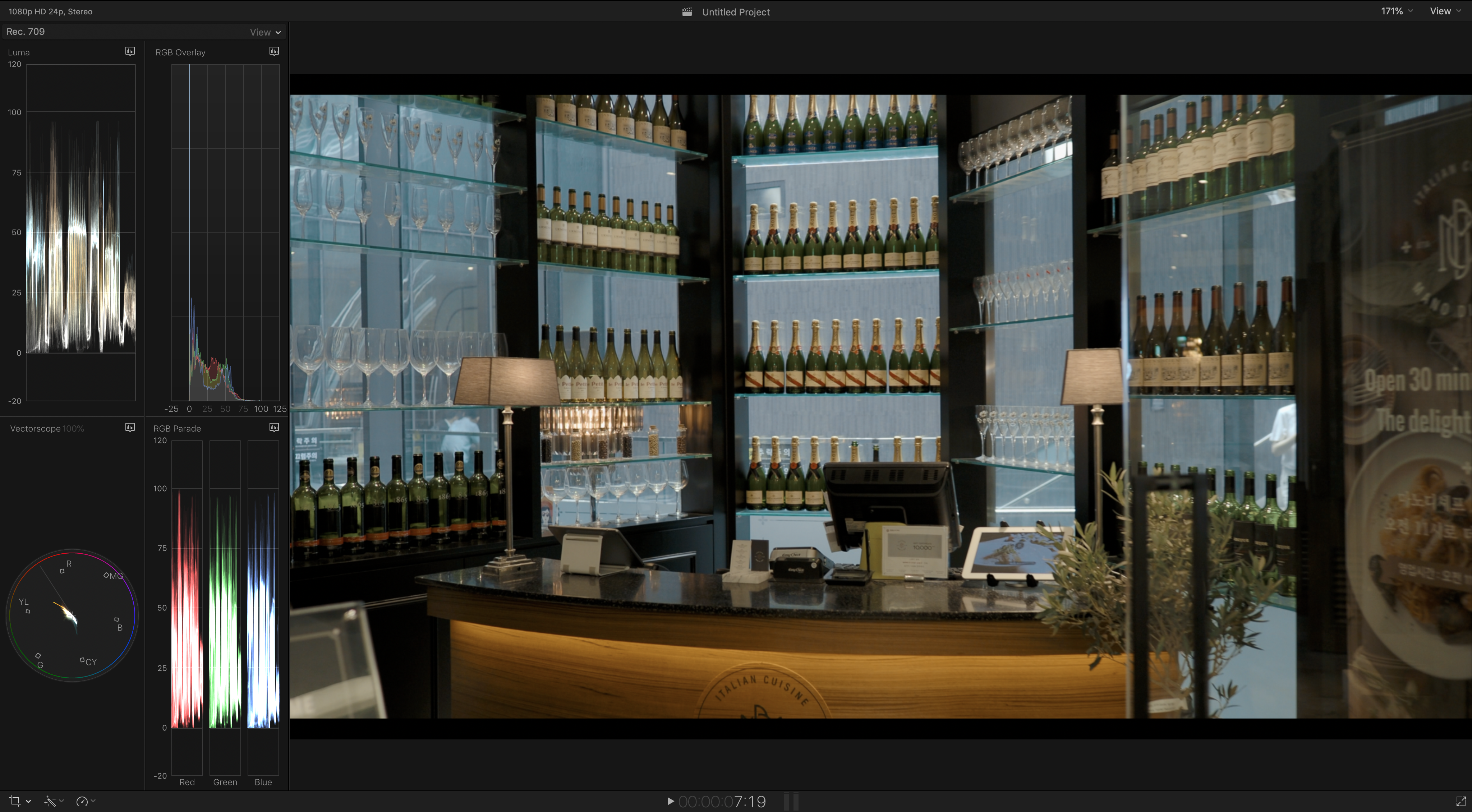 색온도를 4800K로 설정한 것은 홀 촬영에선 문제가 없었지만 그에 비해 어둡고 노란 조명이 사용된 룸 안에선 색이 틀어져 컬러 교정에 비교적 많은 시간이 소요됐습니다. E-M1X와 E-M1 Mark II 모두 빛이 부족한 실내/야간에서 OM-LOG400를 사용하면 녹색이 부각되더군요. 그래서 청록색 톤을 가진 LUT를 적용해 필름 느낌의 분위기로 색보정을 했습니다. C4K 포맷의 24p 영상과도 잘 어울려서 개인적으로 만족합니다.