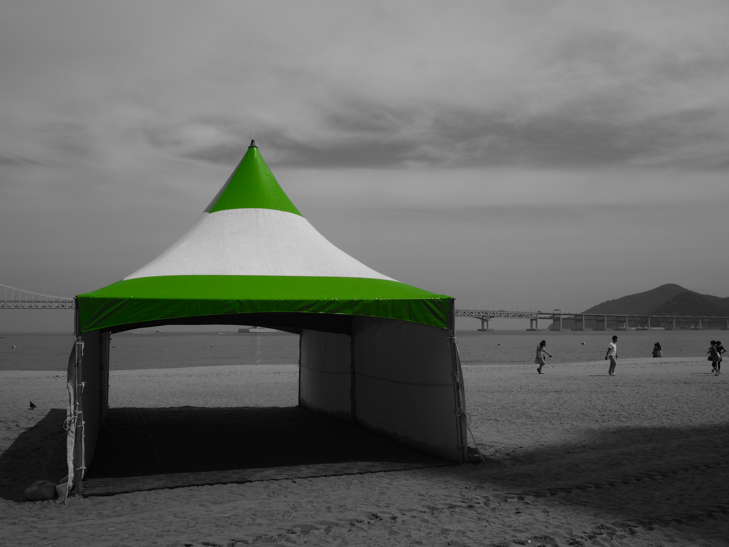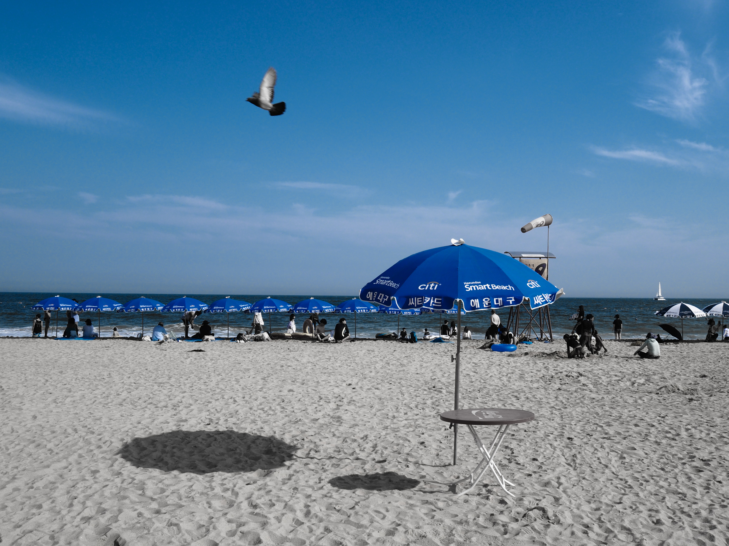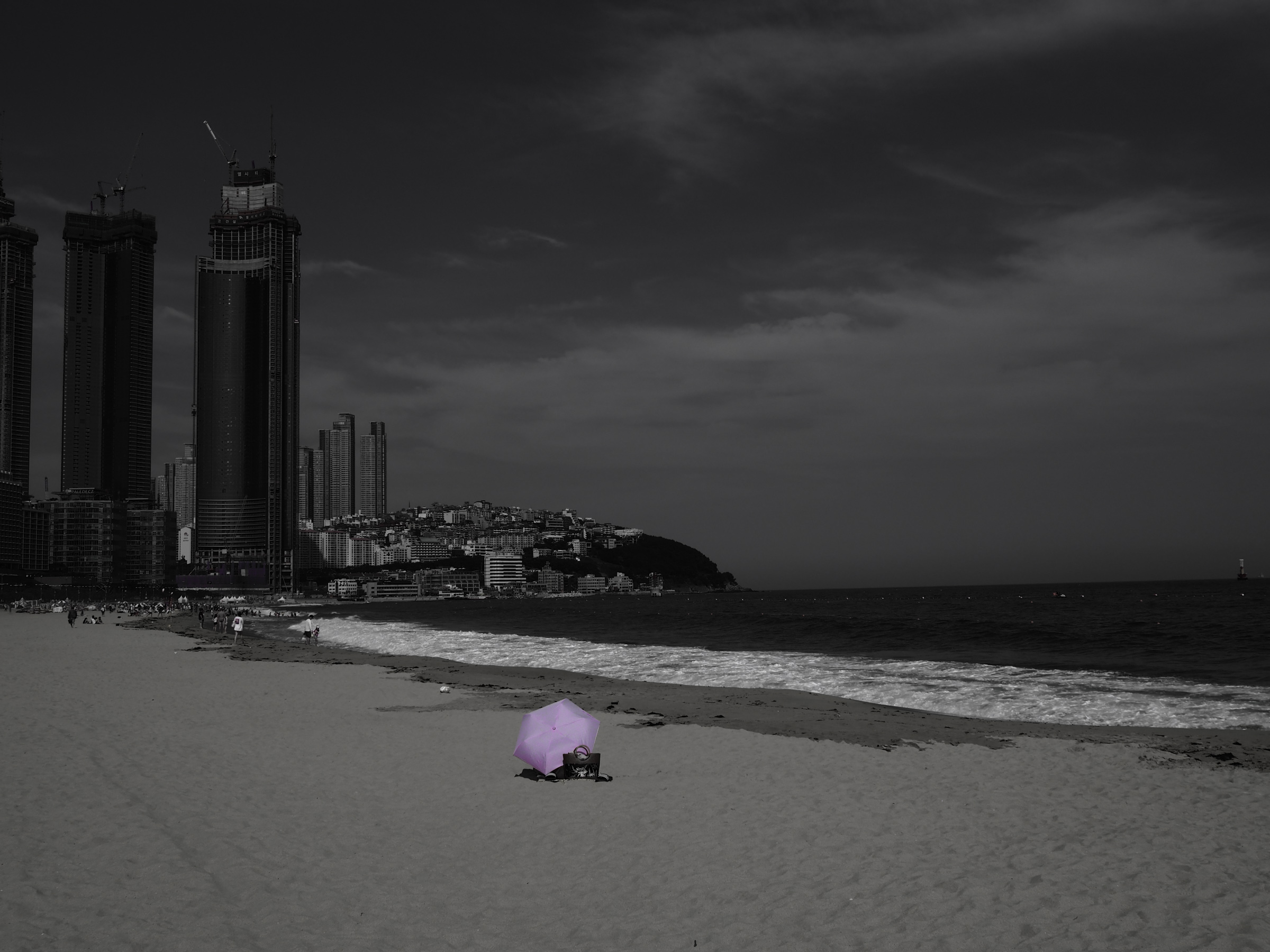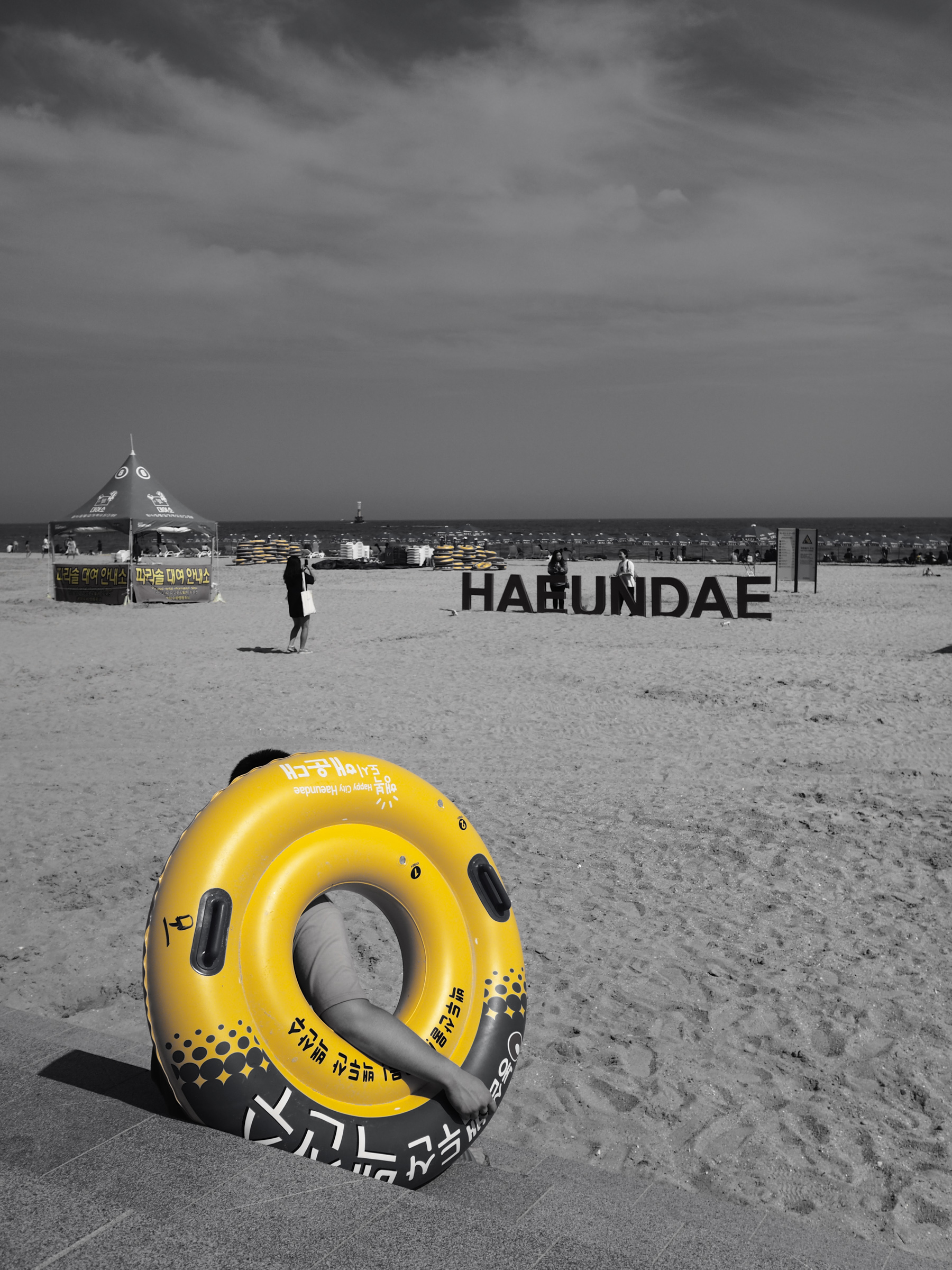 빨강 못지 않게 흑백 사진과 좋은 대비를 보이는 것이 노란색입니다. 빨강보다 눈에 자주 띄지는 않습니다만, 그만큼 더 강렬한 대비를 만들어 낼 수 있죠. 특히 해운대에서 찍은 아래 사진은 구도, 그리고 백사장과의 대비가 제 맘에 드는 사진인데, 셀렉티브 컬러 기능을 적용하니 또 다른 느낌입니다.