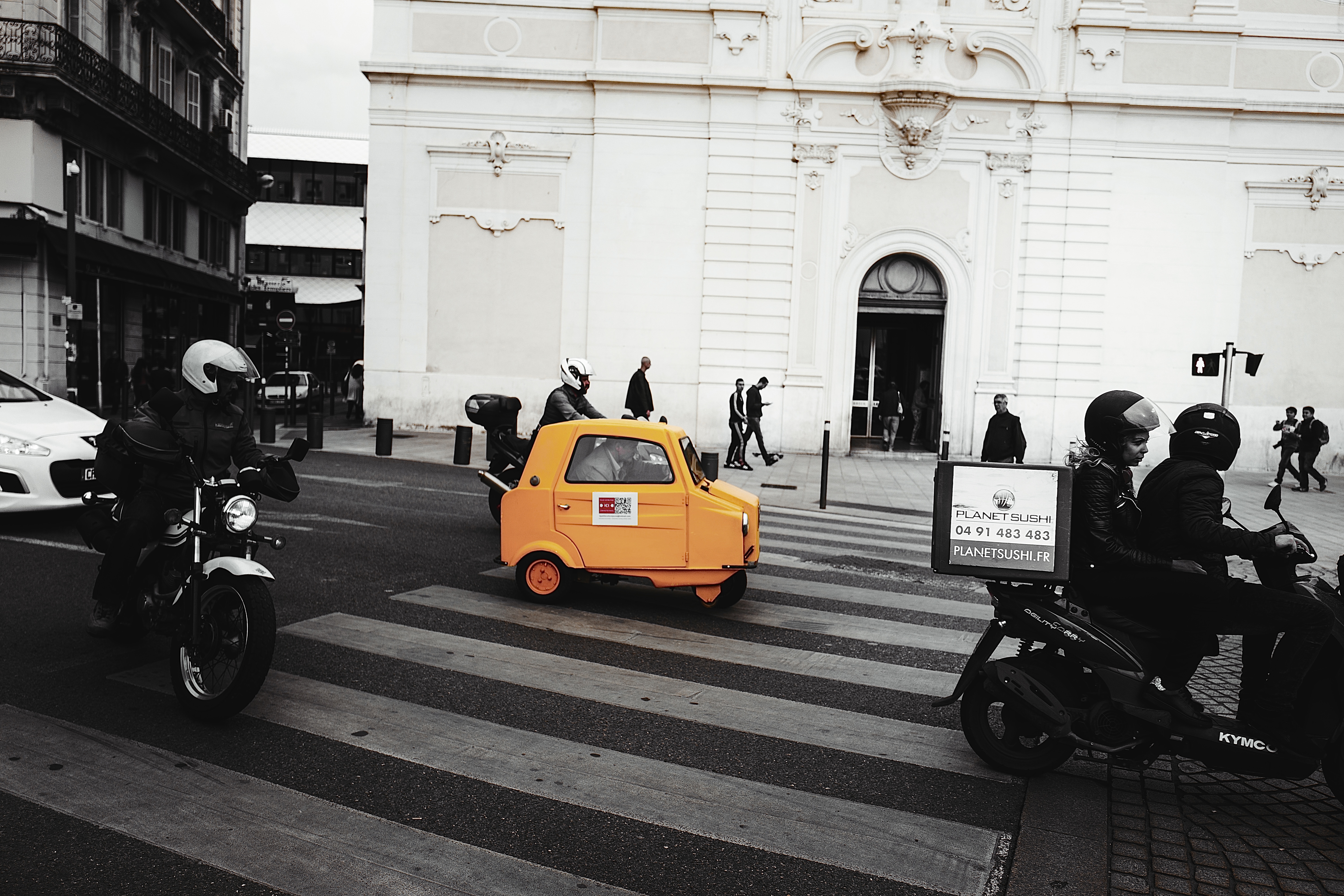 장난감처럼 작은 차? 혹은 오토바이가 눈 앞에 지나가는데 흐린 날씨 때문에 회색처럼 보였던 도시에서 노란색의 '그것'이 얼마나 강렬하게 보이던지요. 그래서 이 사진은 보정 과정에서 노란색만 살리고 나머지 컬러는 모두 채도를 낮춰 주제를 확실히 부각시켰습니다. 컬러 대비로 이미지를 더욱 다이내믹하게 연출하고 주제를 강조하는, 많은 사람들이 사랑하는 사진 촬영/연출법이죠.