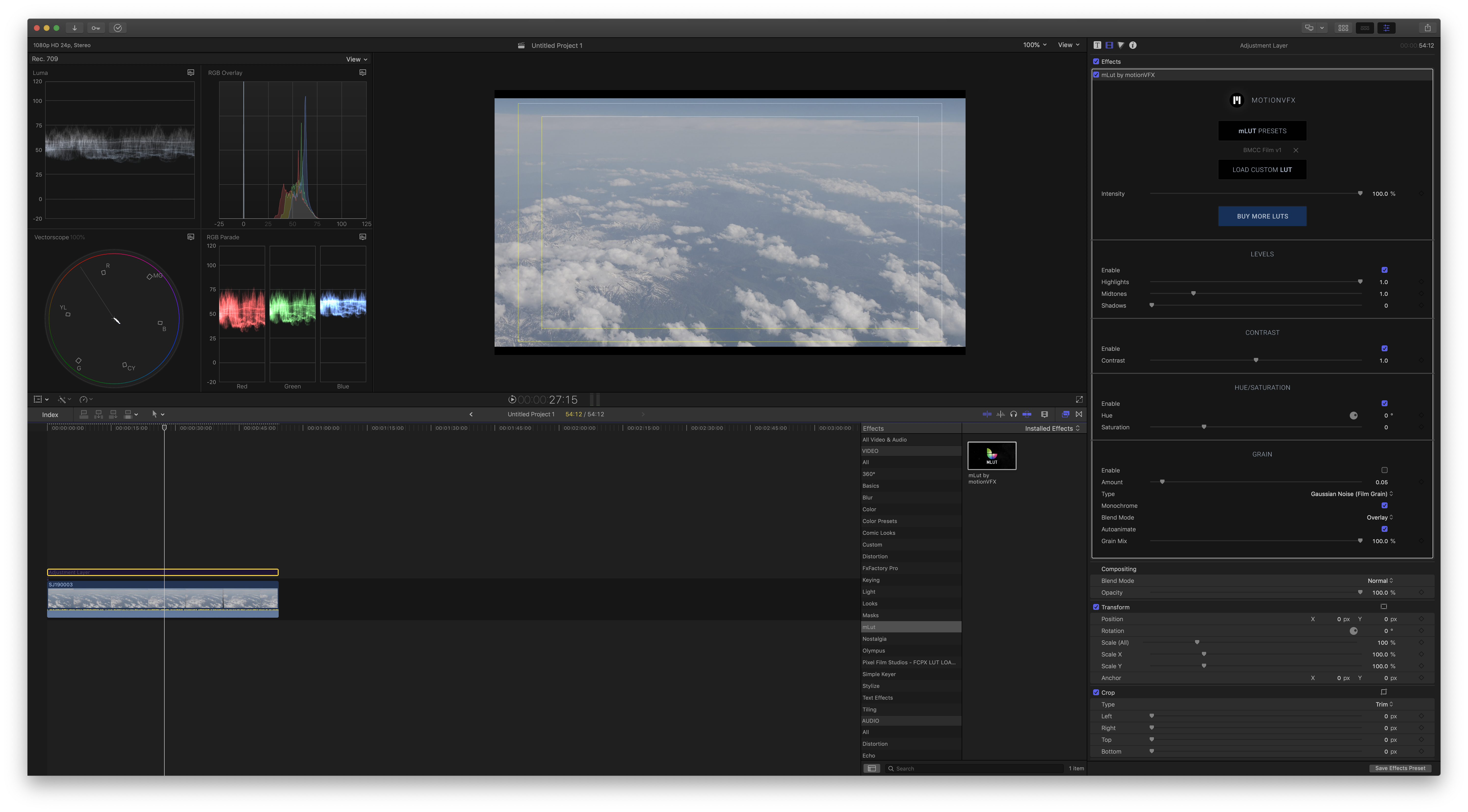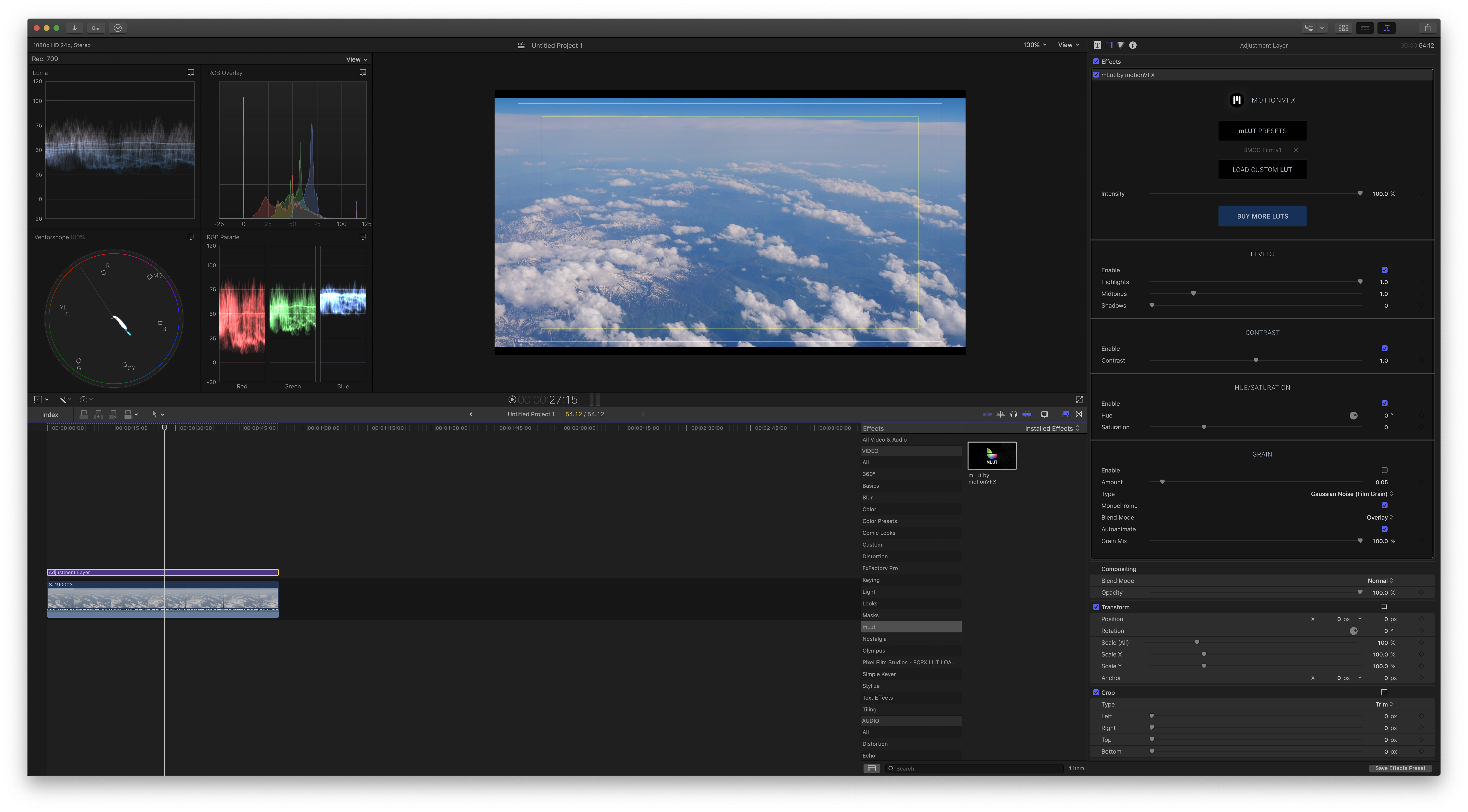 가장 많이 사용하는 방법은 adjustment layer를 이용해 컬러 교정 및 보정을 진행하는 것입니다. 영상에 직접 보정값을 적용하지 않기 때문에 차후 변경/취소가 간편하고 여러 영상에 일관된 컬러톤을 적용하기에도 유리하죠. LUT 적용은 제 경우에 무료 툴인 mLUT과 무료 LUT들을 주로 활용하고 있습니다.