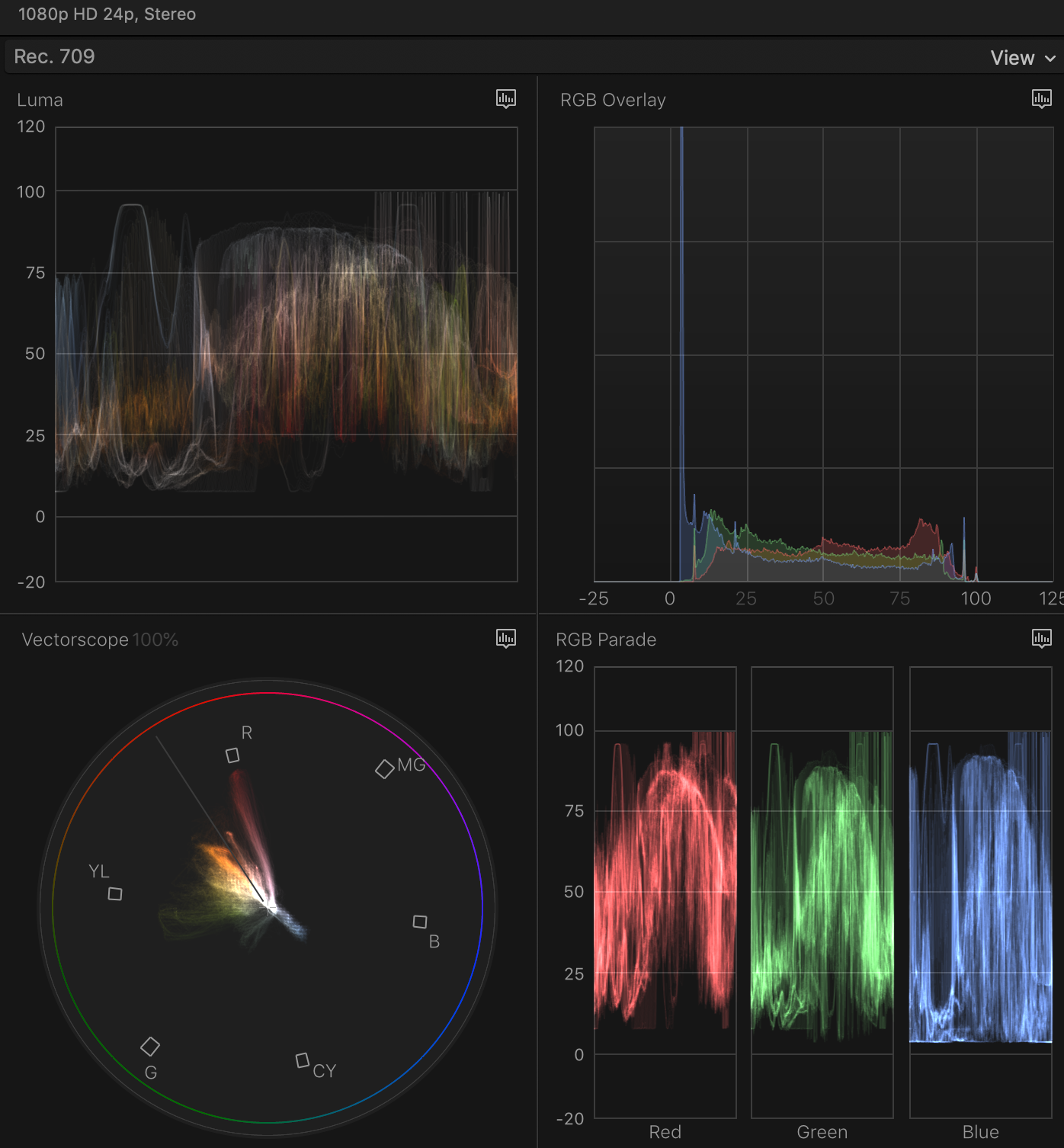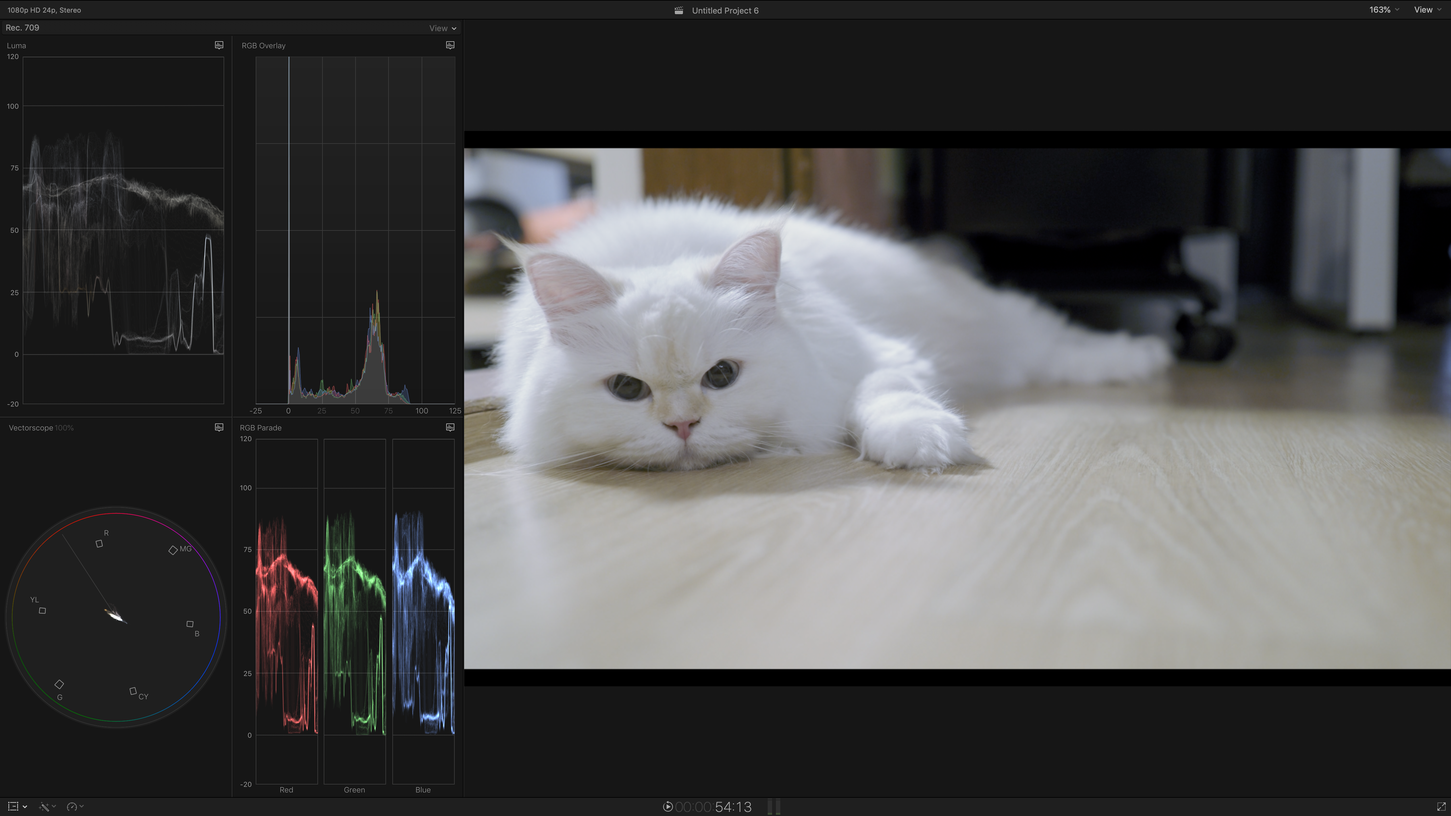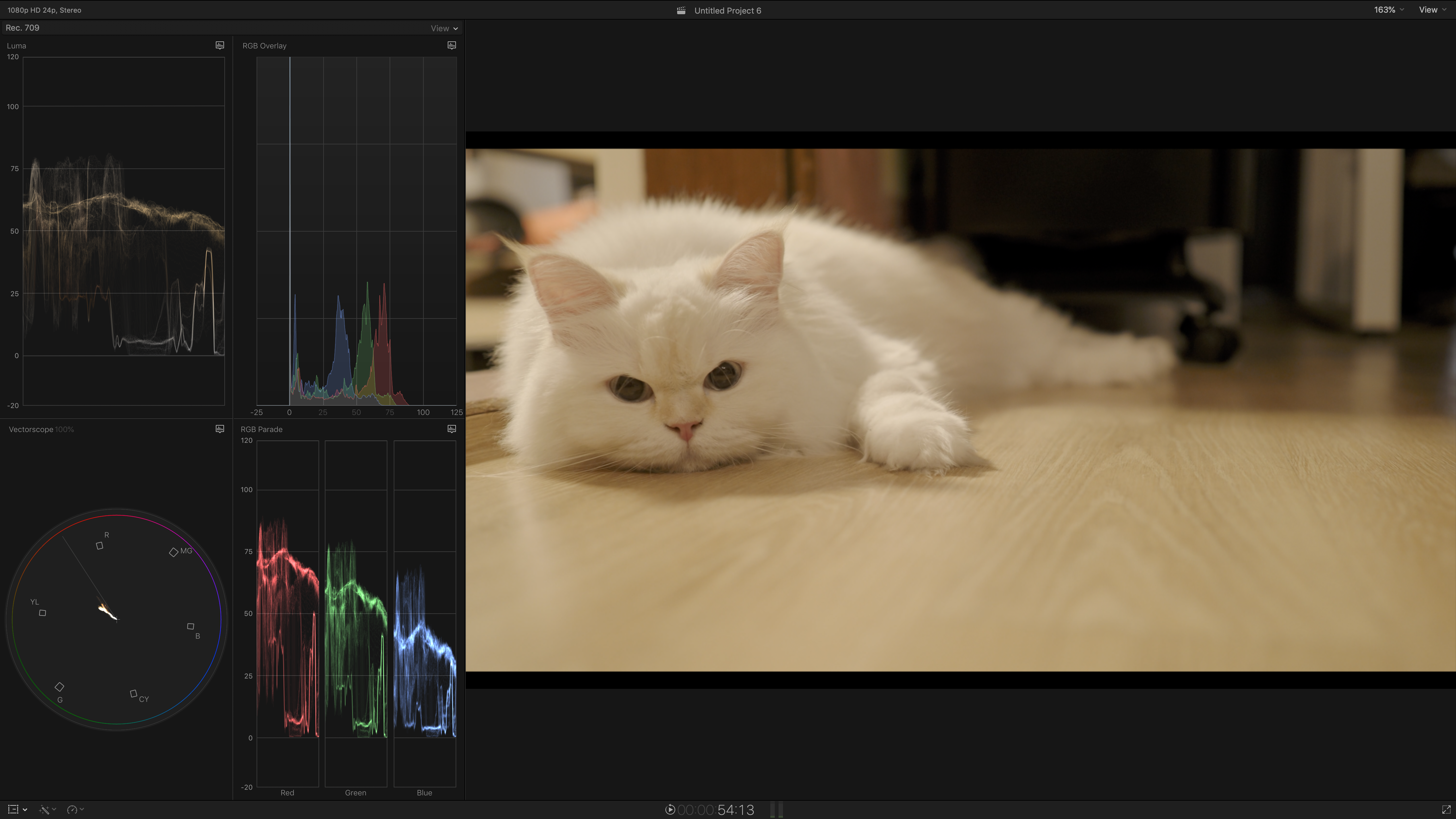 WB를 4800K로 적용하고 촬영한 영상은 실내 조명에서 실제 색을 제대로 표현하지 못했습니다. 때문에 가장 먼저 색 교정 작업을 진행했습니다. 제가 사용하는 파이널 컷 프로 X에서는 cmd+7 단축키를 눌러 편집 화면을 연 뒤, RGB 수준기를 참고해 실제 색과 같게 각 값을 조절하게 됩니다.