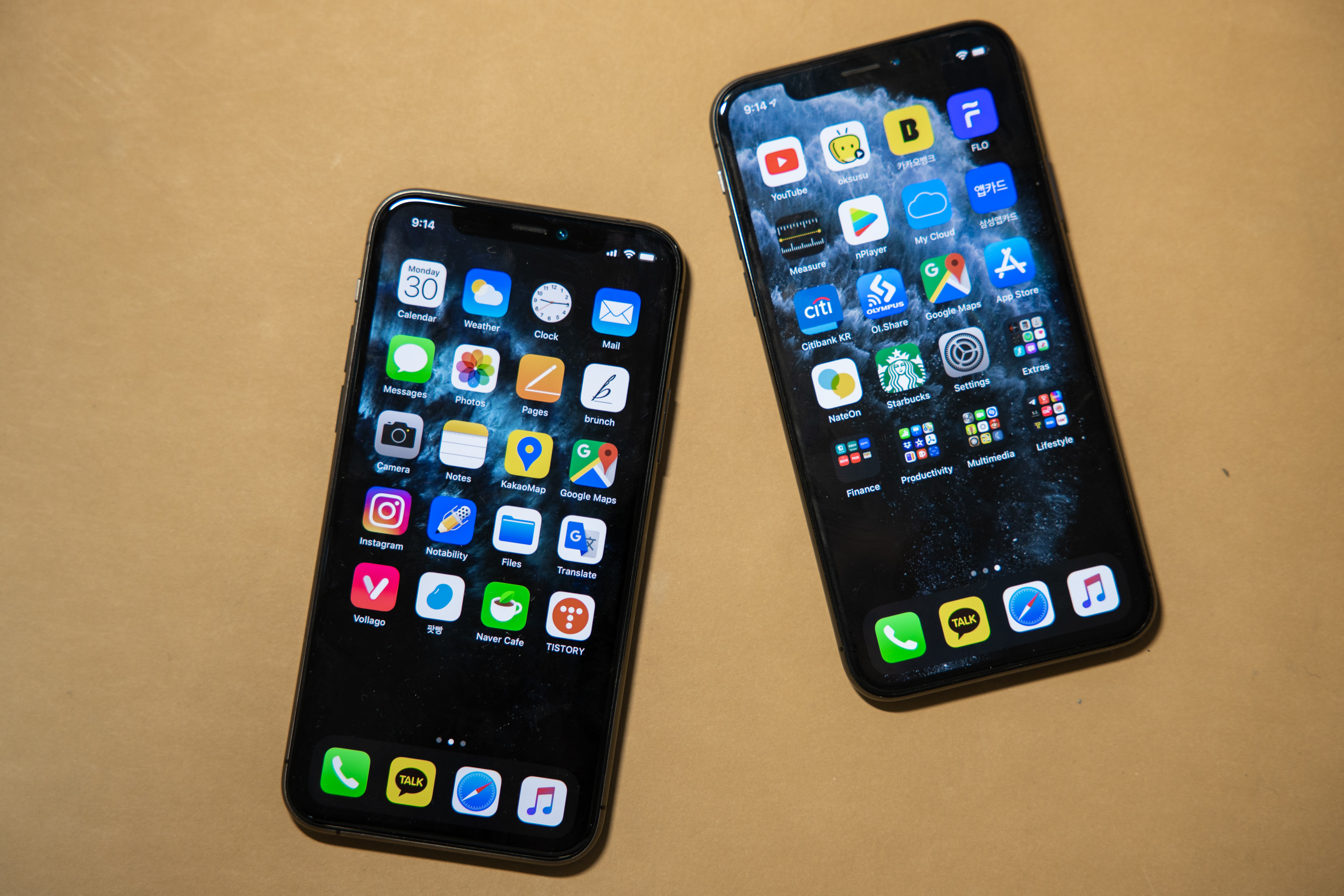 대강 세팅을 마치고 나란히 두 폰을 놓으니 현타가 옵니다. '아, 내가 무슨 짓을 한 거지...' 전면만 봐서는 아이폰 X와 11 프로를 구분하기 불가능합니다. 어느쪽이 신상일까요? -정답은 왼쪽-