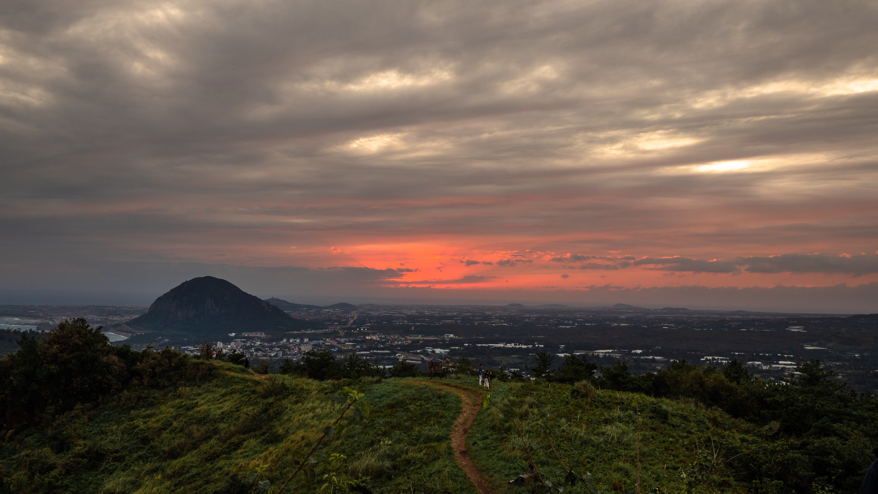 오름 정상에 올라 해가 완전히 지는 것을 보고 다시 내려올 때까지 한 시간이 채 걸리지 않았던 것 같아요. 그 짧은 시간동안 하늘은 시시각각 변하며 눈을 뗄 수 없게, 셔터를 멈출 수 없게 했습니다. 태풍 때문에 걱정했던 모두의 마음을 달래줬죠. 그림같은 하늘 아래서 함께 온 이들의 실루엣 역시 아름다웠습니다.