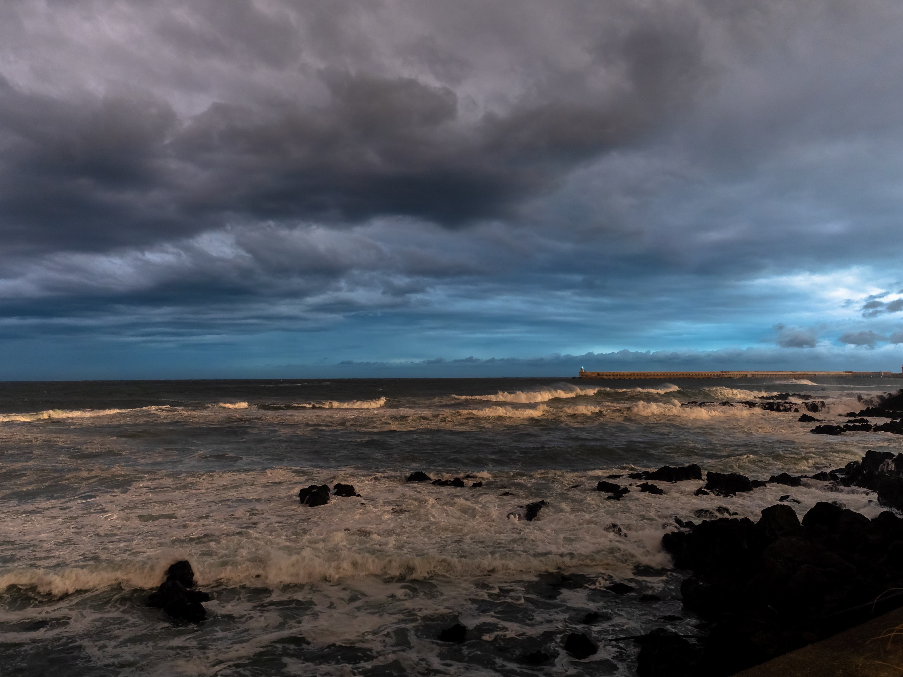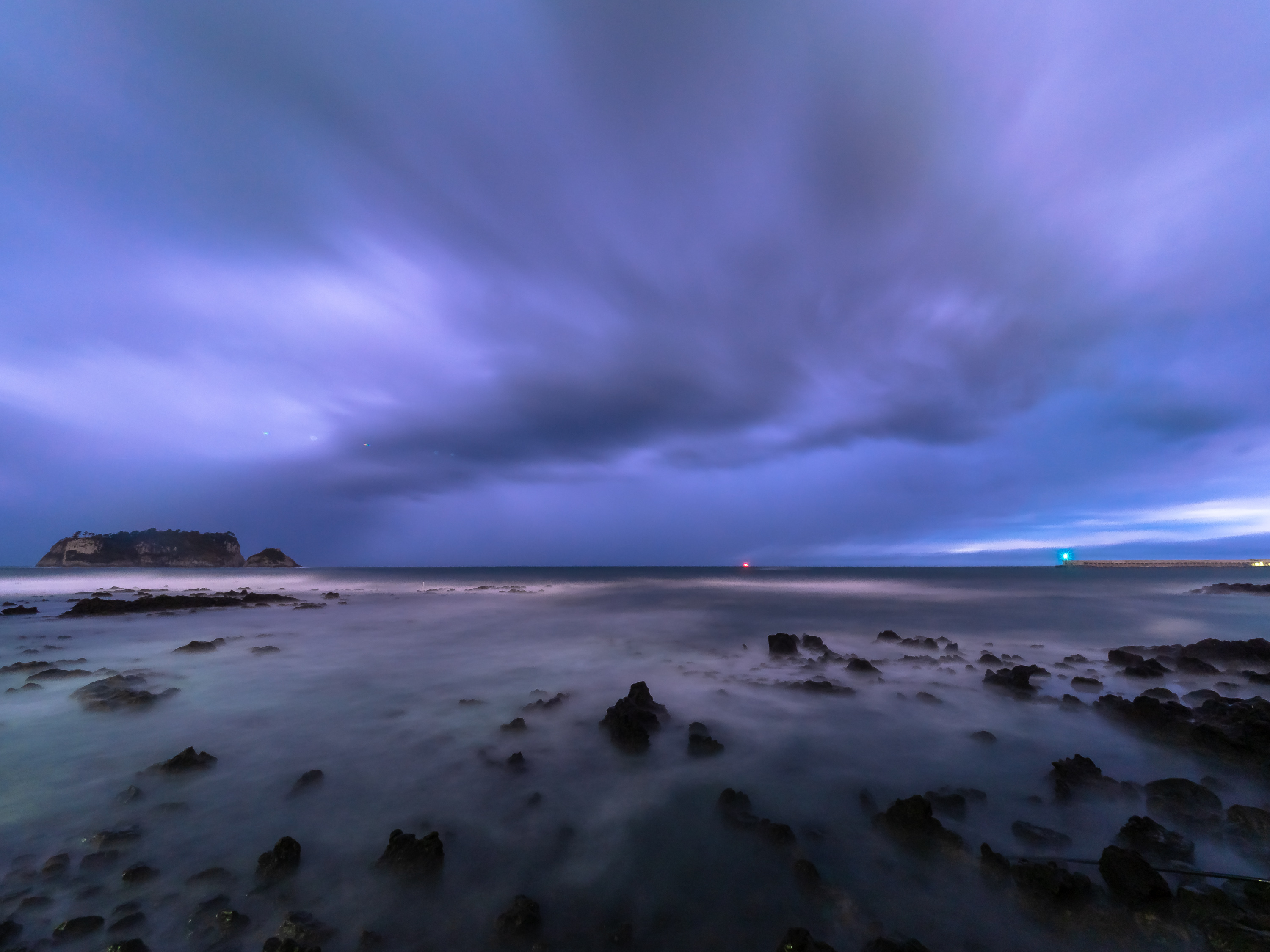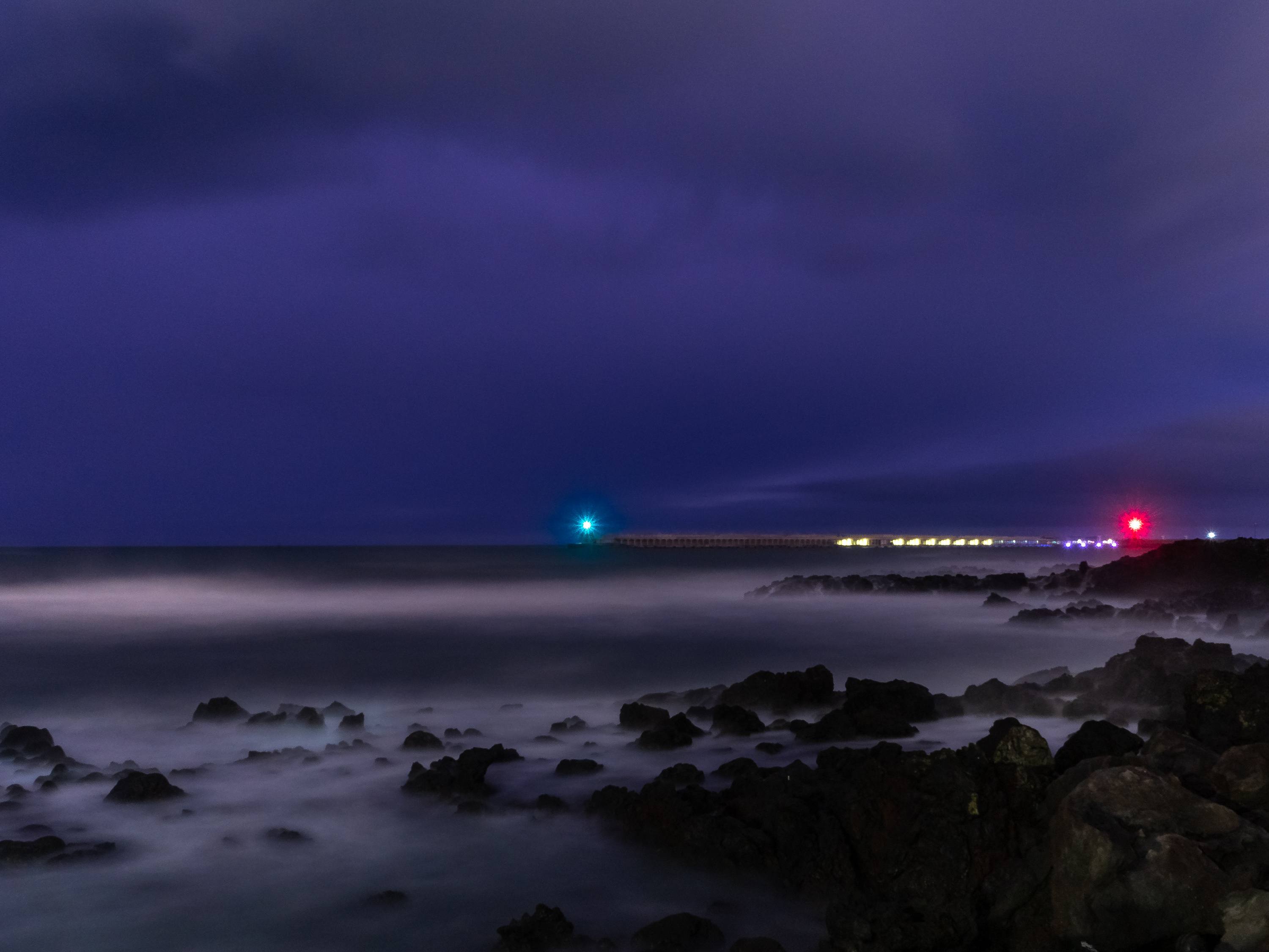바다가 잘 보이는 곳에 삼각대를 놓고 사진을 찍었습니다. 태풍의 여파로 파도가 아직 거칠고 구름도 자욱한데 그 풍경이 굉장히 다이내믹하더라고요. 저 멀리 보인 부두와 등대도 이국적이었습니다. 제가 좋아하는 사진가 아리 그뤼에르의 사진이 생각났던 멋진 풍경이었어요. 그래서 시간이 가는 게 너무 아쉽더라고요.