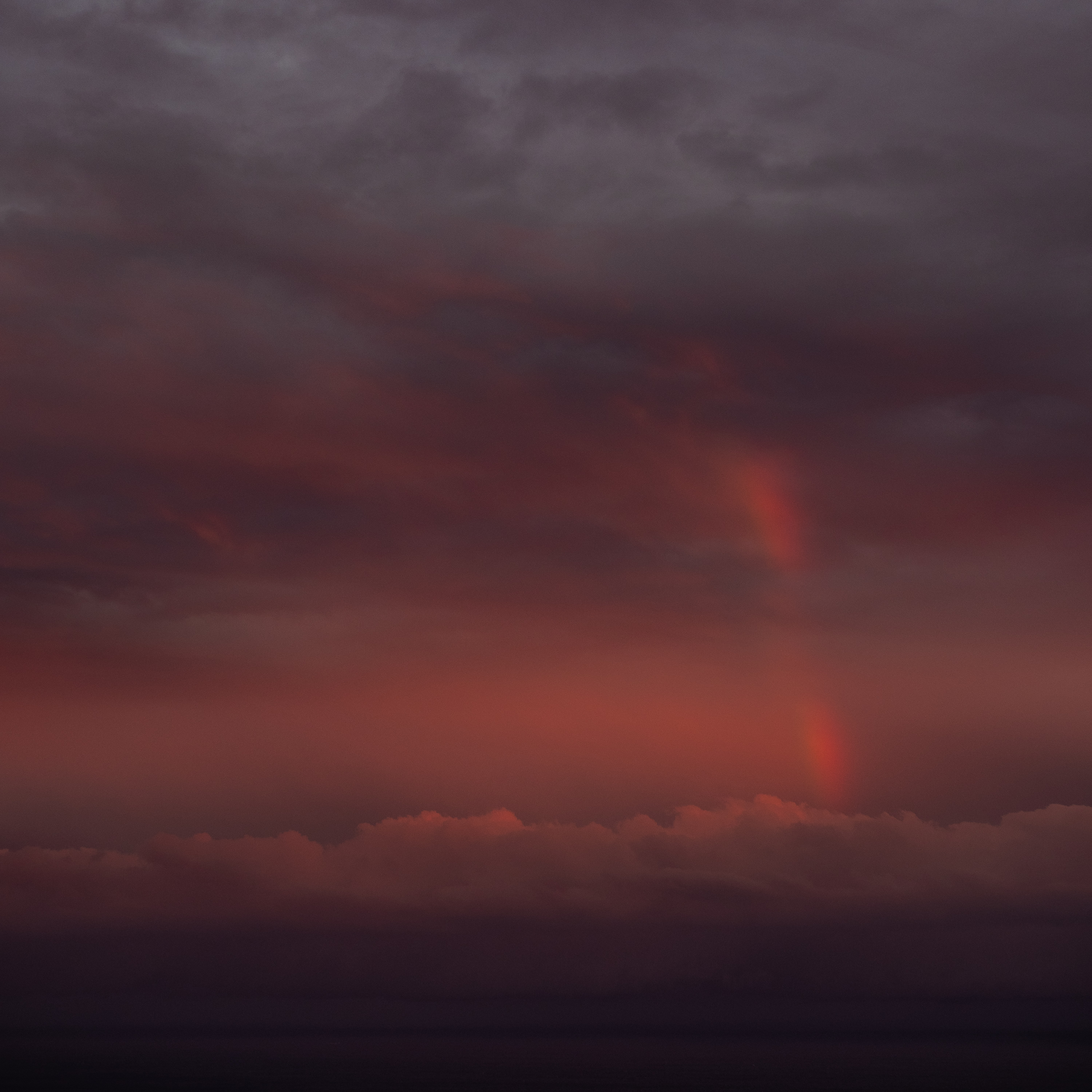 이 날 노을이 절정에 이르렀을 때 사방의 모든 풍경이 붉게 물들었고, 해 반대편 서귀포 바다 위에는 무지개가 떴습니다. 이 두 장면이 이 날 저녁 노을 쇼(?) 중에 가장 기억에 남아요. 제주 하면 당연히 수평선의 일몰을 생각했는데, 오름도 멋진 뷰 포인트였습니다.