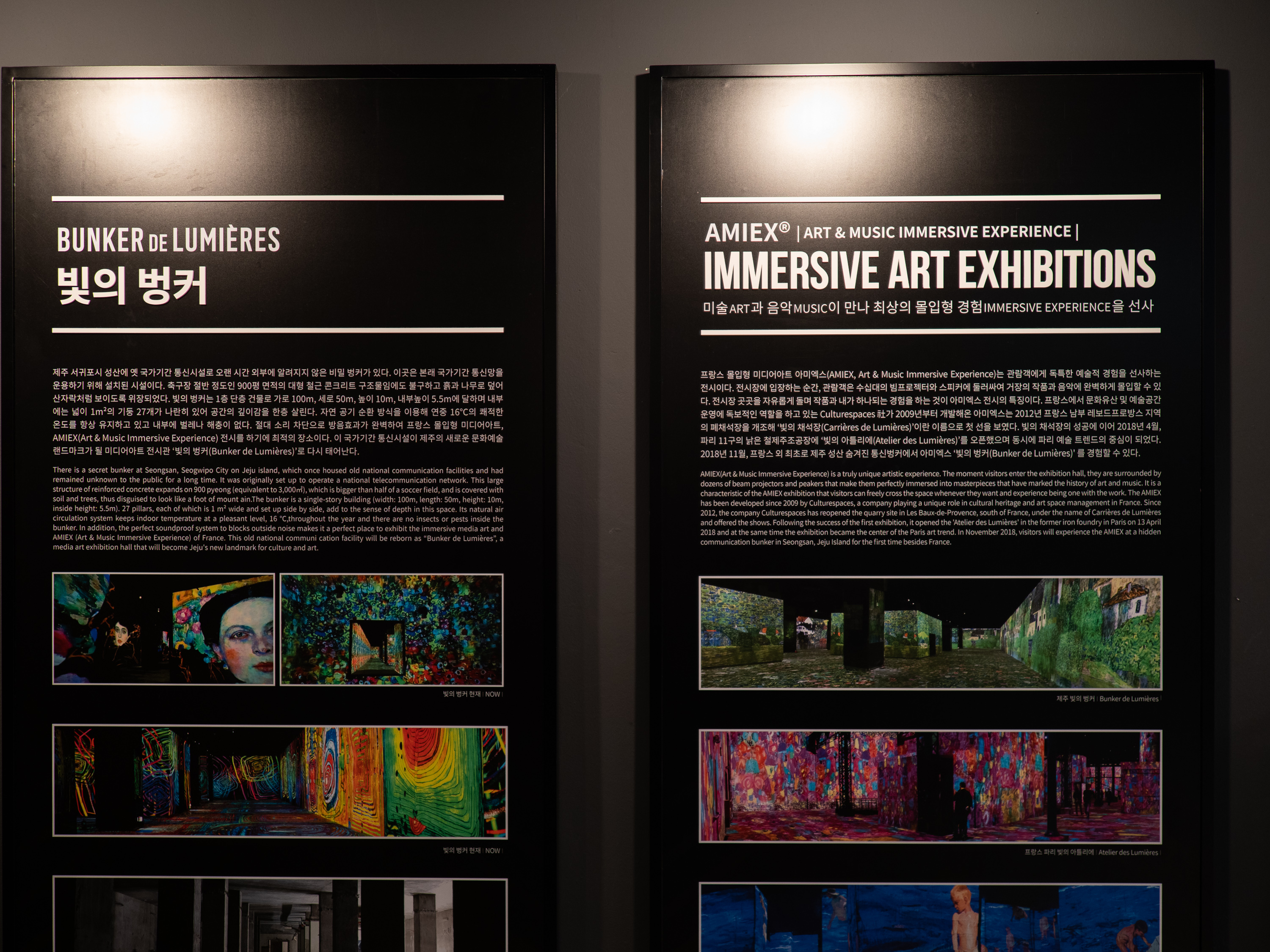 제주 현지에서 활동하는 작가의 소개로 찾은 빛의 벙커는 과거 국가 기간 통신 시설로 활용되던 벙커를 개조한 전시 공간입니다. 뤼미에르 계열 전시장은 유럽 여행할 때 종종 만난 적이 있는데 제주에서 보니 더욱 반갑습니다. 축구장 절반 정도의 크기인 900평 면적의 대형 철근 콘크리트 건축물의 벽과 기둥, 바닥에 예술 작품을 빛의 형태(빔 프로젝트)로 채우는 방식이 무척 신선합니다. 서귀포시 성산읍에 있으니 근처 여행 일정이 있으신 분들은 다녀오시면 색다른 경험을 하실 수 있을 거예요.