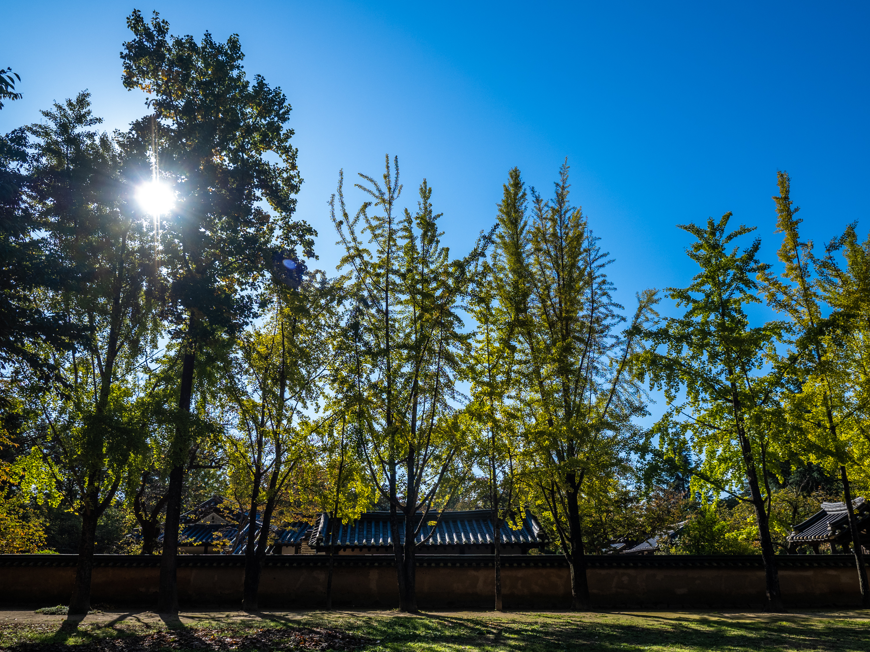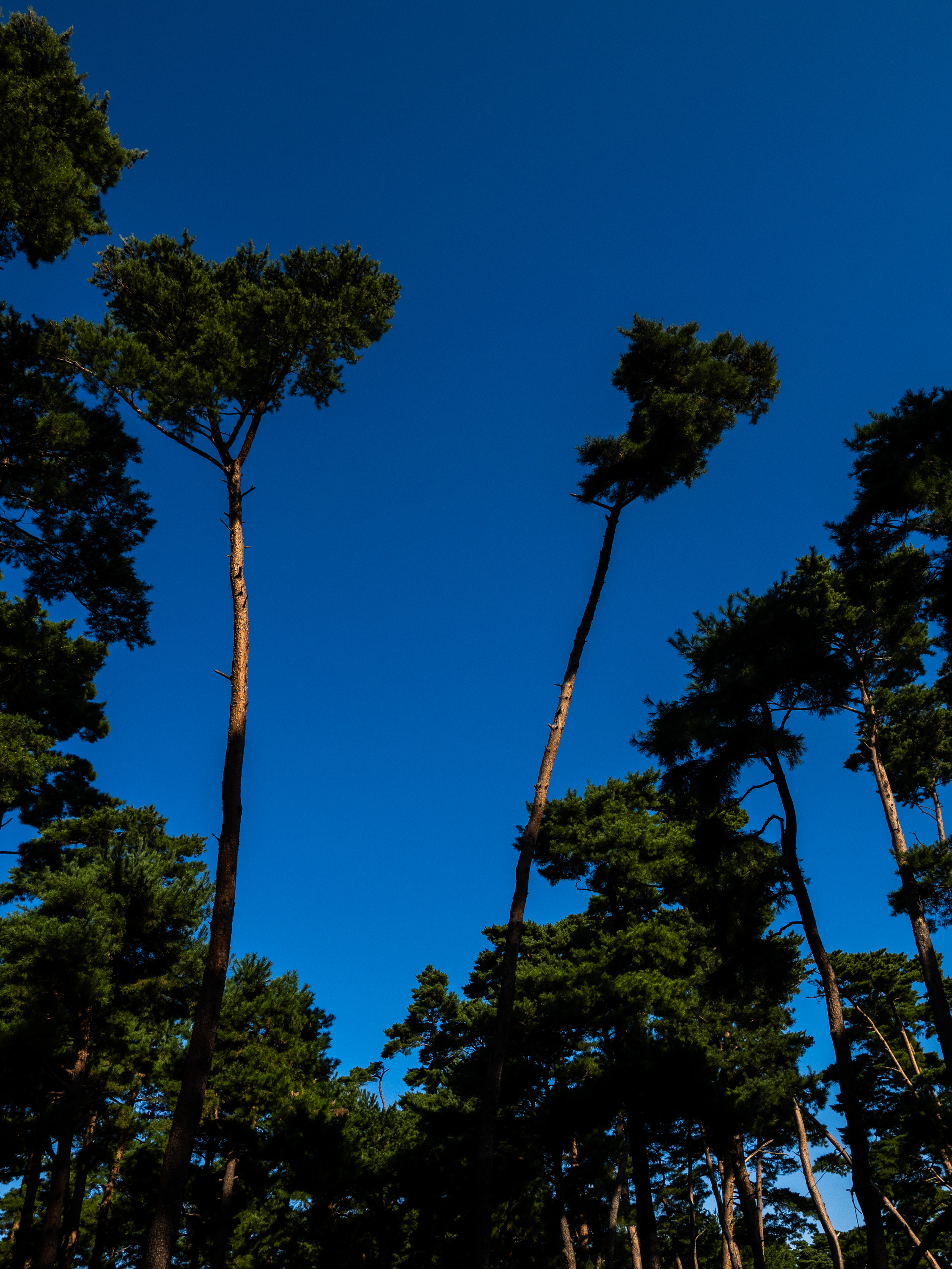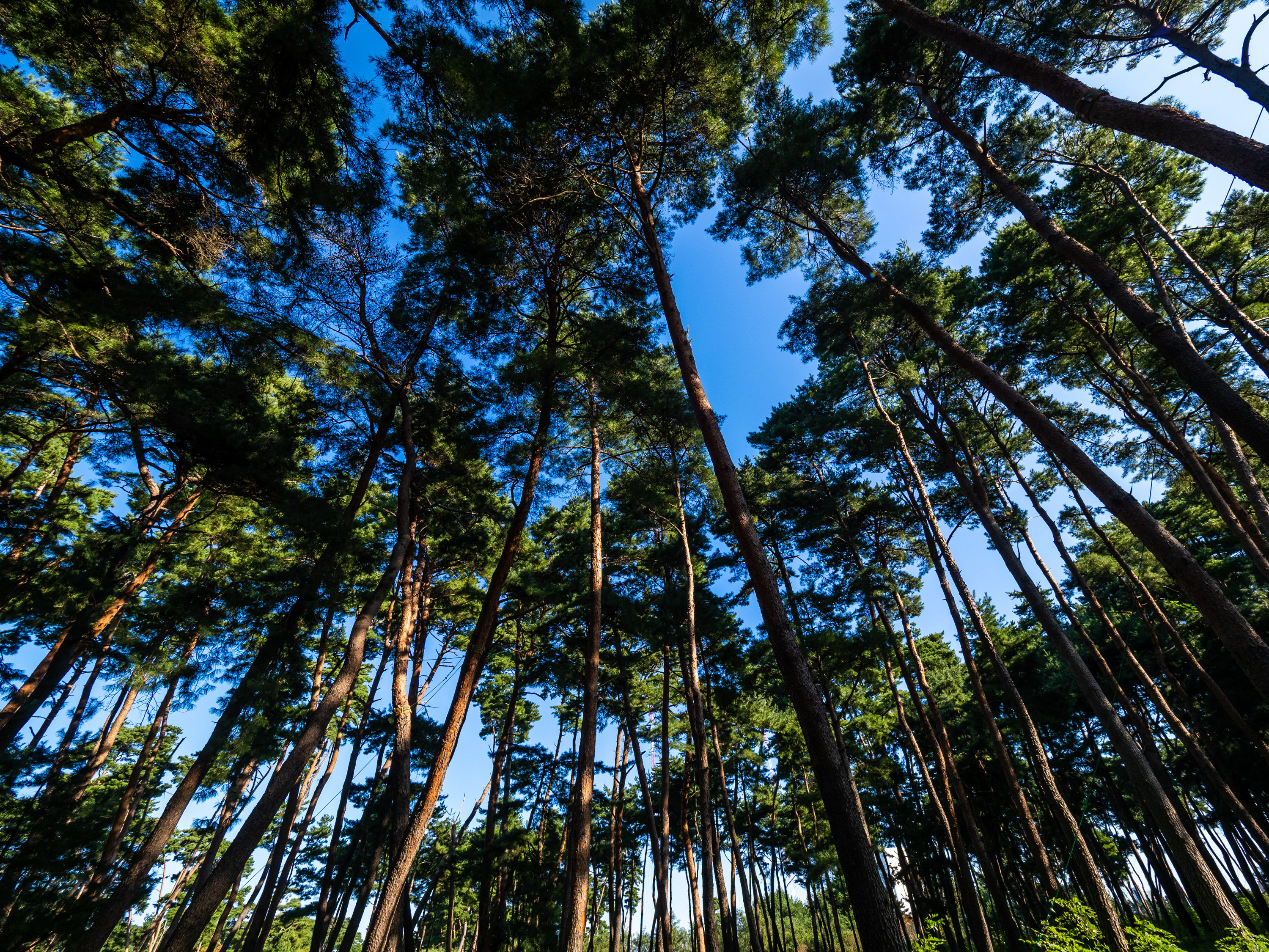 까마득히 높은 소나무에 둘러싸여 있으면 바람과 바람에 흔들리는 숲의 소리밖에 들리지 않고, 그 사이로 보이는 파란 하늘 덕분에 생각과 마음이 맑아지는 듯한 기분이 듭니다. 이 감동을 효과적으로 담으려면 광활한 초광각 렌즈로 머리 위 풍경을 담거나, 어안 렌즈로 독특한 프레임을 구성해보는 것도 좋겠네요. 환한 아침의 빛을 따라 시선을 움직이는 것도 좋겠고요
