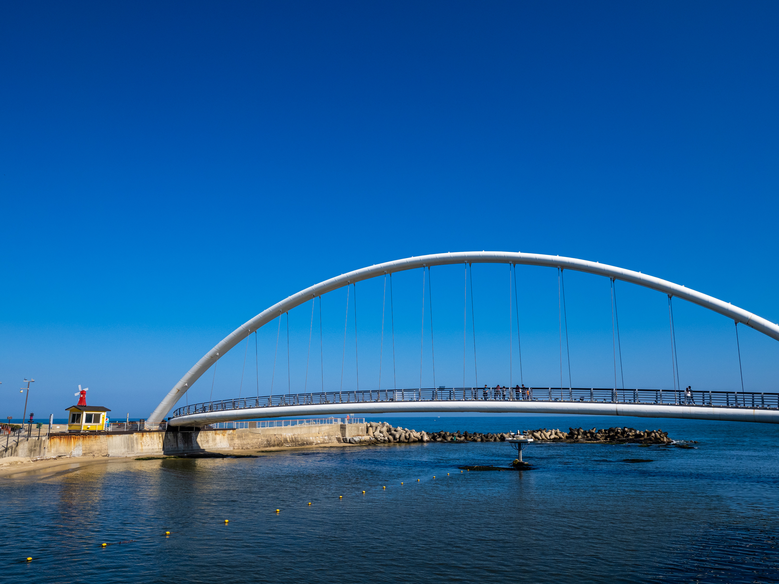경포보다 소박한 해변이 언제고 언제까지고 머물기 좋아서 늘 여기 머물다 갑니다. 북쪽으로 경포, 남쪽으로 안목이 있지만 여기만큼 설레진 않습니다. 유독 함께 온 청춘들이 많은 해변이라 저도 괜히 가슴이 뛰는지도 모르겠어요. 모래사장 입구에는 사진 찍기 좋은 액자형 구조물이 띄엄띄엄 서 있어서 동해 여행 인증샷 찍기에도 좋습니다. 저녁에는 솟대 다리가 조명으로 물드니 만약 숙소를 이 주변으로 결정하셨다면 밤바다 산책을 다니시는 것도 좋고요.