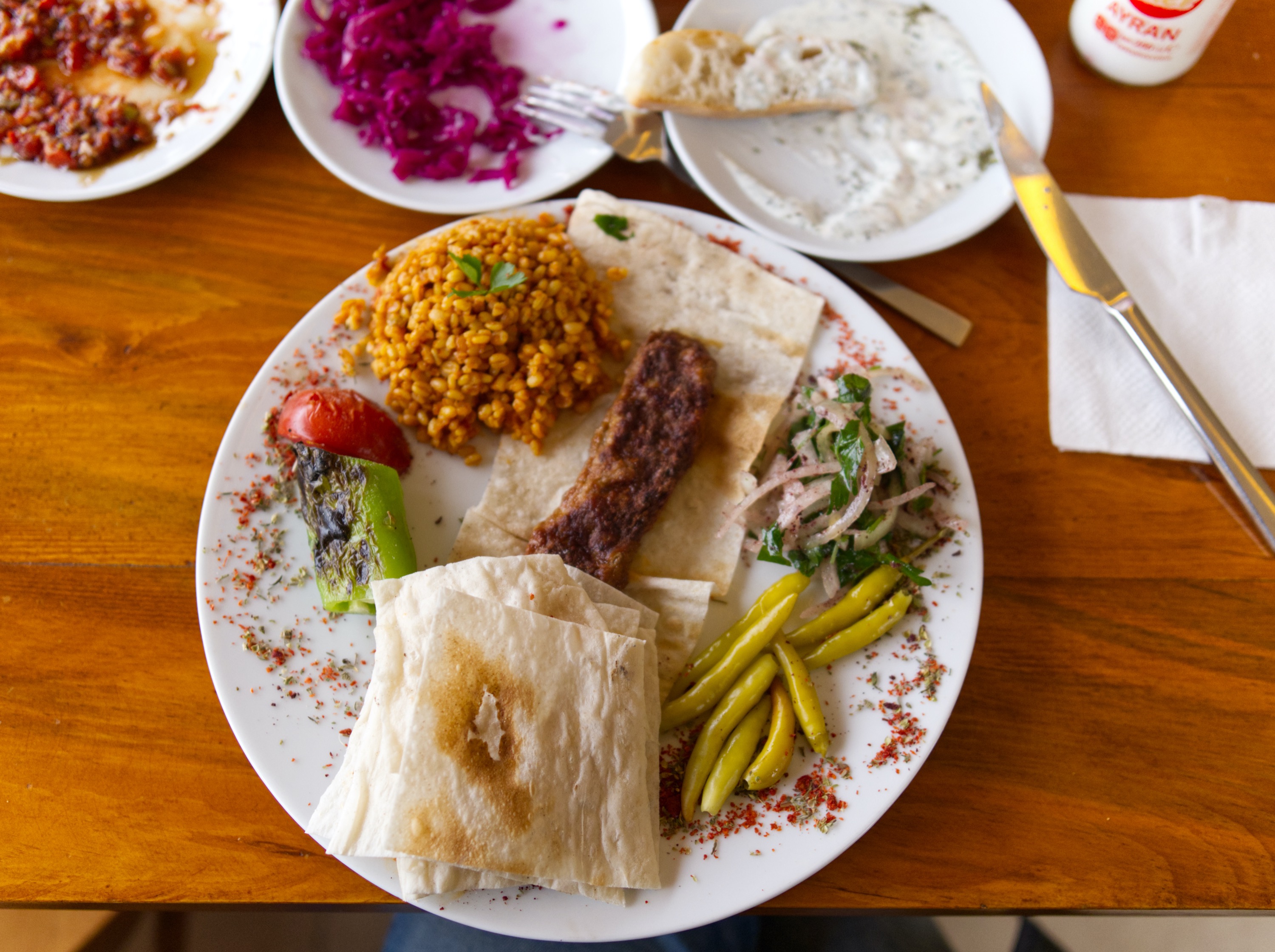 또 다른 케밥은 카파도키아, 괴레메에서 현지인에게 추천 받아 먹었습니다. 터키 남부 아다나 지역에서 시작한 아다나 케밥인데 역시 모양새가 우리가 알고 있는 것과 꽤 많이 다르죠? 다진 양고기를 구워낸 뒤 얇은 빵, 채소와 함께 먹는 음식입니다. 고추와 고춧가루, 향신료가 있어서 생각보다 매콤해서 한국인 입맛에 잘 맞을 것 같더라고요. 저렇게 푸짐한 양에 가격은 단돈 6000원 정도였어요. 못다이룬 열기구의 꿈을 향해 다시 카파도키아에 방문한다면 이집도 꼭 다시 가고 싶어요.