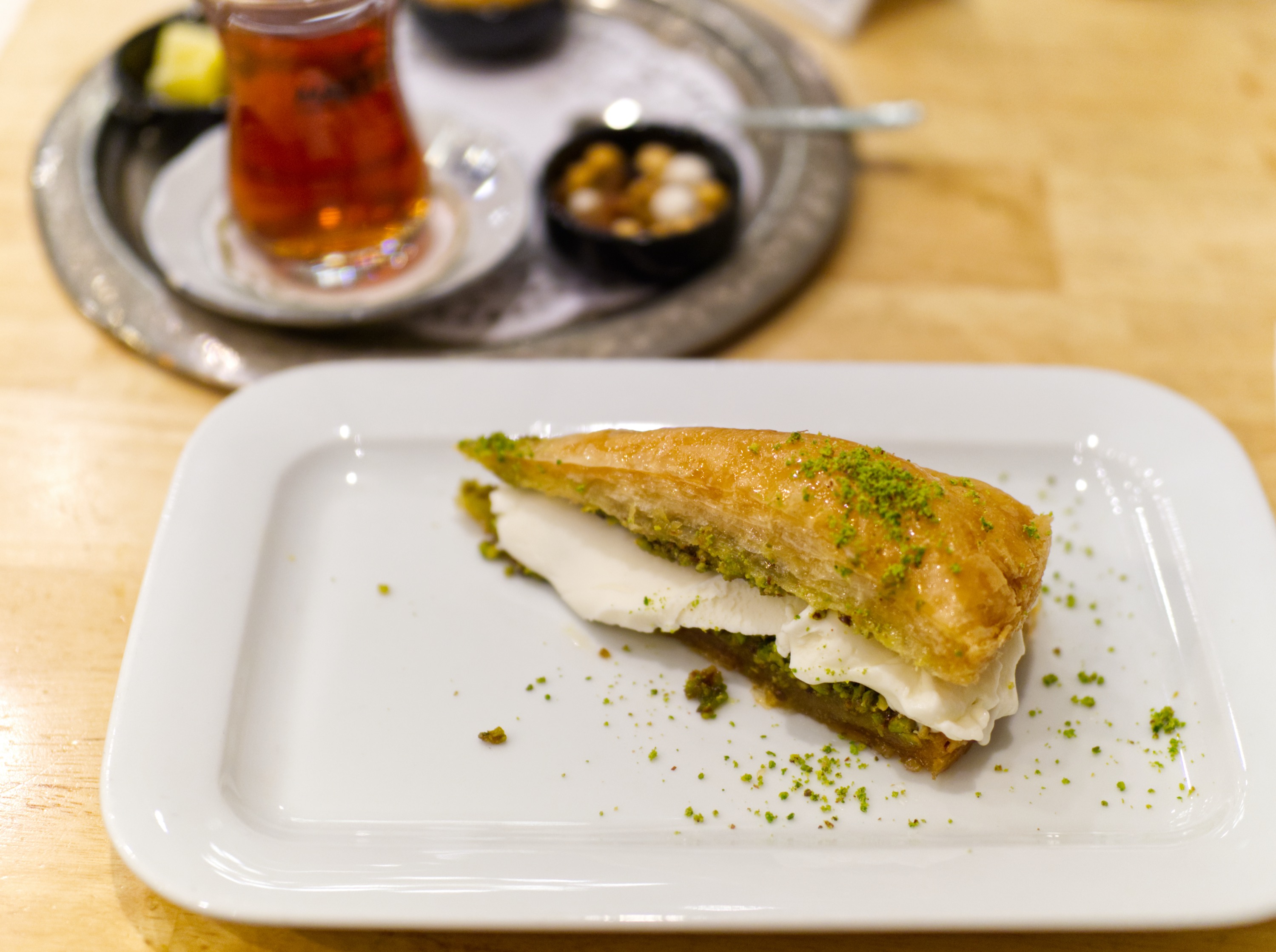 바클라바는 얇은 반죽을 겹겹이 쌓고 그 안에 견과류를 넣어 구운 뒤, 설탕 시럽에 절여 먹는 디저트입니다. 생각만 해도 이가 아플 정도인데요, 실제로도 꽤나 달아서 놀랐습니다. 거기에 터키 아이스크림까지 넣었으니 얼마나 달지 상상이 가시죠? 단 디저트를 좋아하는 저도 버거울 정도로 단맛이 강했습니다. 그래서 홍차를 시켜 함께 먹었습니다. 세계 1위 홍차 소비국 터키의 비결이 바로 이 달디 단 디저트가 아닐까 싶어요.