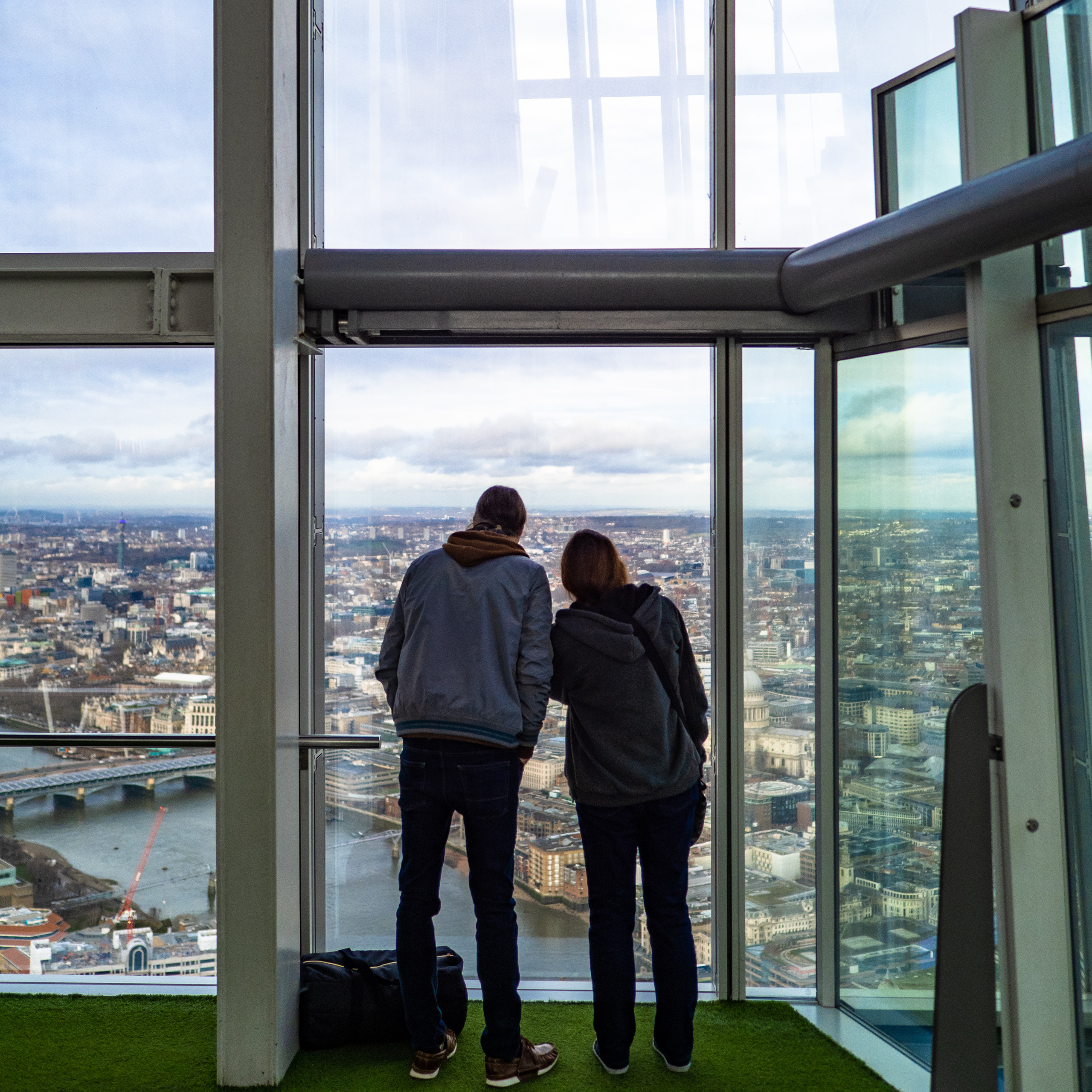 더 샤드의 전망대는 두 개 층으로 나뉘어 있습니다. 가장 윗층은 꼭대기가 오픈된 야외 공간으로 가장 높다는 상징적인 의미에 어울리는 곳이지만 고지대다보니 기온이 낮습니다. 그래서 그 아래 비교적 따뜻한 실내 전망대에서 감상하시는 것도 좋겠어요. 저는 추위를 타지 않으니 역시 가장 높은 곳으로 갑니다.