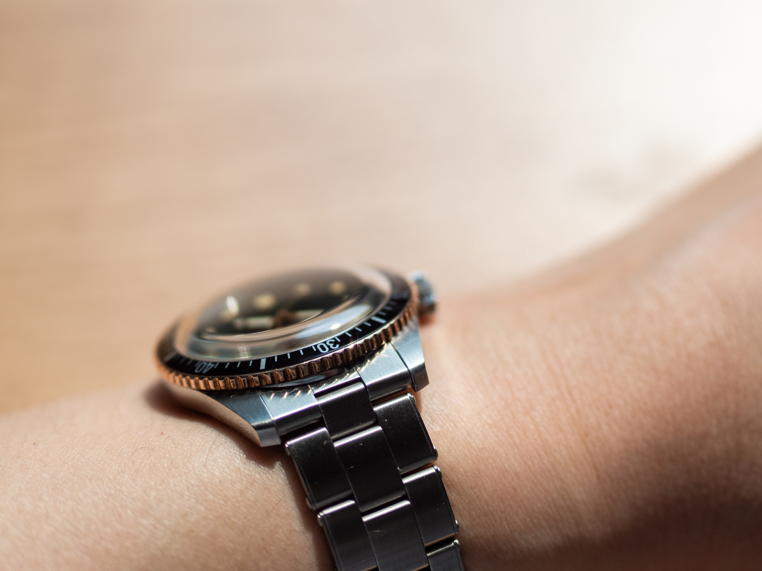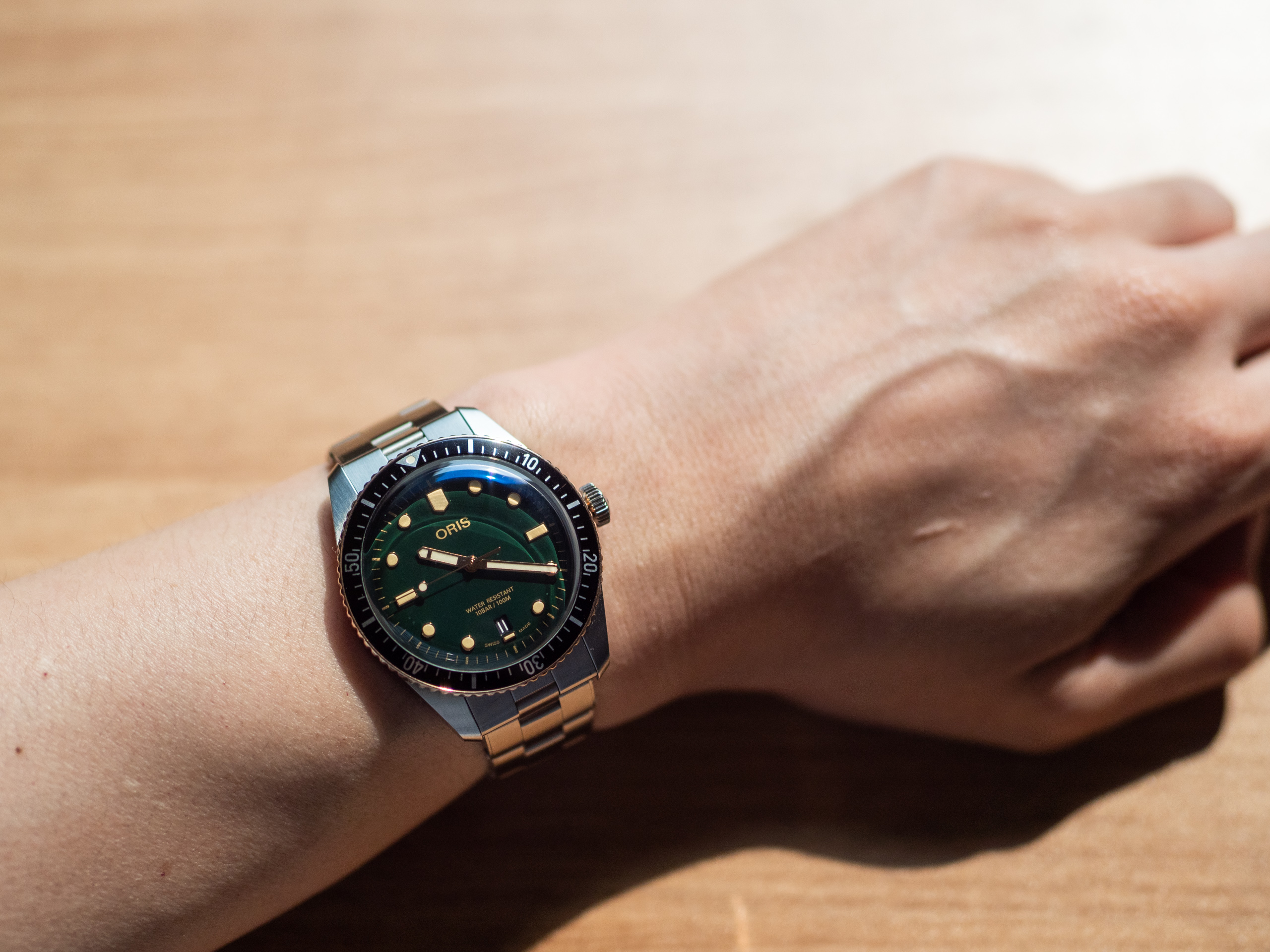 약 18mm 두께의 손목에 올린 사진입니다. 크지도 작지도 않은 적당한 크기입니다. 브레이슬릿의 일체감, 측면에서 보는 돔 글래스의 매력, 생각보다 가볍고 편한 스틸 브레이슬릿의 착용감이 첫인상으로 남았습니다. 빛을 받아 더 선명하게 보이는 그린 다이얼의 매력이야 뭐 기대만큼이고요.