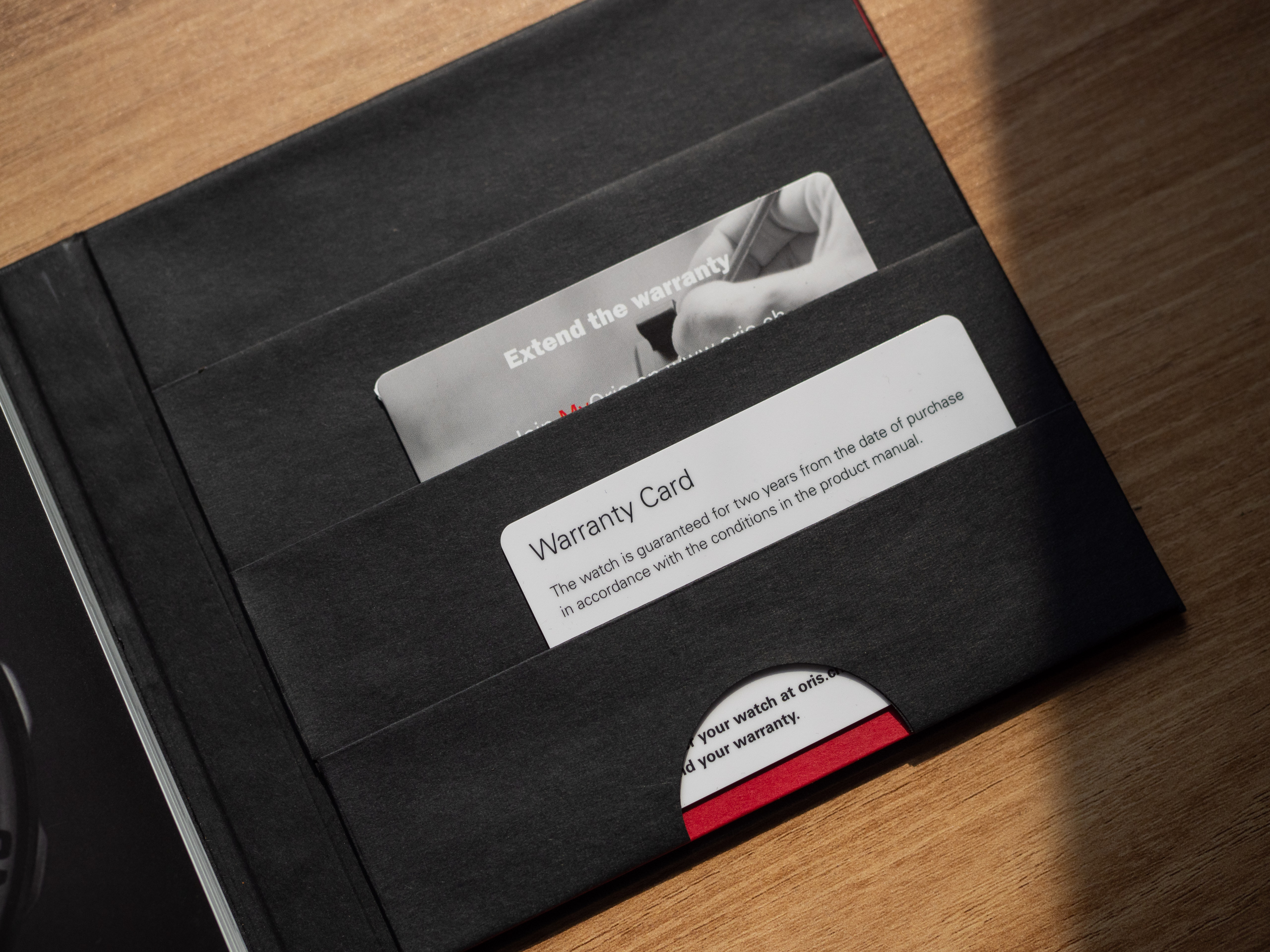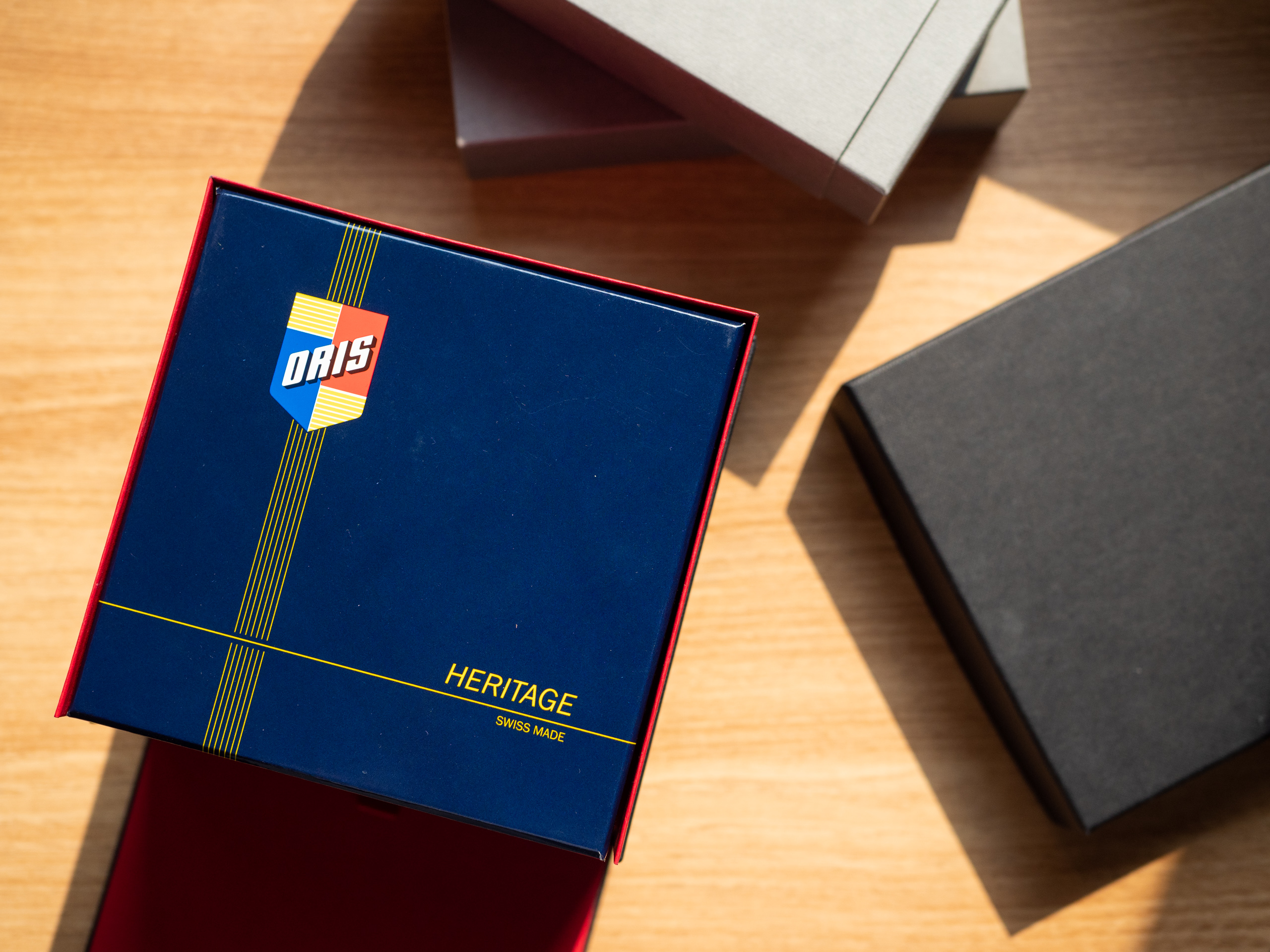 시계 만나기가 힘들 정도로 상자가 많습니다. 본박스를 보호하기 위한 흰색 외부 상자, 그걸 벗겨내면 검정색 상자, 또 그걸 열어야 진짜 제품 패키지가 나옵니다. 복각 모델인만큼 패키지 역시 옛날 느낌이 물씬 납니다. 왼쪽 상단 방패 로고가 과거의 오리스 로고라고 합니다.
