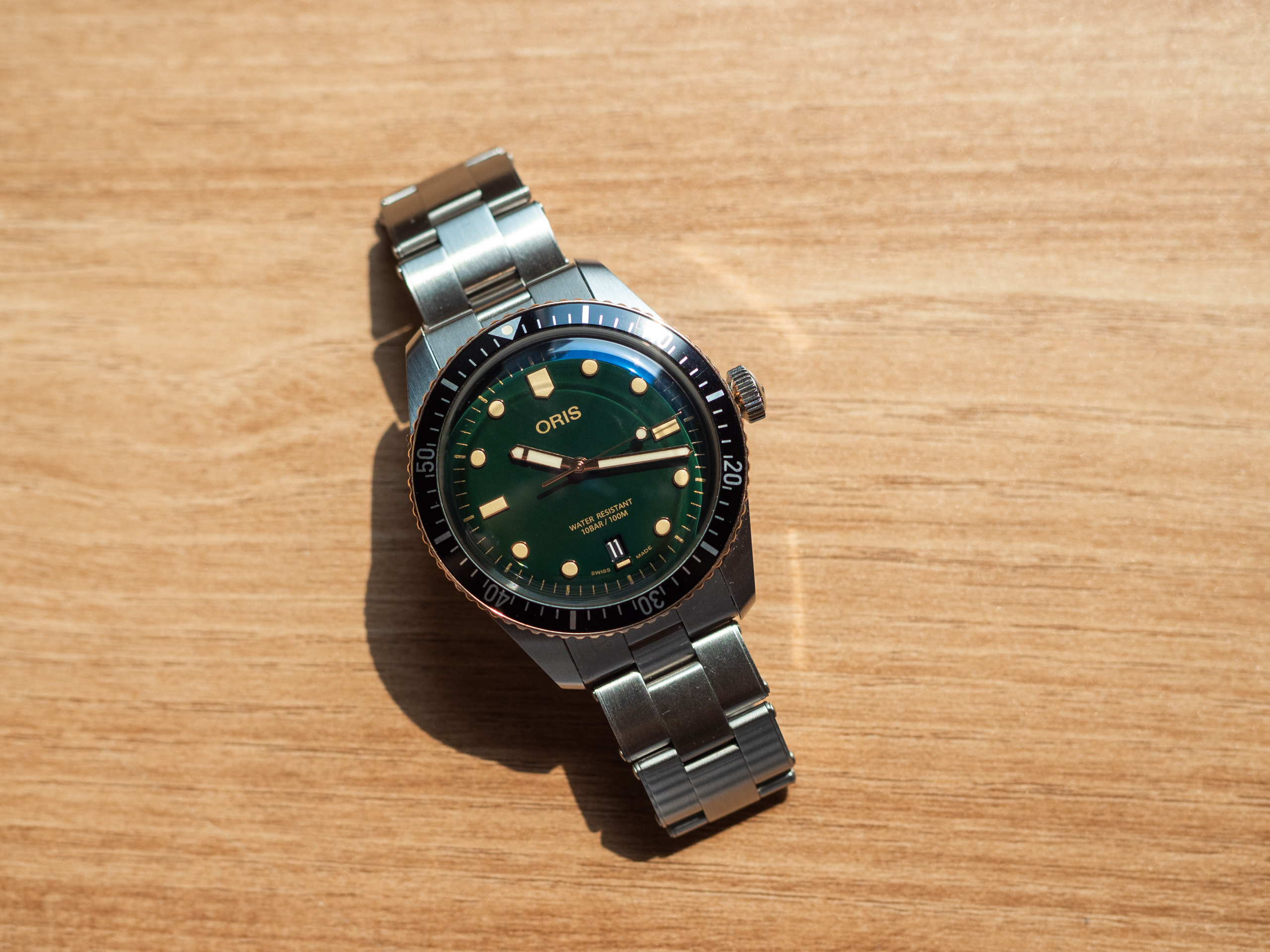원형 페이스와 그 주변 베젤 등의 기본적인 구성은 평범한 다이버워치 스타일이지만 원형 인덱스와 베젤 주변 청동 소재가 주는 빈티지한 느낌이 마음에 들었습니다. 그리고 무엇보다 그린 다이얼 모델의 자태에 반했죠. 녹색 페이스와 청동의 조화가 제 눈에는 정말 보기 좋았습니다.