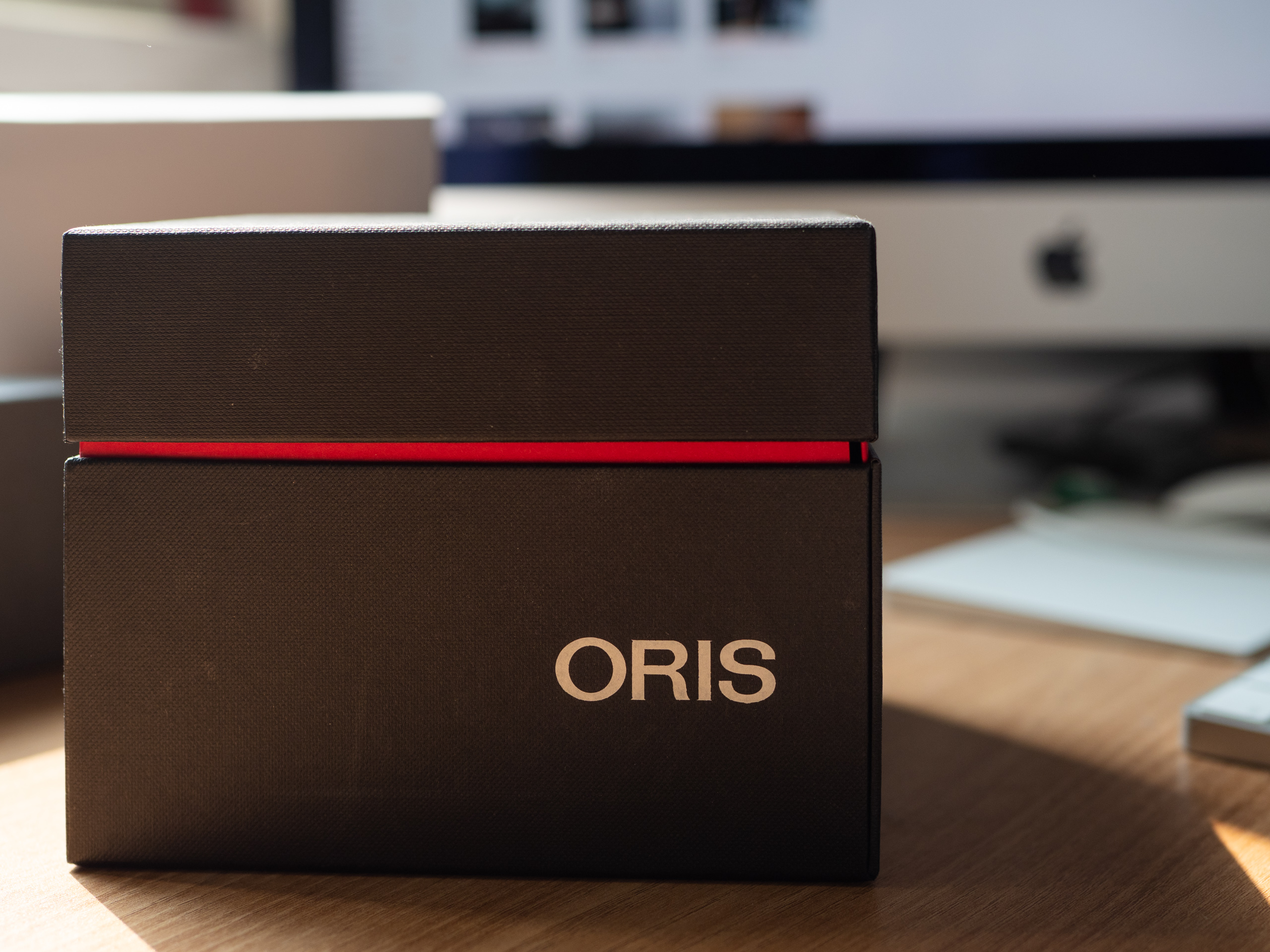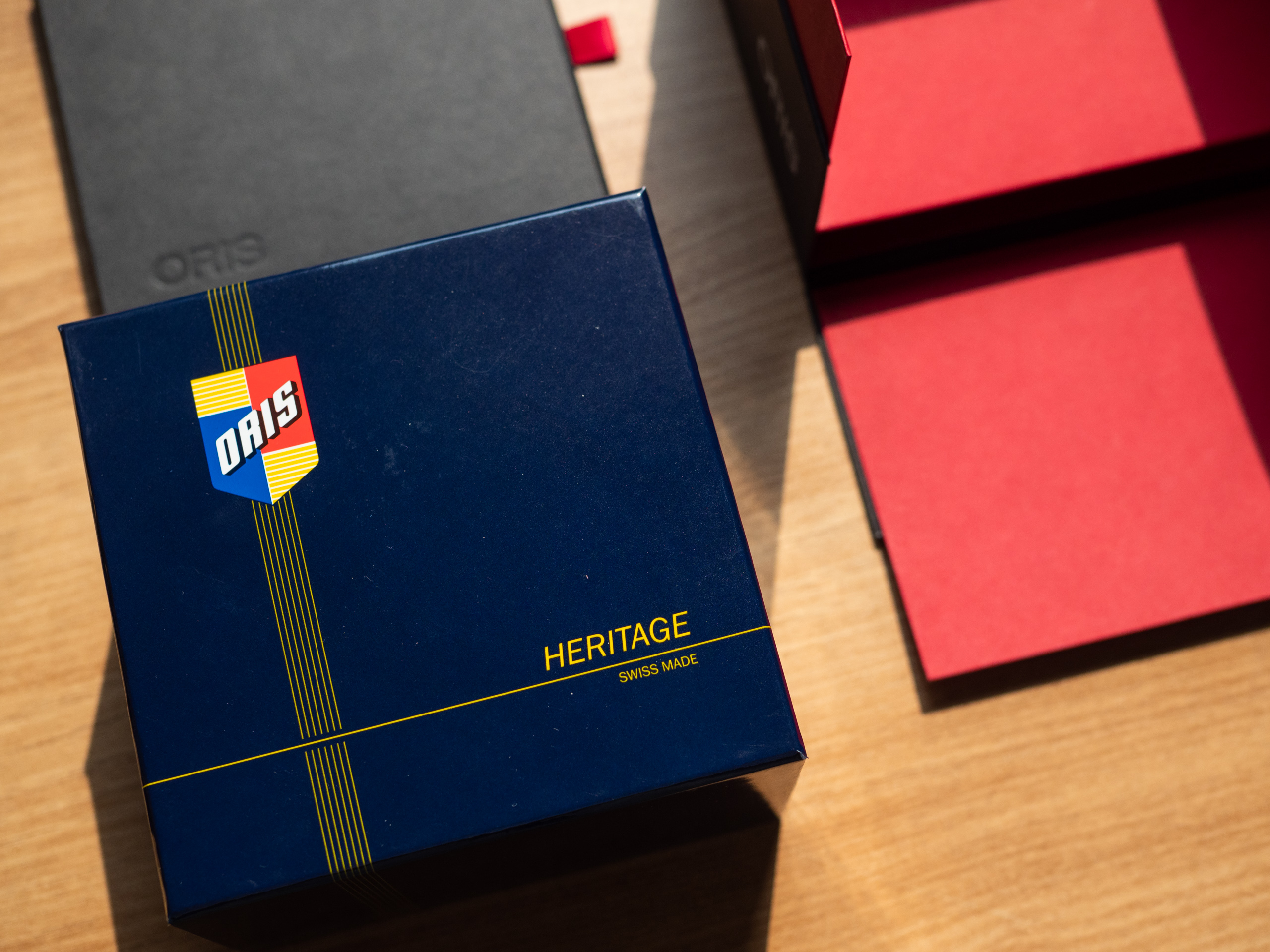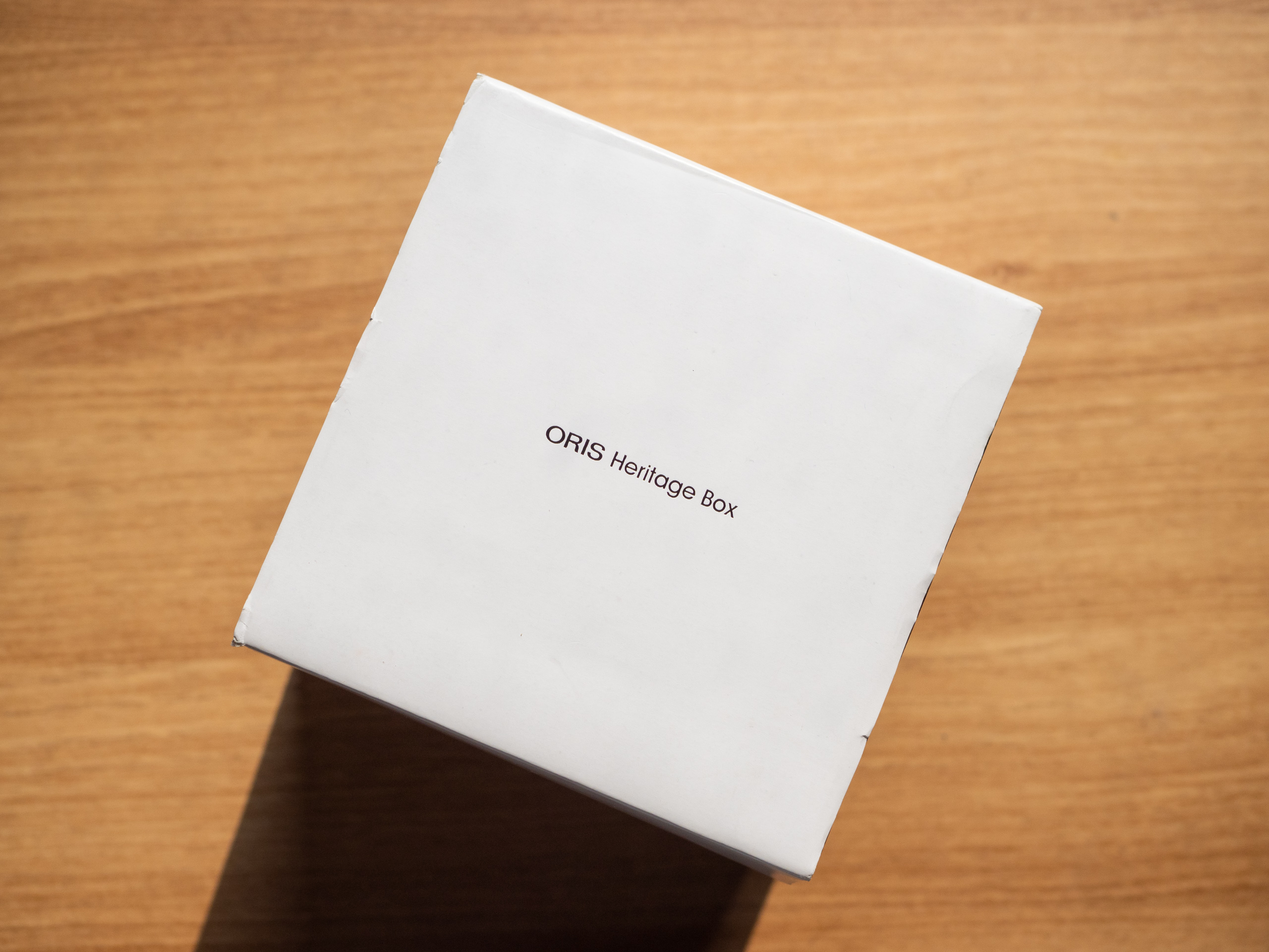 시계 만나기가 힘들 정도로 상자가 많습니다. 본박스를 보호하기 위한 흰색 외부 상자, 그걸 벗겨내면 검정색 상자, 또 그걸 열어야 진짜 제품 패키지가 나옵니다. 복각 모델인만큼 패키지 역시 옛날 느낌이 물씬 납니다. 왼쪽 상단 방패 로고가 과거의 오리스 로고라고 합니다.