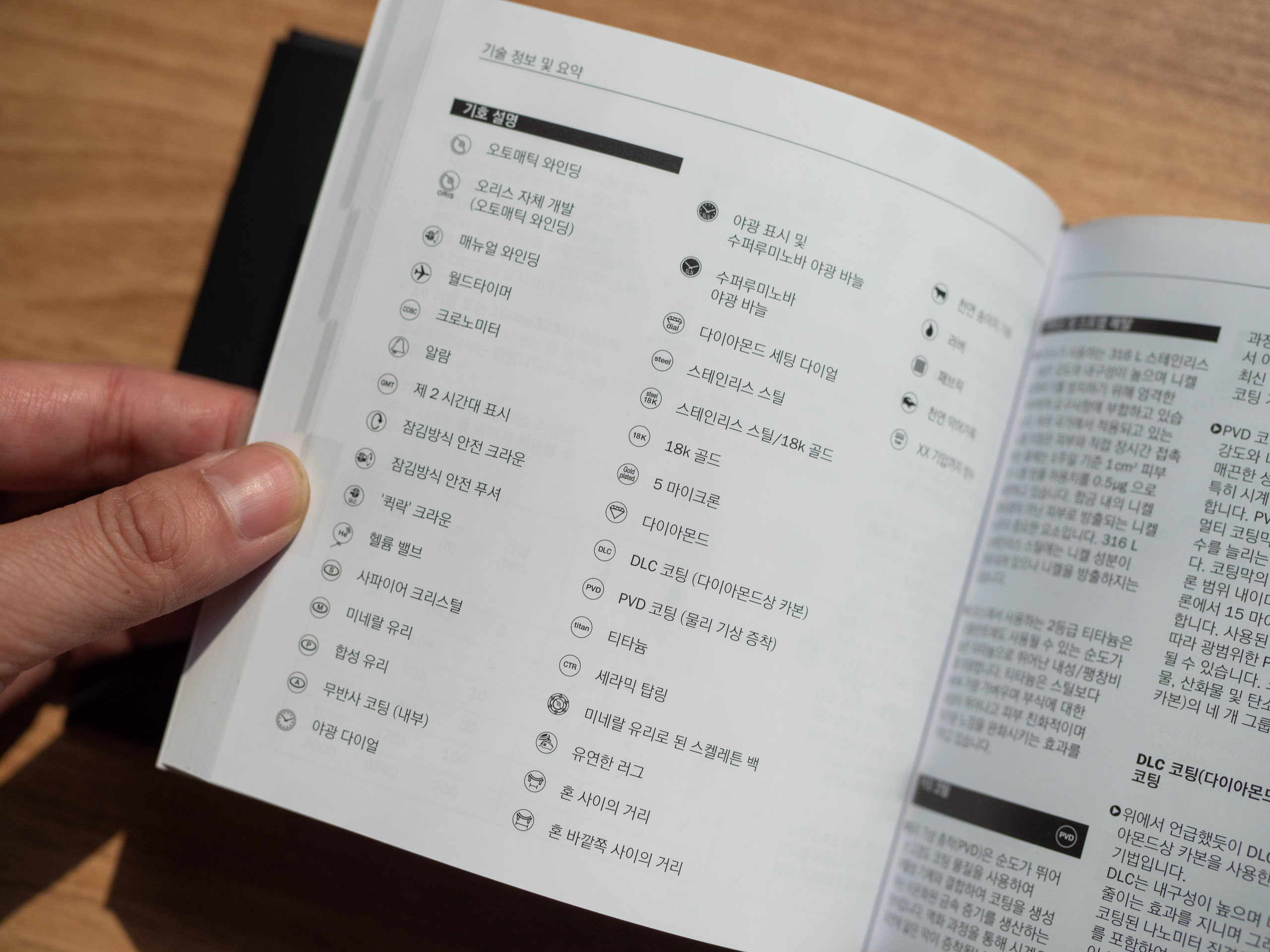 케이스 크기는 남성용 시계의 기준으로 여겨지는 40mm 입니다. 다만 베젤 때문에 실제 크기보다 조금 작아보이는 효과가 있습니다. 두께는 12.8mm로 오토매틱 무브먼트를 감안하면 두껍지도 얇지도 않은 평범한 수준입니다. 파워 리저브가 38시간으로 조금 짧은 편이고 방수 성능 역시 100m로 요즘 시계들에 비해 부족하게 느껴지지만 이 시계의 컨셉은 실제 다이버들의 시계라기보단 1960년대 다이버 시계의 스타일을 추구하는 현대인들의 액세서리입니다. 저도 이 시계를 차고 바다 속 깊이 뛰어들 것 같지는 않거든요.