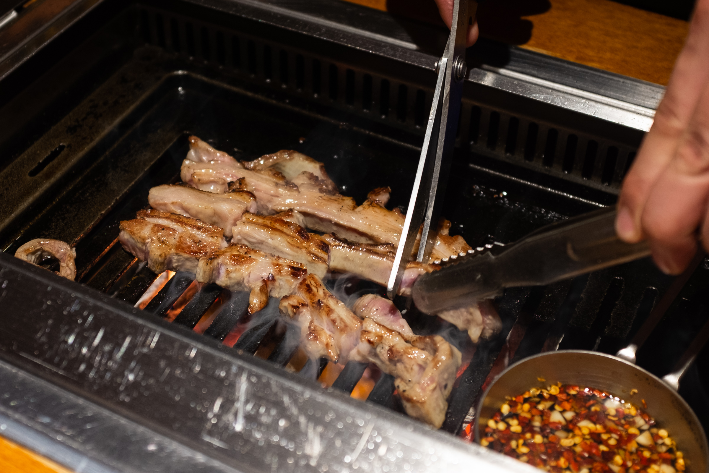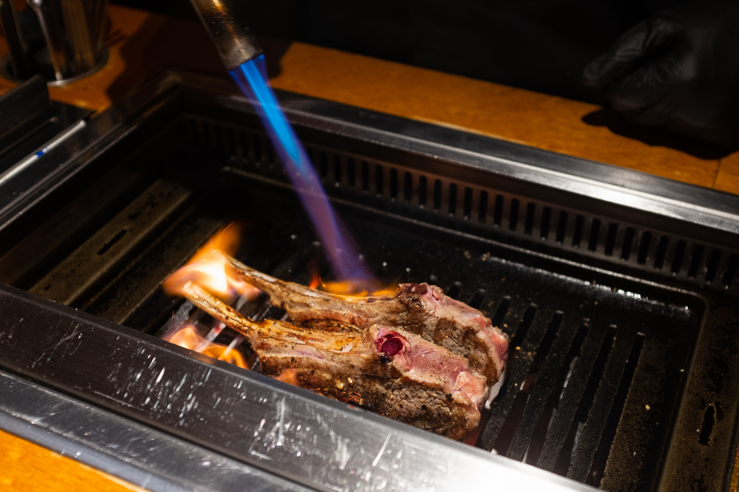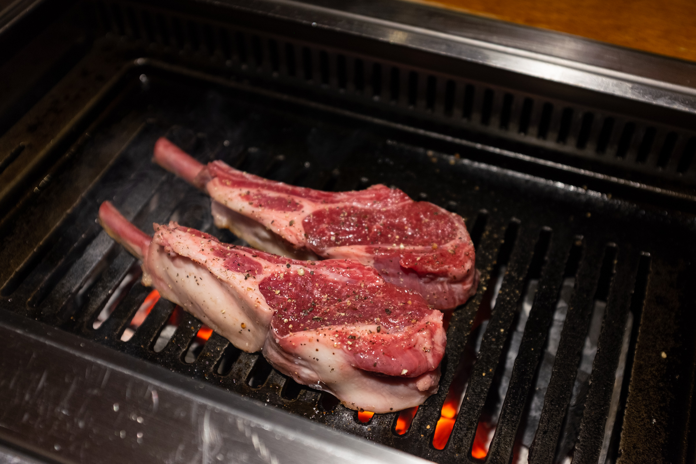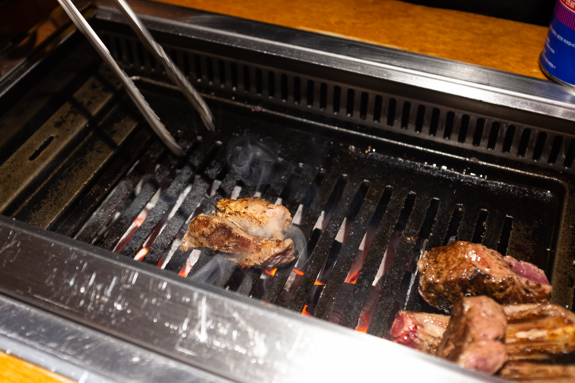 본격적인 구이의 시작은 양갈비입니다. 다른 집에선 양갈비를 마지막, 그러니까 하이라이트로 미뤄두는데 몇 번 다녀보니까 바로 맛있는 것부터 먹는 게 좋은 선택이더라고요. 첫 점의 행복을 극대화하는 거죠. 그리고 보통은 육향이 약한 부위로 시작해 점점 강한 쪽으로 가는 것을 추천하더군요. 양삼겹이 갈비보다 향이 더 강하다고 해서 갈비를 앞순서로 뒀습니다.