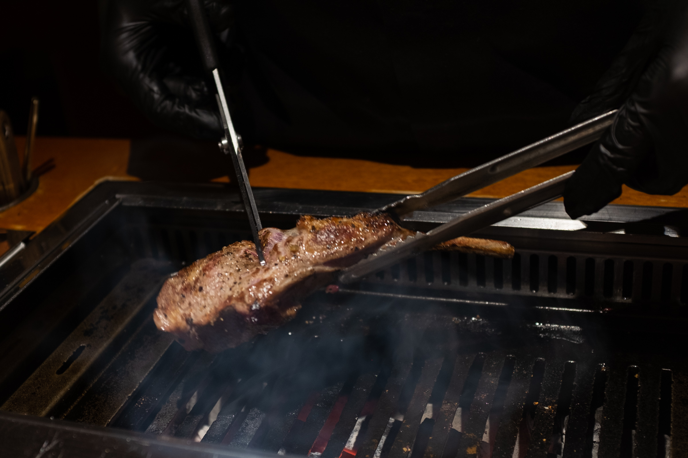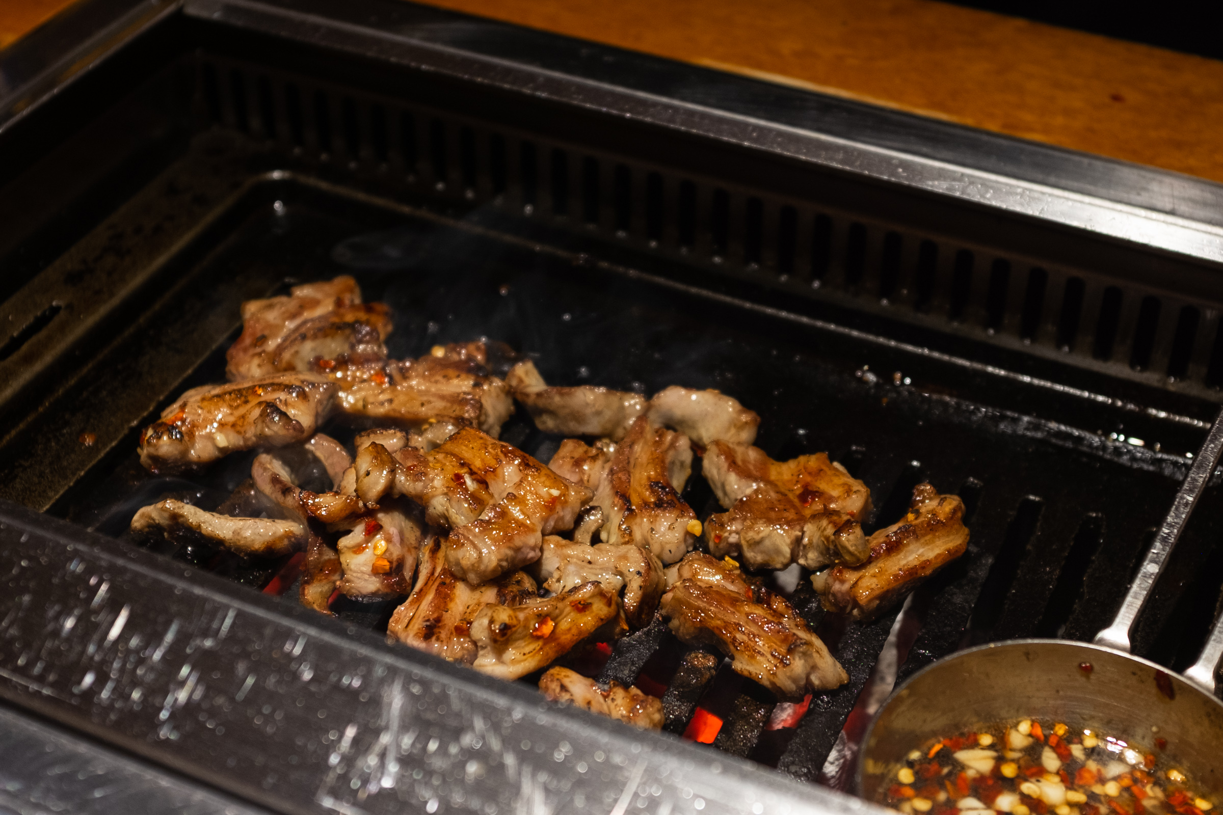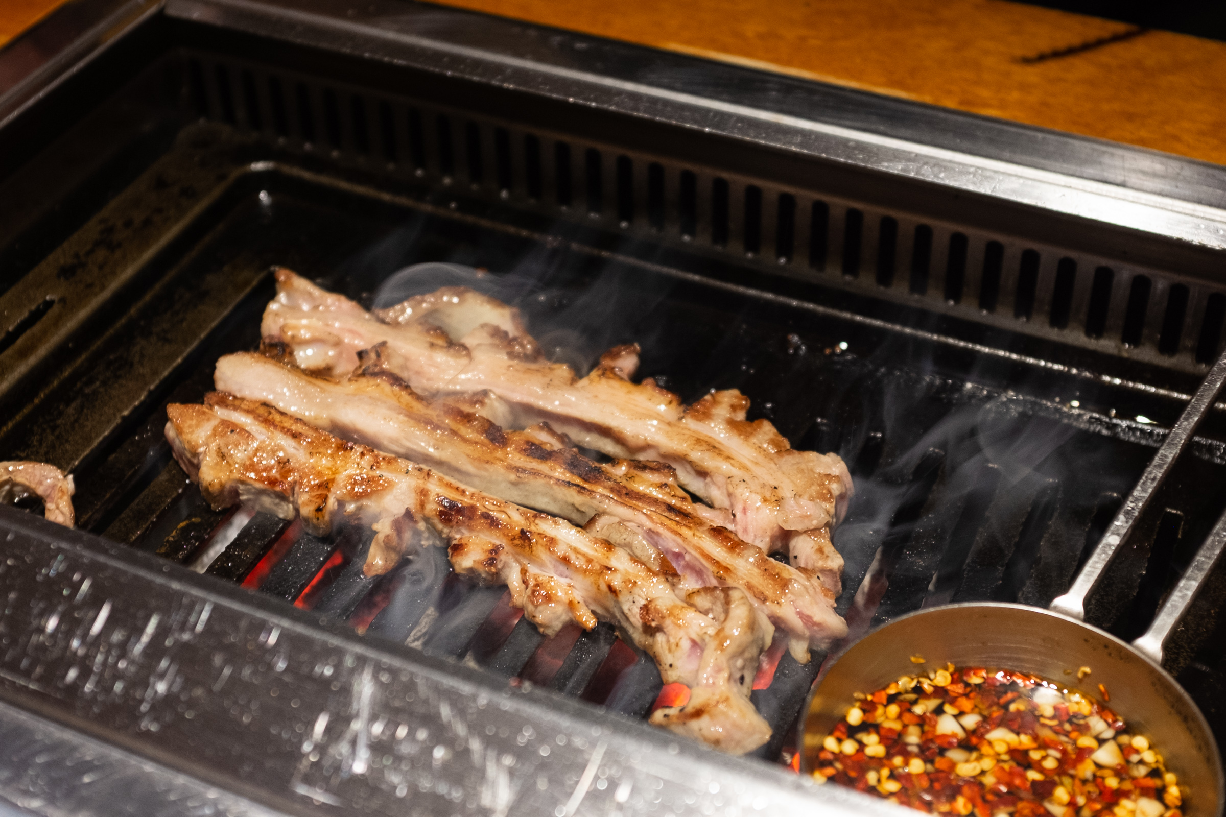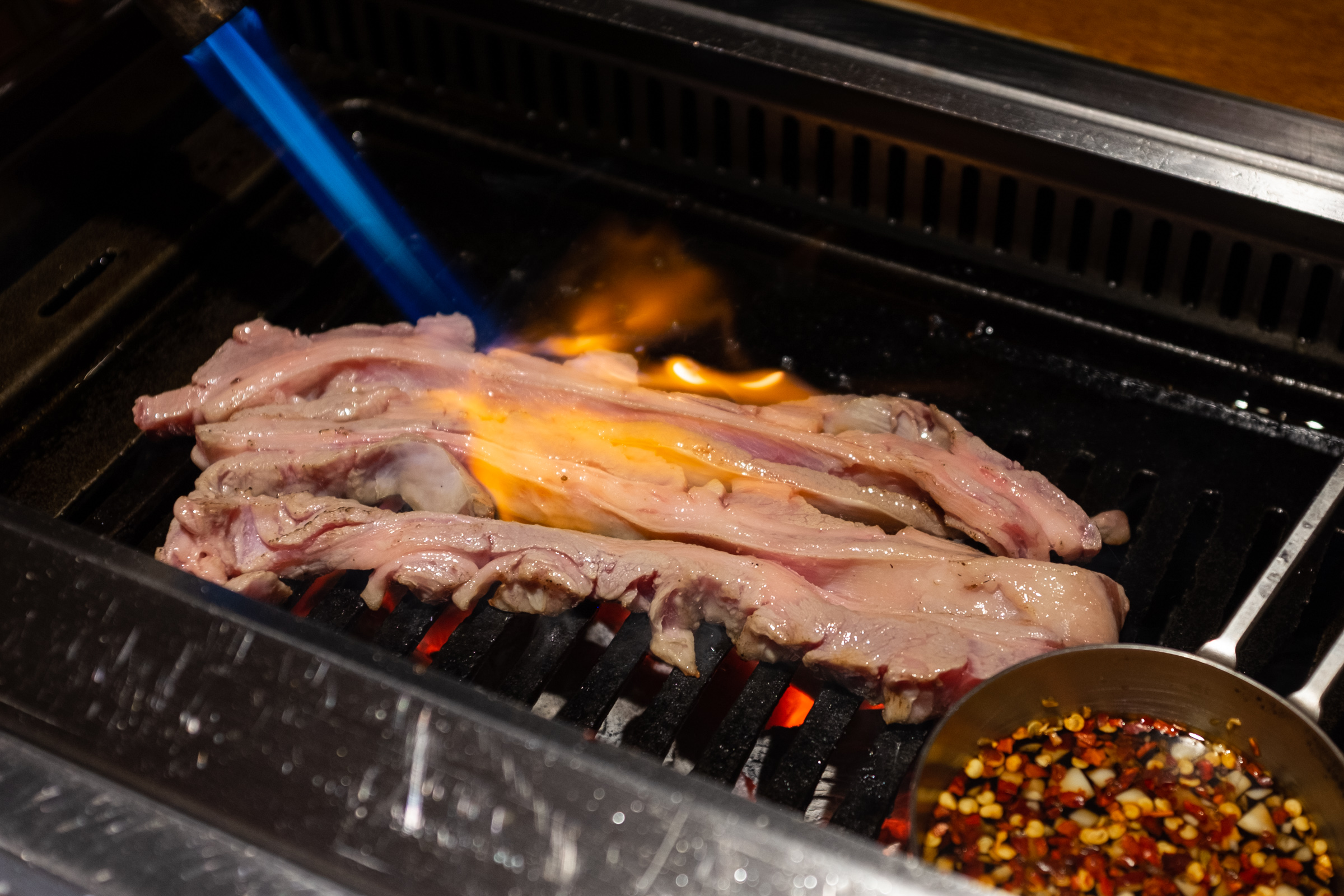 본격적인 구이의 시작은 양갈비입니다. 다른 집에선 양갈비를 마지막, 그러니까 하이라이트로 미뤄두는데 몇 번 다녀보니까 바로 맛있는 것부터 먹는 게 좋은 선택이더라고요. 첫 점의 행복을 극대화하는 거죠. 그리고 보통은 육향이 약한 부위로 시작해 점점 강한 쪽으로 가는 것을 추천하더군요. 양삼겹이 갈비보다 향이 더 강하다고 해서 갈비를 앞순서로 뒀습니다.