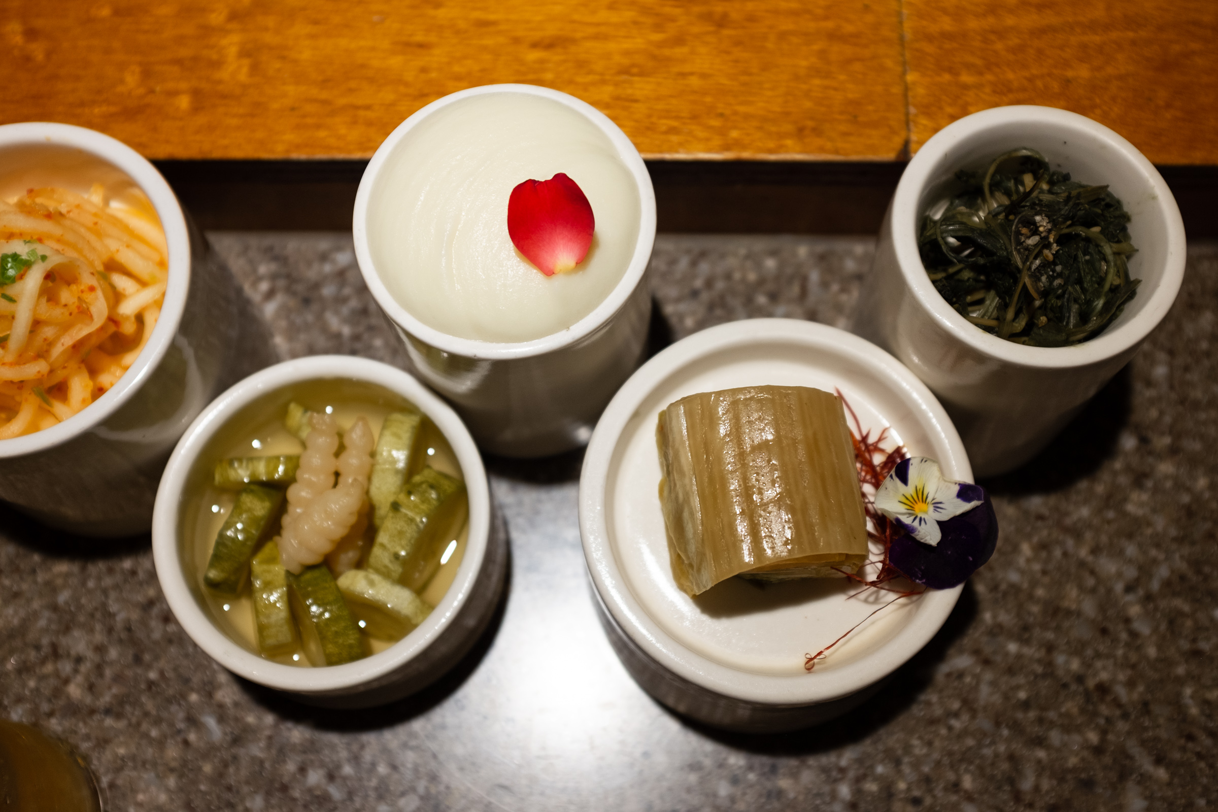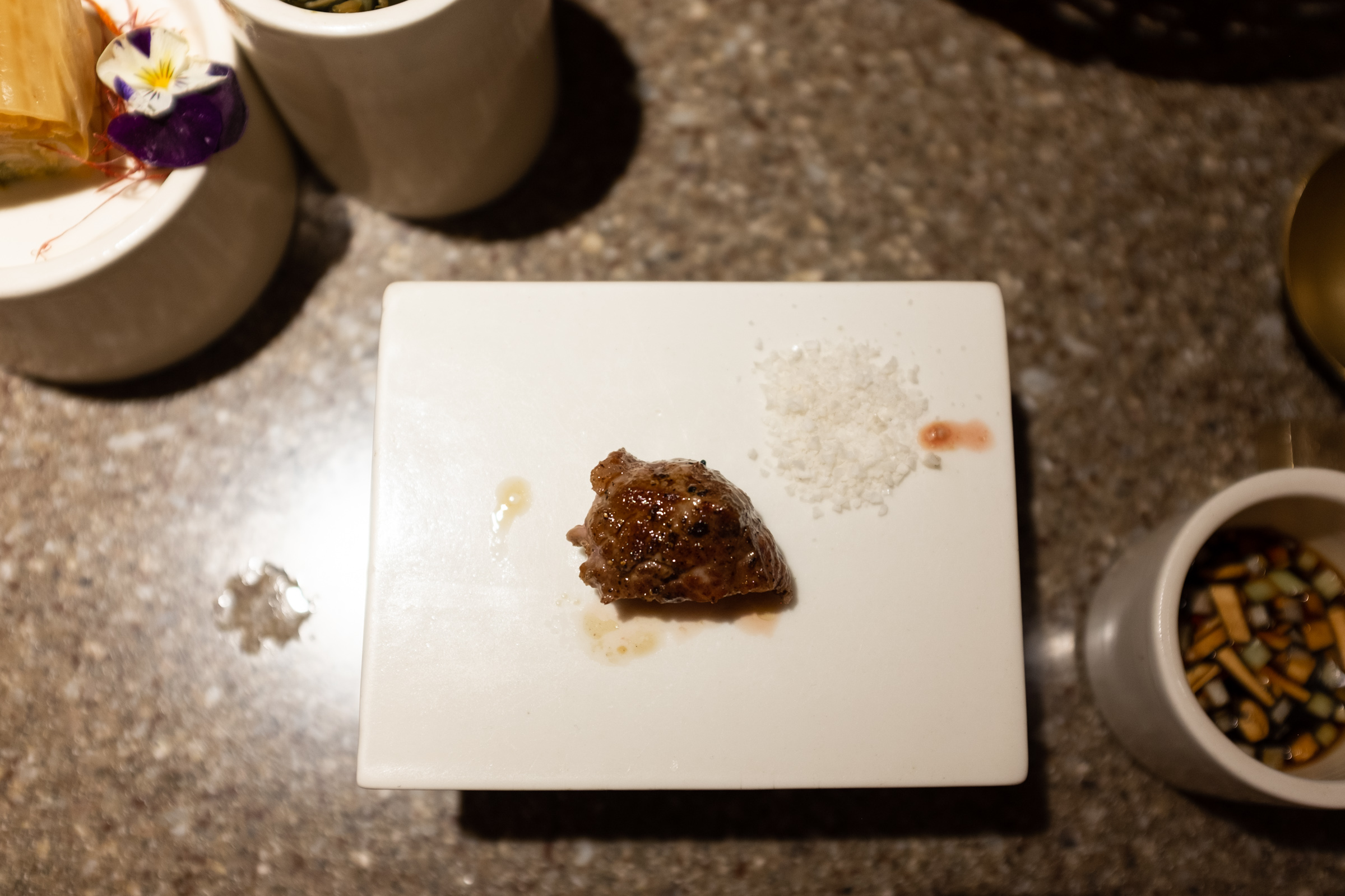 다녀온 지 오래돼 어느 부위고, 어떤 맛이었는지 기억이 나지 않습니다만, 첫 점이 녹듯 부드러웠던 건 확실합니다. 자리 앞의 작은 접시에 잘 구워진 고기와 소금을 올려주며 부위를 소개하면, 그 내용을 곱씹으며 고기를 씹는 방식입니다. 소금과 간장 소스가 있는데, 소스는 육향을 온전히 느끼고 싶을 때, 간장 소스는 이 집만의 맛을 느끼고 싶을 때 좋습니다.