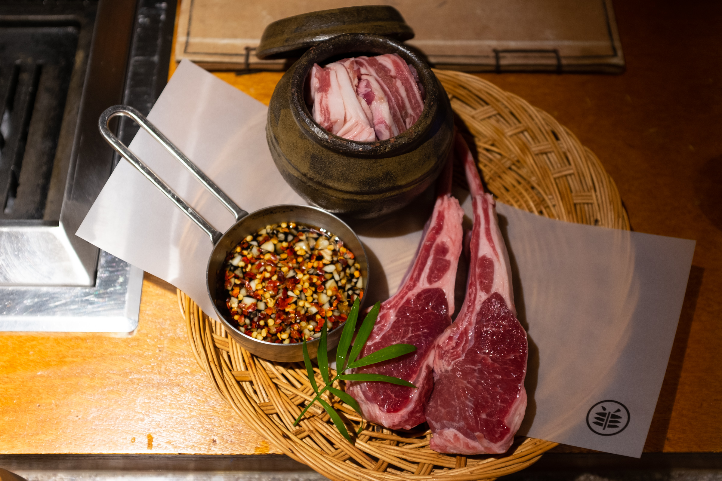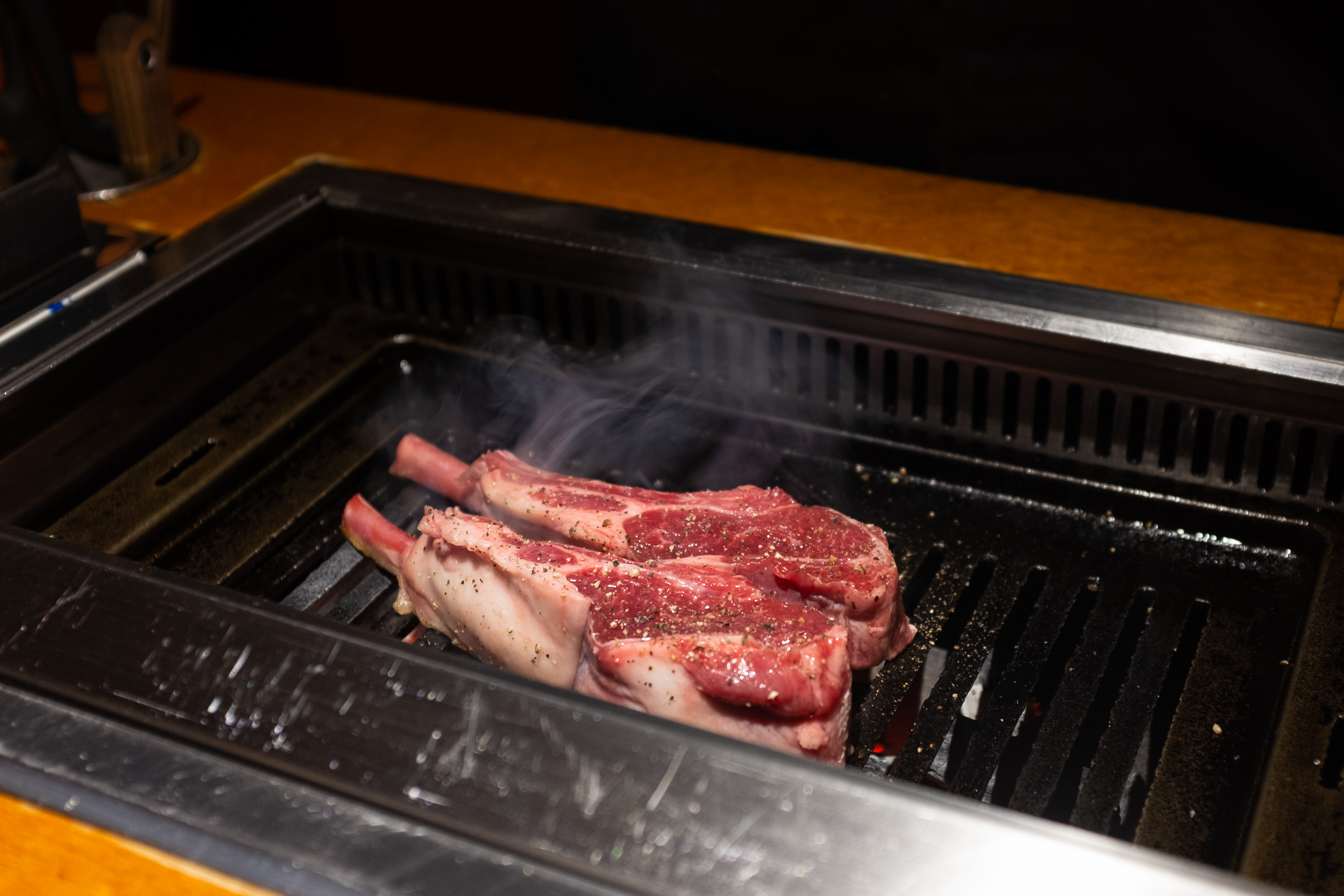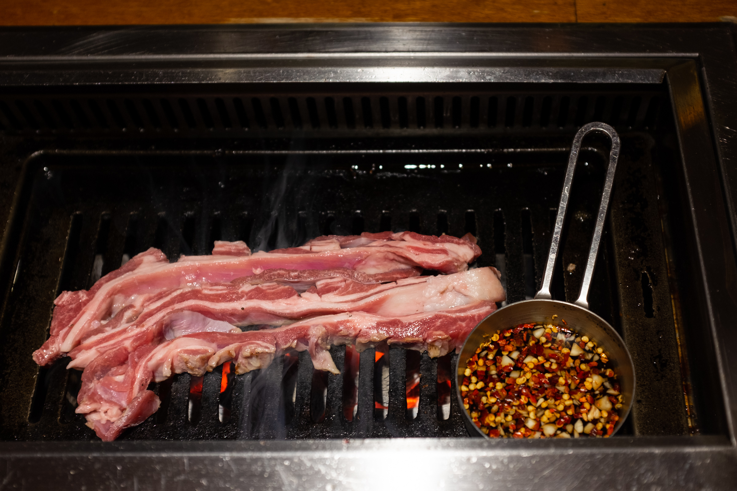 본격적인 구이의 시작은 양갈비입니다. 다른 집에선 양갈비를 마지막, 그러니까 하이라이트로 미뤄두는데 몇 번 다녀보니까 바로 맛있는 것부터 먹는 게 좋은 선택이더라고요. 첫 점의 행복을 극대화하는 거죠. 그리고 보통은 육향이 약한 부위로 시작해 점점 강한 쪽으로 가는 것을 추천하더군요. 양삼겹이 갈비보다 향이 더 강하다고 해서 갈비를 앞순서로 뒀습니다.