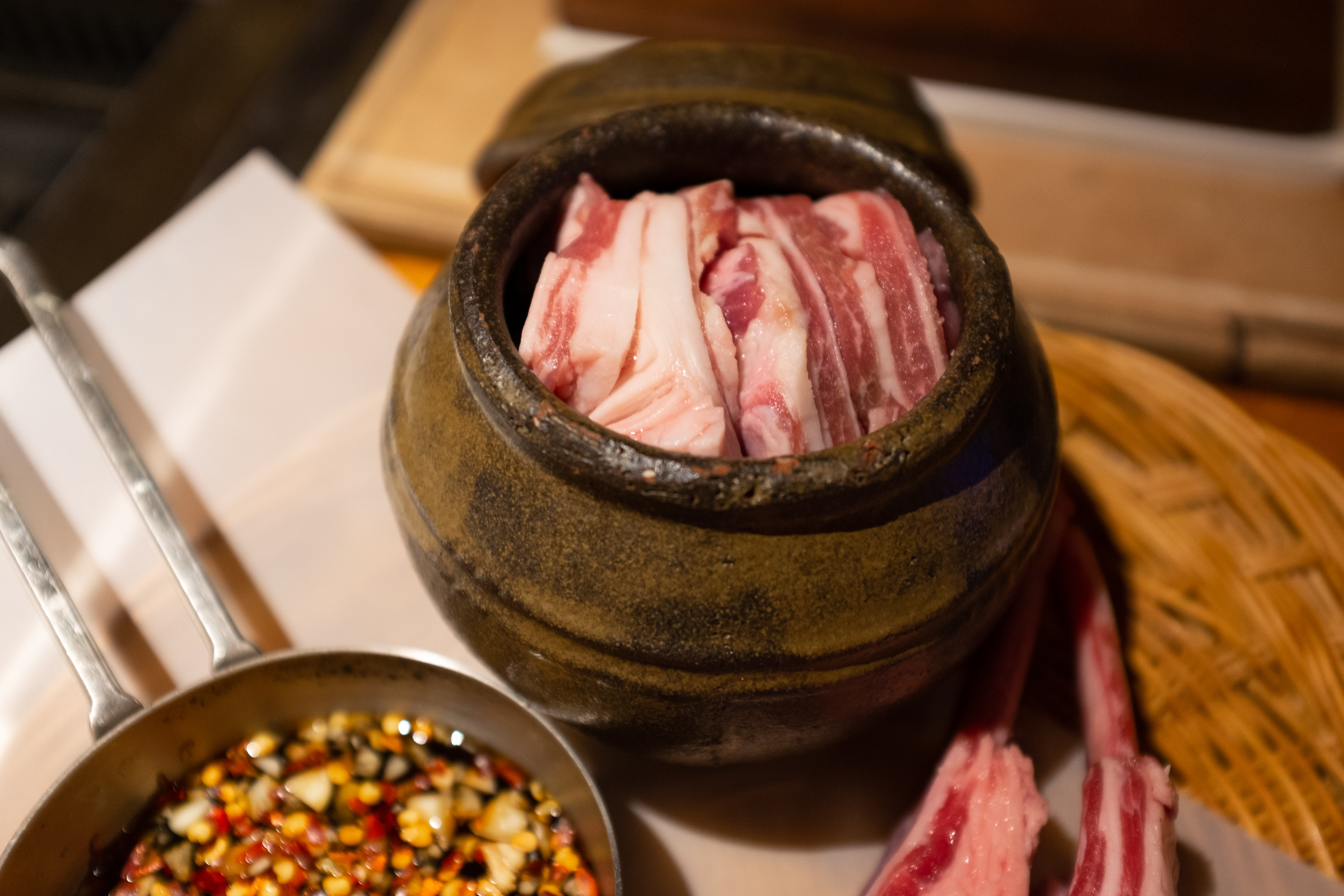 굽는 과정에서 지방이 녹으면서 크기가 줄고 쫄깃한 식감이 살아납니다. 고기를 간장 양념에 적셔 굽고, 마지막엔 끓인 소스를 고기에 부어 먹게 됩니다. 이미 알고 있는 소스 맛과 상상이 되지 않는 양삼겹의 조화가 궁금했어요.