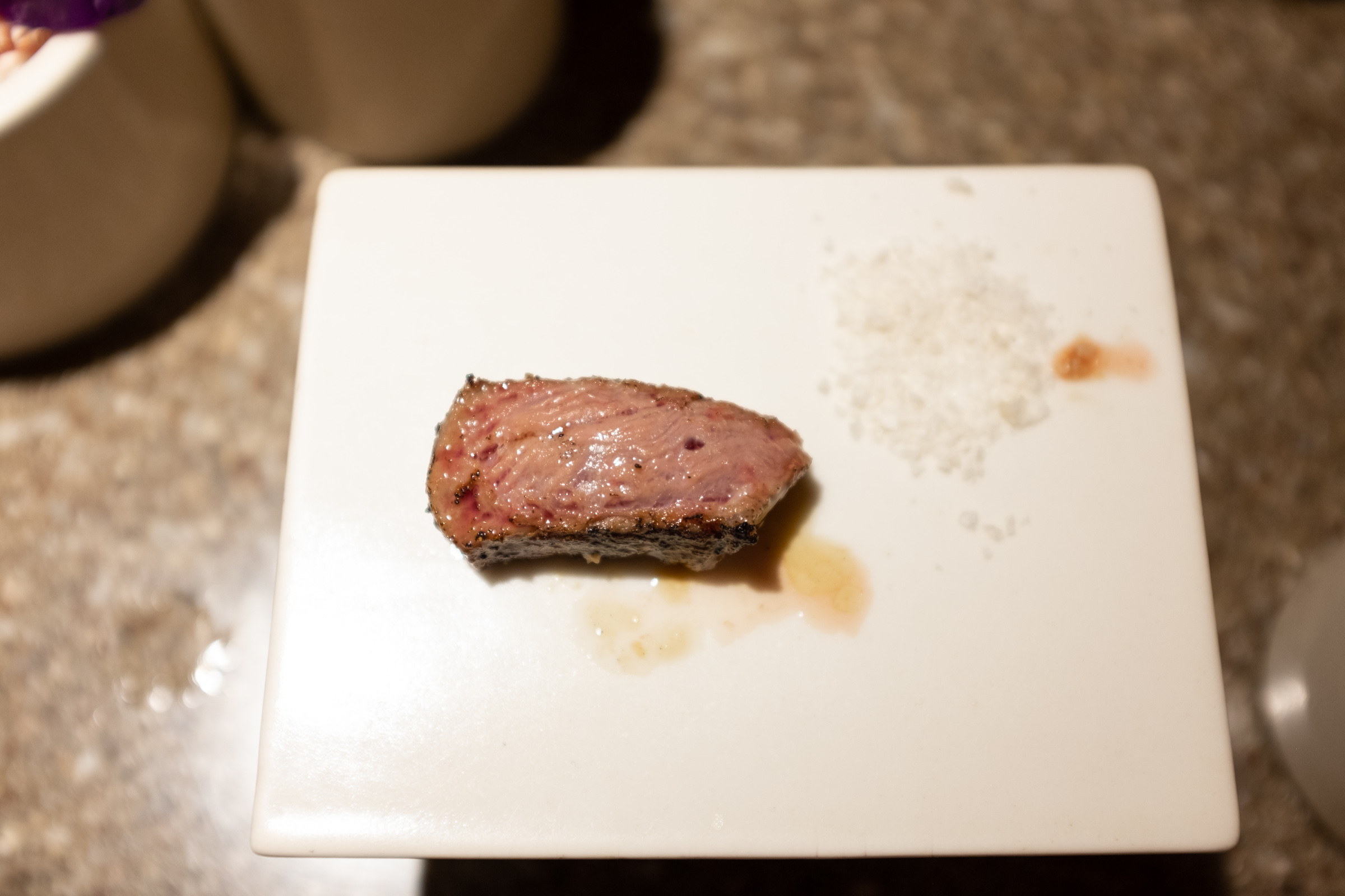 다녀온 지 오래돼 어느 부위고, 어떤 맛이었는지 기억이 나지 않습니다만, 첫 점이 녹듯 부드러웠던 건 확실합니다. 자리 앞의 작은 접시에 잘 구워진 고기와 소금을 올려주며 부위를 소개하면, 그 내용을 곱씹으며 고기를 씹는 방식입니다. 소금과 간장 소스가 있는데, 소스는 육향을 온전히 느끼고 싶을 때, 간장 소스는 이 집만의 맛을 느끼고 싶을 때 좋습니다.
