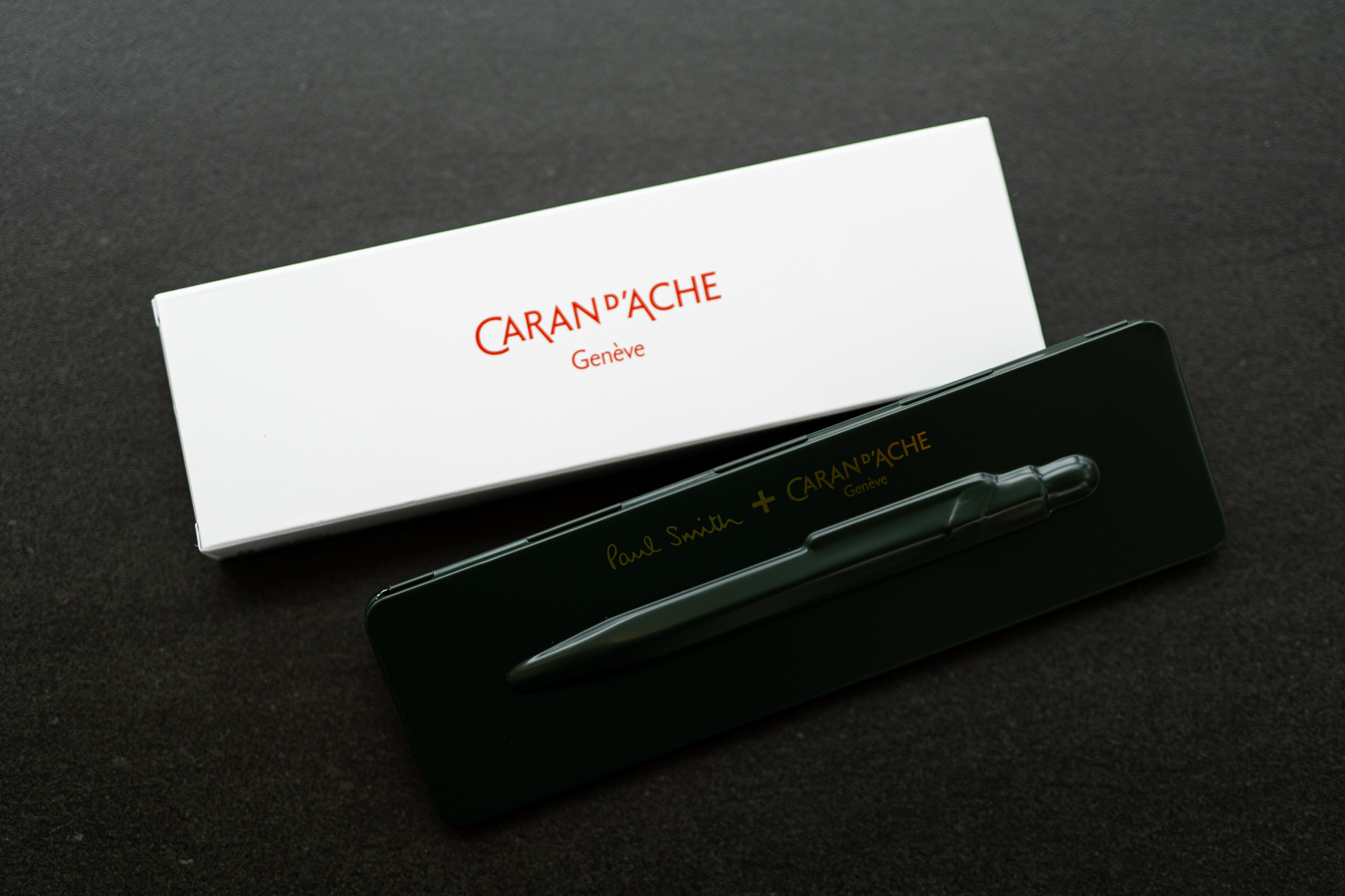 저는 가장 좋아하는 브리티시 그린 -레이싱 그린으로도 불리는- 컬러의 케이스를 고르고, 각인을 추가했습니다. 스스로에게 주는 이런 선물에는 각인을 하면 의미가 더해지잖아요. 케이스를 보는 순간 짙은 녹색과 두 회사의 문구, 그리고 양각으로 표현된 펜의 실루엣을 보고 진지하게 이걸 필통으로 휴대할까 고민했습니다.