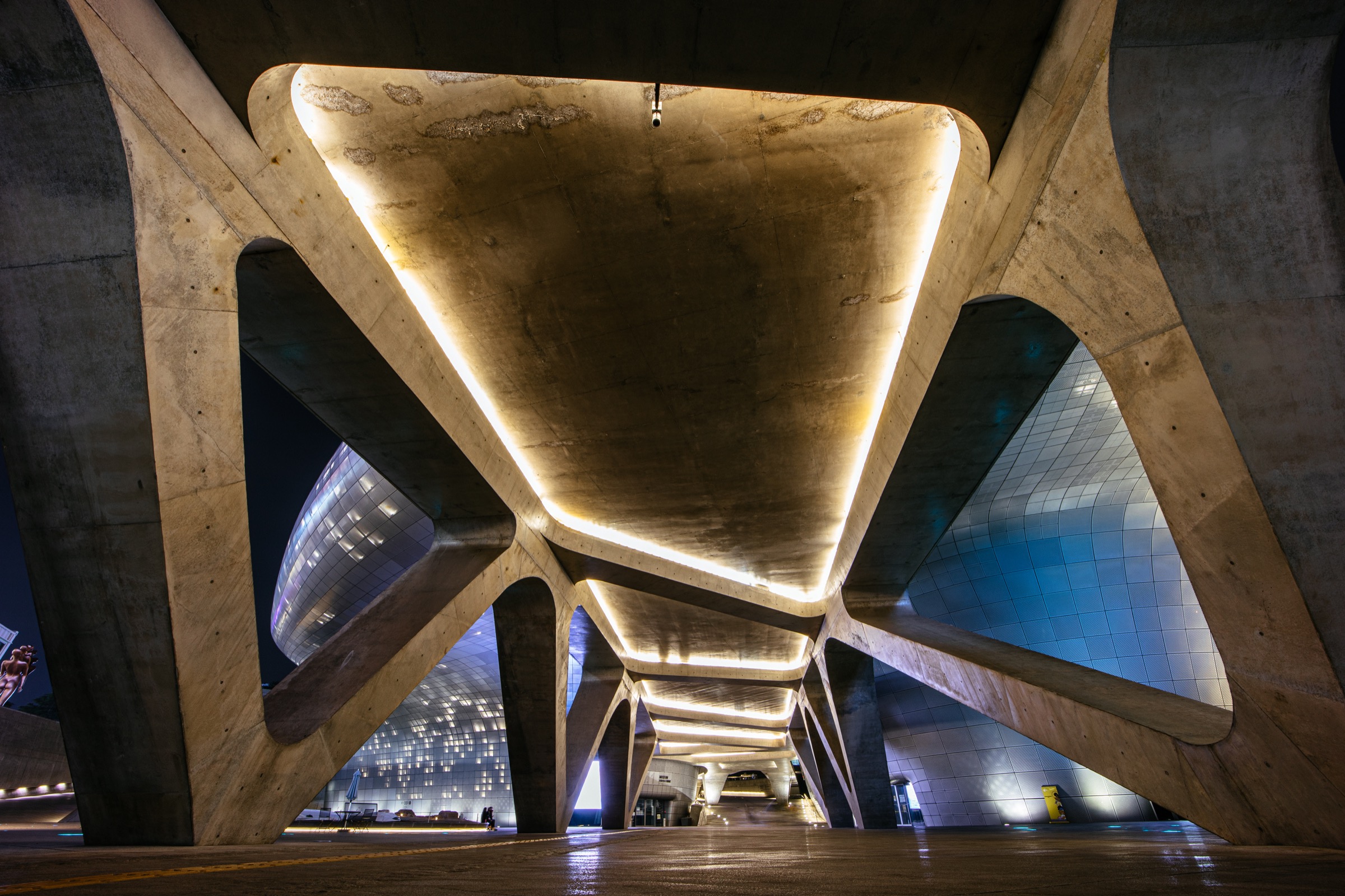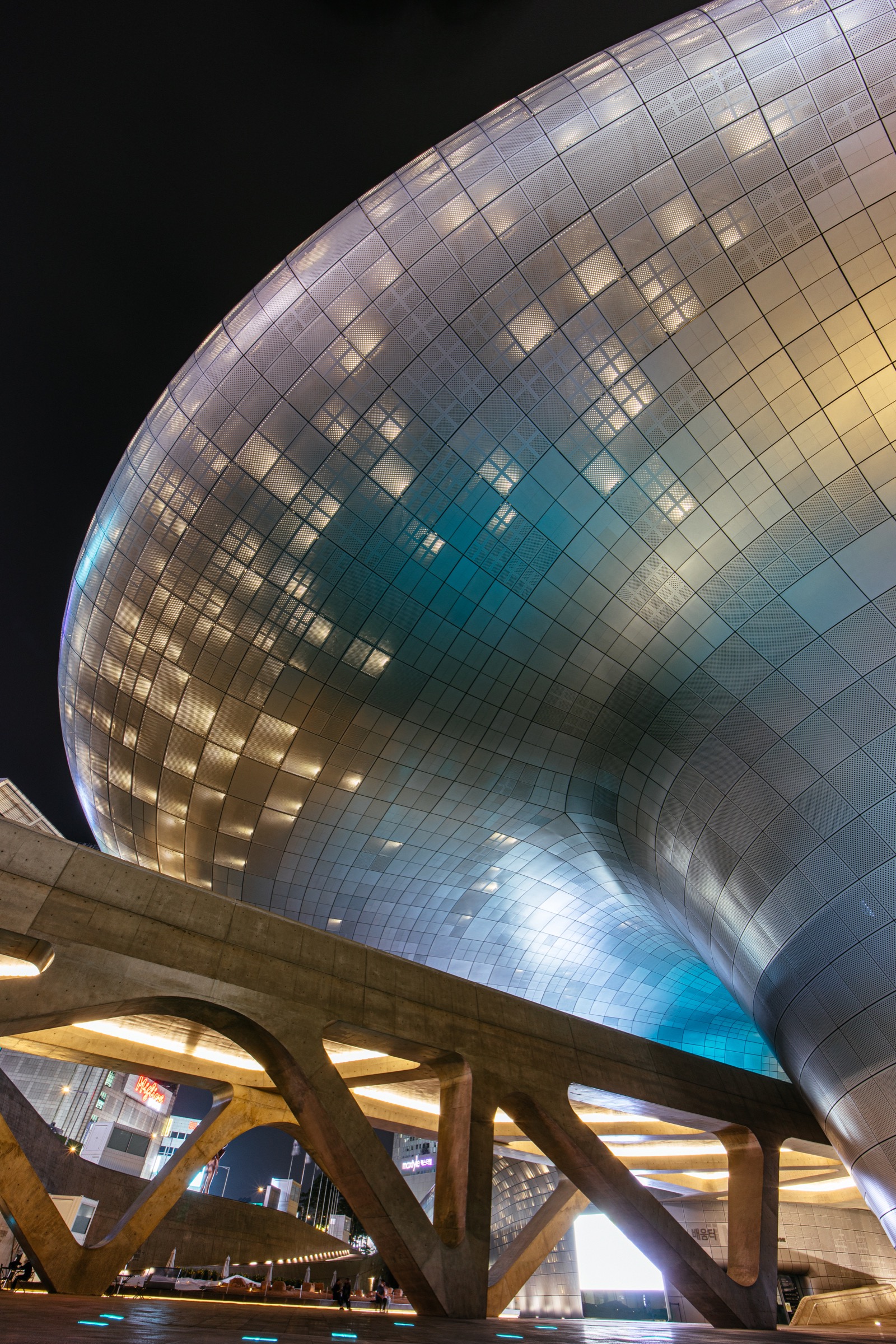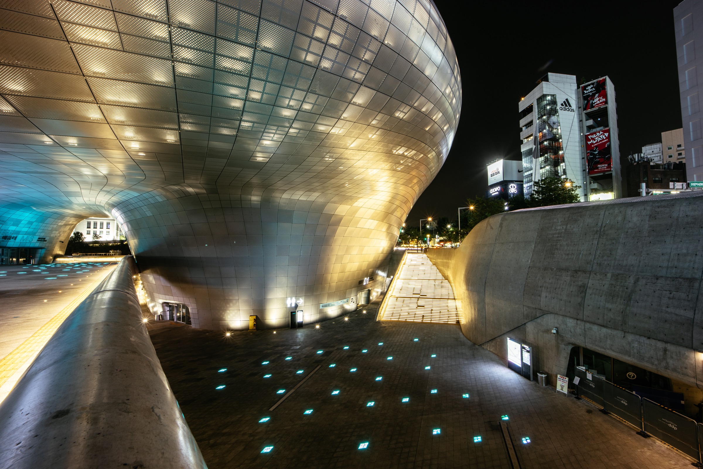 14mm 초광각의 매력은 풍경보다 오히려 이런 거대한 건축물을 찍을 때 도드라졌습니다. 표준-광각 렌즈로는 담을 수 없던 풍경이 프레임 안에 여유롭게 담기니 그 위력을 실감하게 되더군요. EOS R과 삼양 AF 14mm F2.8 RF 렌즈, 그리고 한 뼘 정도 길이의 미니 삼각대로 단촐한 구성이었지만 24mm 렌즈로 담을 수 없는 DDP 전경을 한 장에 다 담을 수 있었습니다. 건축물이 아름다운 유럽 여행에 초광각 렌즈가 필수라는 이야기를 많이 들었는데, 그간 애써 무시하며 여행했지만 경험해보니 인정하게 됩니다. 물론 주변부 왜곡에 대한 호불호가 갈리겠지만요.