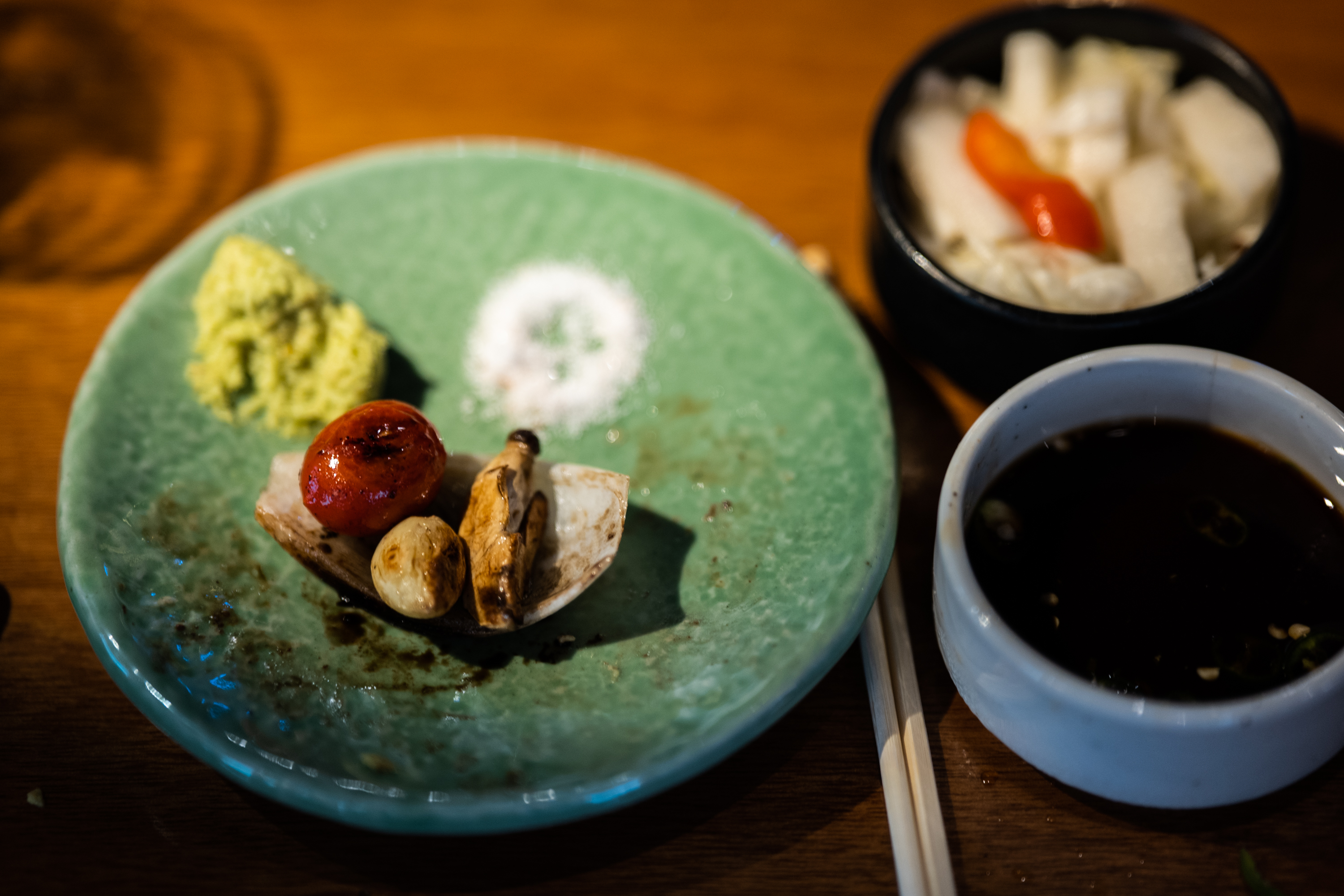 그릇부터 소금과 고추냉이 올린 모양, 땅콩으로 젓가락 받침을 한 것까지 테이블 세팅이 참 예쁩니다. 일본에서 땅콩을 다양하게 활용하는 것이 인상적이었는데 여기서 또 보네요.