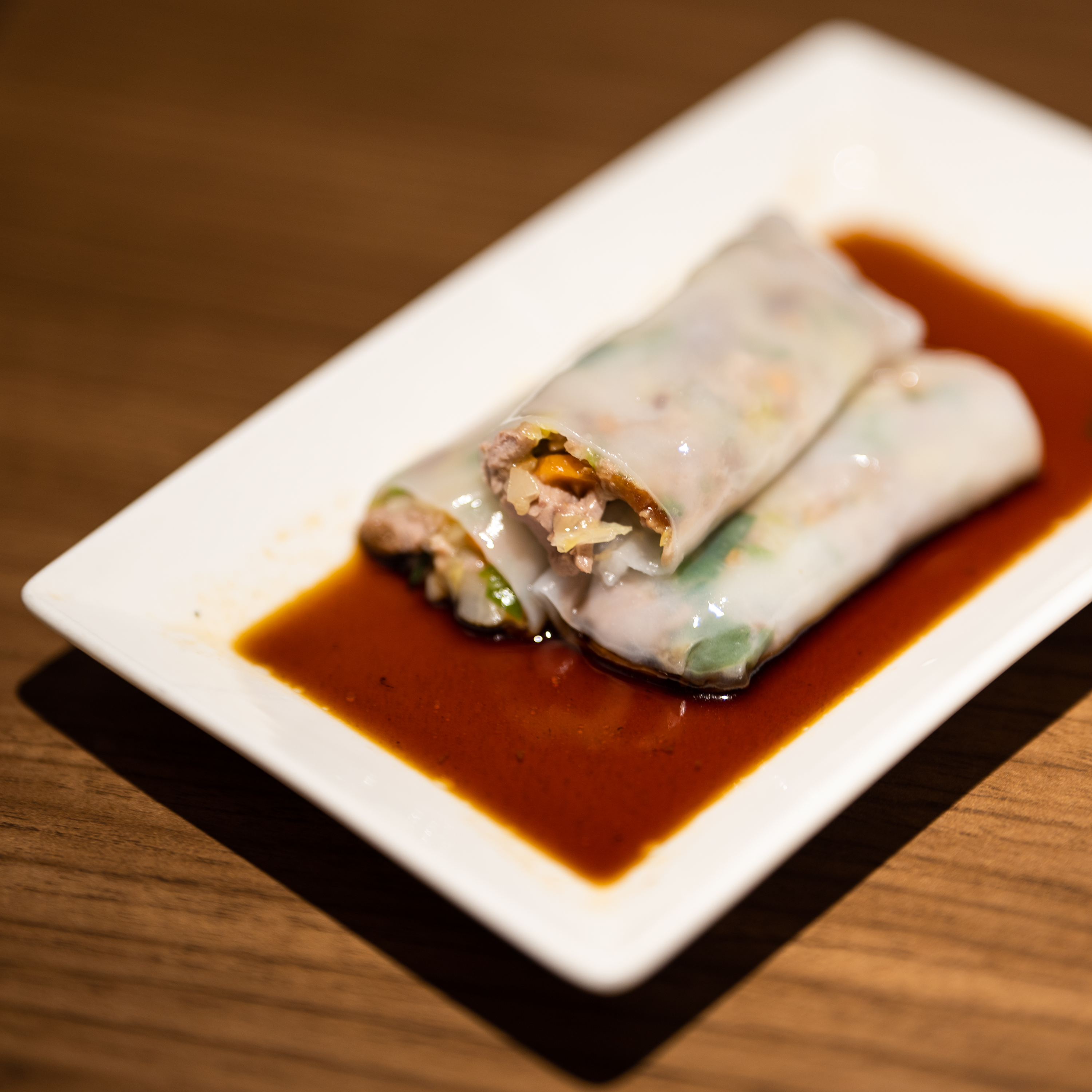 이대로 뭔가 아쉽다 싶어 주문한 돼지고기 창펀. 흡사 마포 갈비만두같은 비주얼인데, 돼지고기가 든 소를 쫄깃한 피에 감싸 소스와 함께 먹는 메뉴입니다. 하가우같은 가벼운 딤섬이라기보단 탕면과 함께 곁들이기 좋아 보이더군요. 하가우도 그랬지만 이 집의 쫄깃한 만두피는 어느 속재료와도 잘 어울리는 것 같아요.